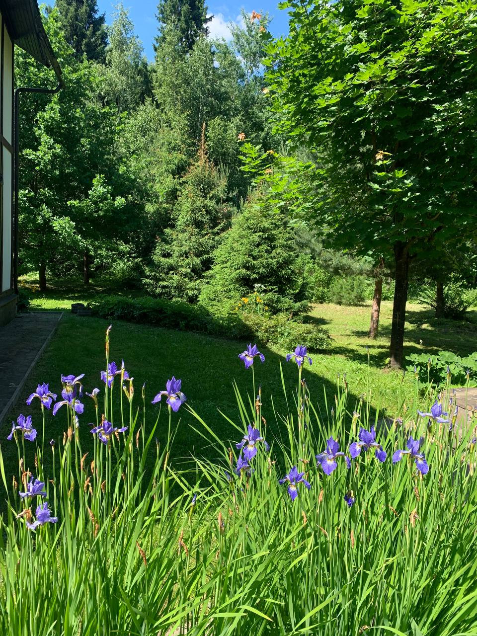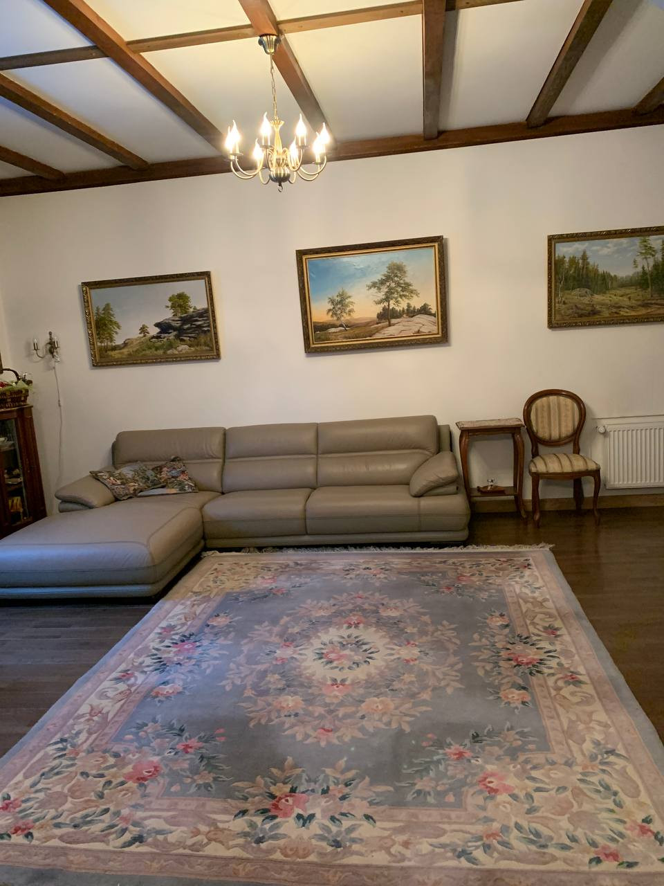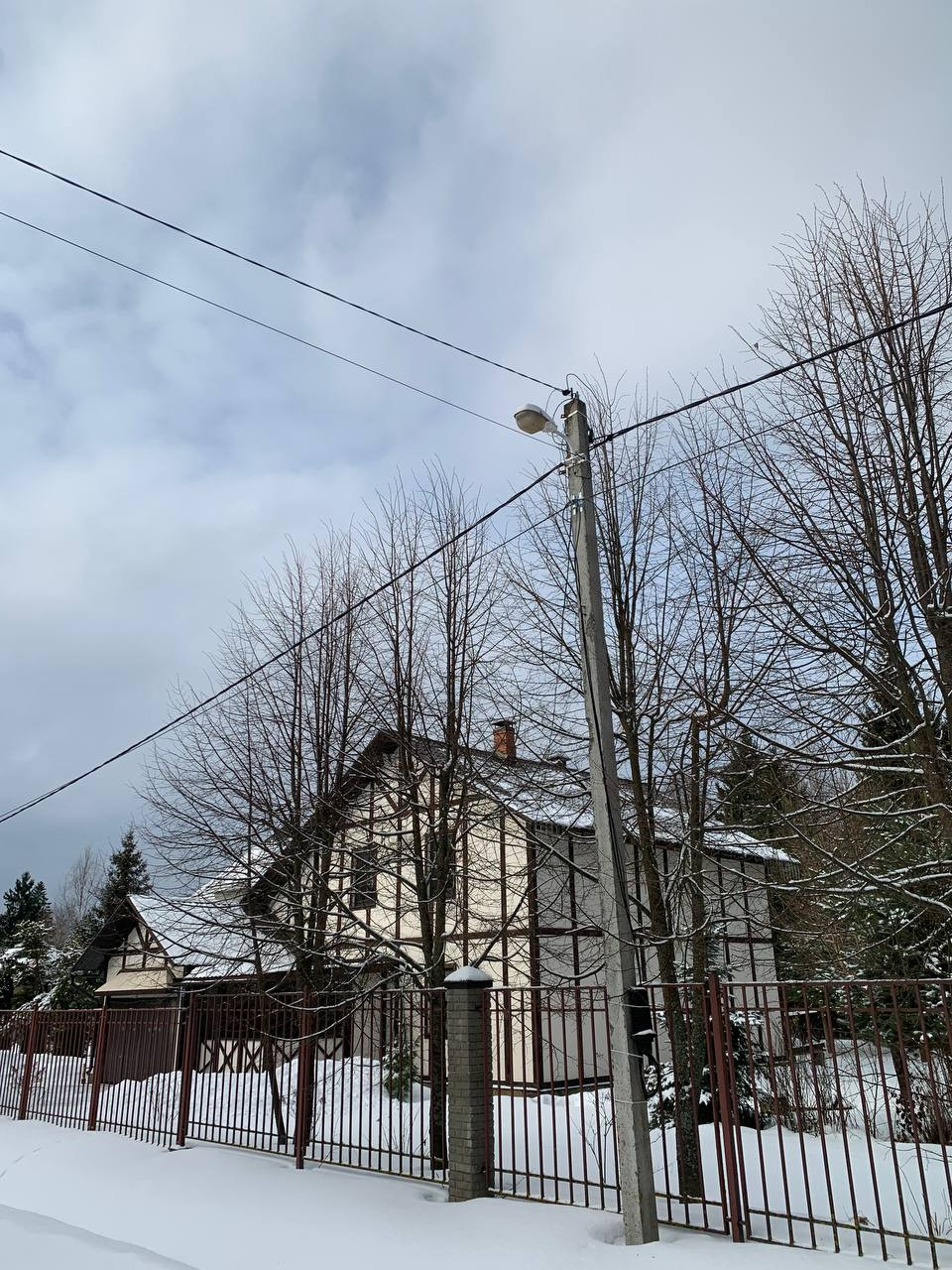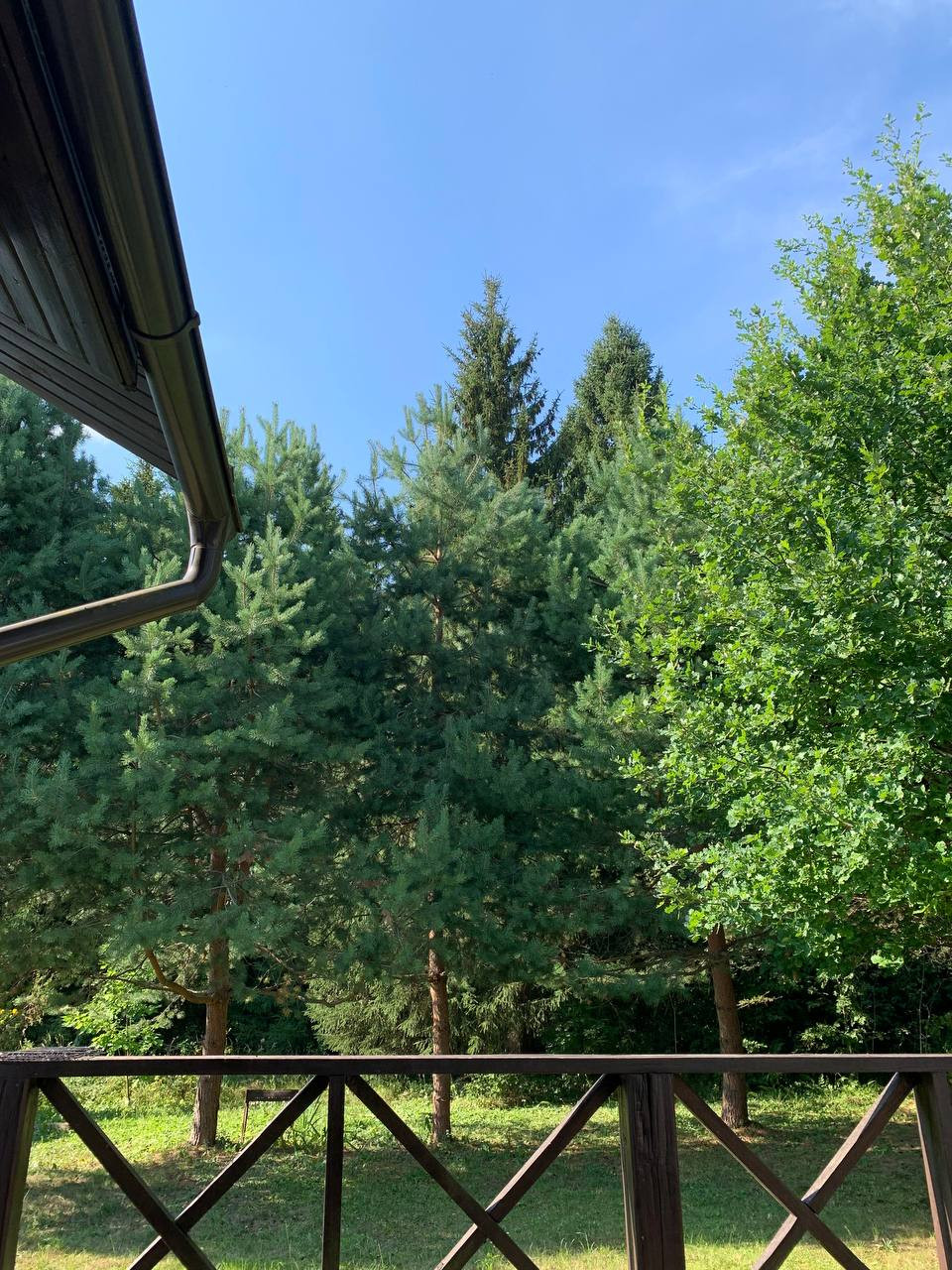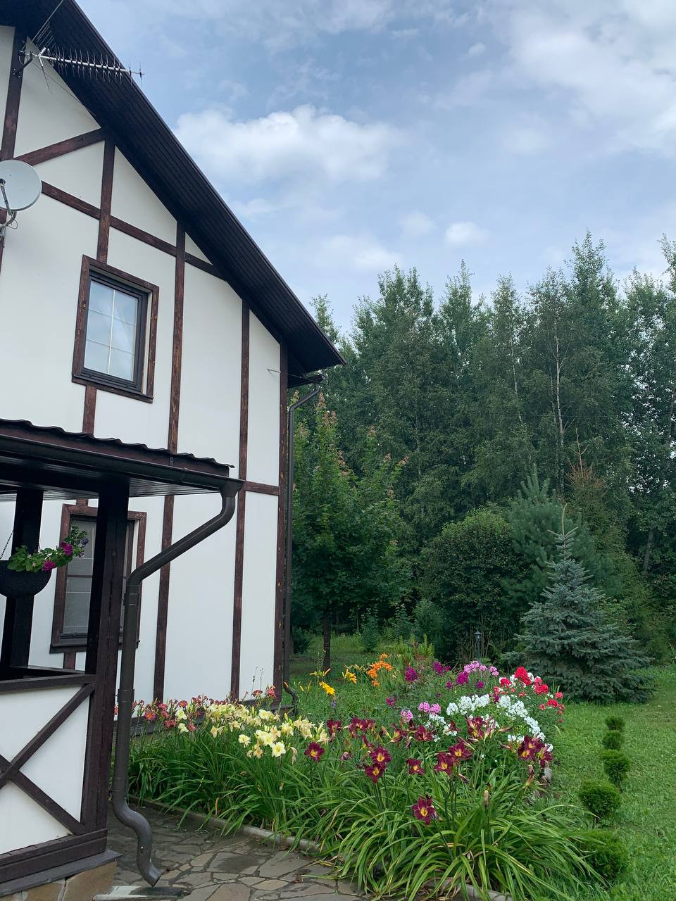 Деревянный дом в стиле шале "фахверк" на очень красивом участке с крупными лесными деревьями (ели, сосны, дубы, липы). В доме все необходимые коммуникации для круглогодичного проживания: Котел Viessmann, электричество, водопровод, септик, 3 санузла. Гараж для автомобиля и техники. На заднем дворе дома большая веранда с выходом в лес.