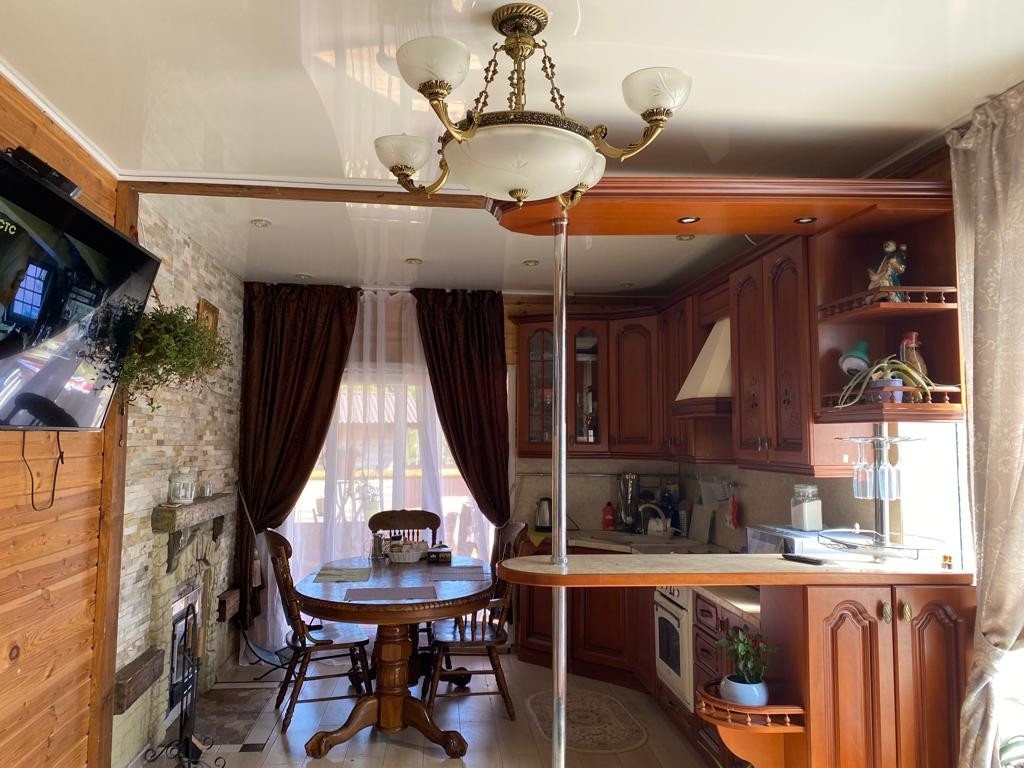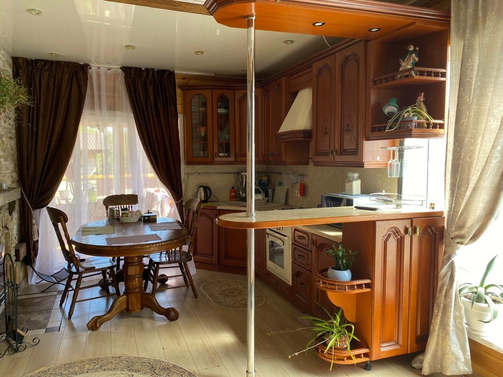 Дом построен из экологических материалов: брус, в интерьере лиственница,  баня отделана липой. Фасад дома обшит лиственница. Отопление дома электрический тёплый пол и конечно камин.  Водоснабжение-скважина,  но есть возможность подключения центрального водопровода  (техническиеусловия и документация имеются). Газ проходит по меже участка,  в дом не заведён.  Свет 15 кВт. Участок поднят на 1 метр, не топит совсем,  так как всё делали по технической документации. По периметру усастока монолитный забор,  проф. лист. Фасад забора: натуральная лиственница и дикий камень. Дом расположен в тихом месте, дорога к дому асфальтированная.