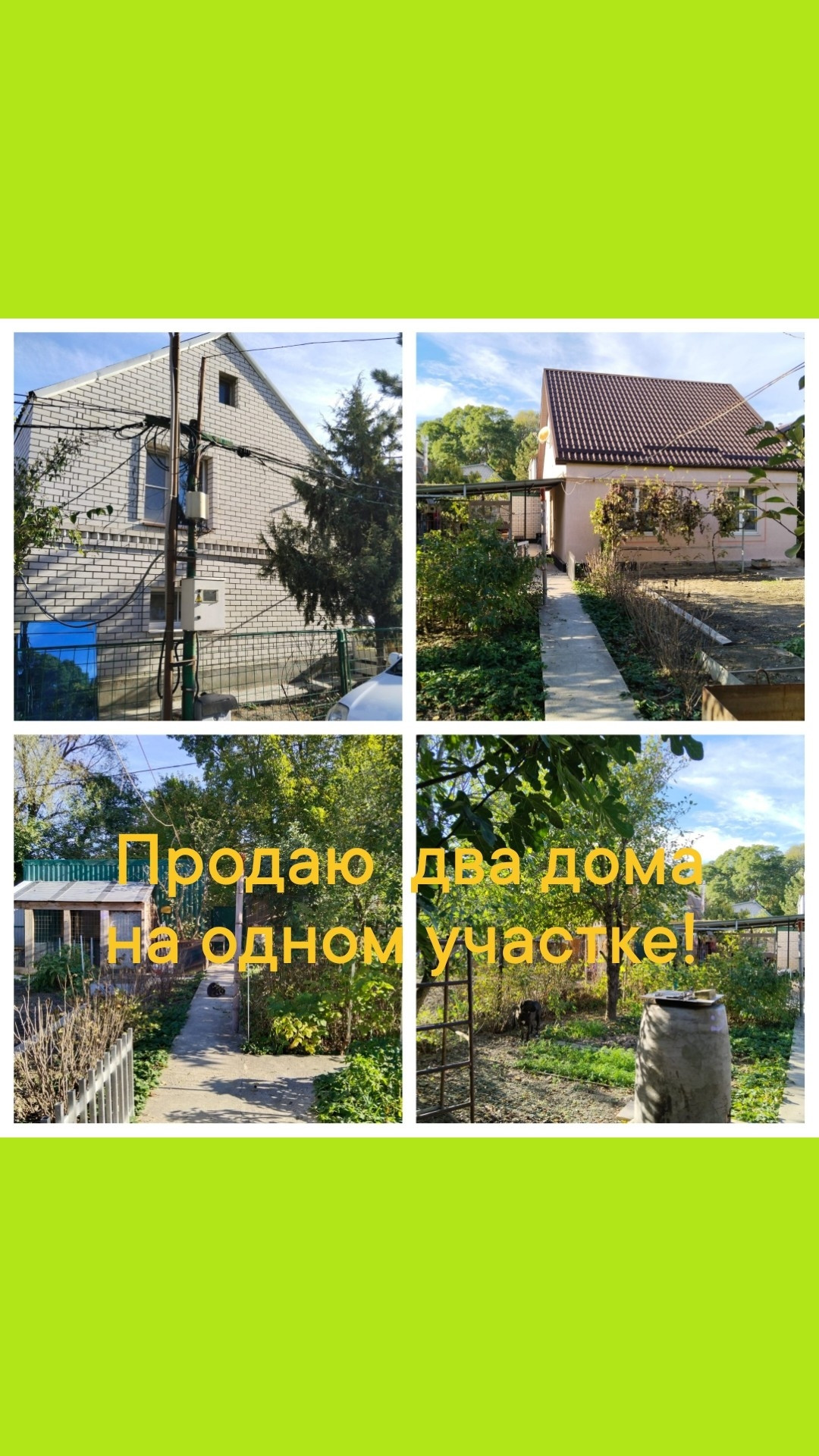 Продаем 2 готовых, жилых, капитальных дома на одном участке. Газифицированы, вода центральная, есть и скважина. Ухоженный сад, огород: виноград, хурма, инжир, перец, баклажаны, помидоры, сажайте, что душе угодно.