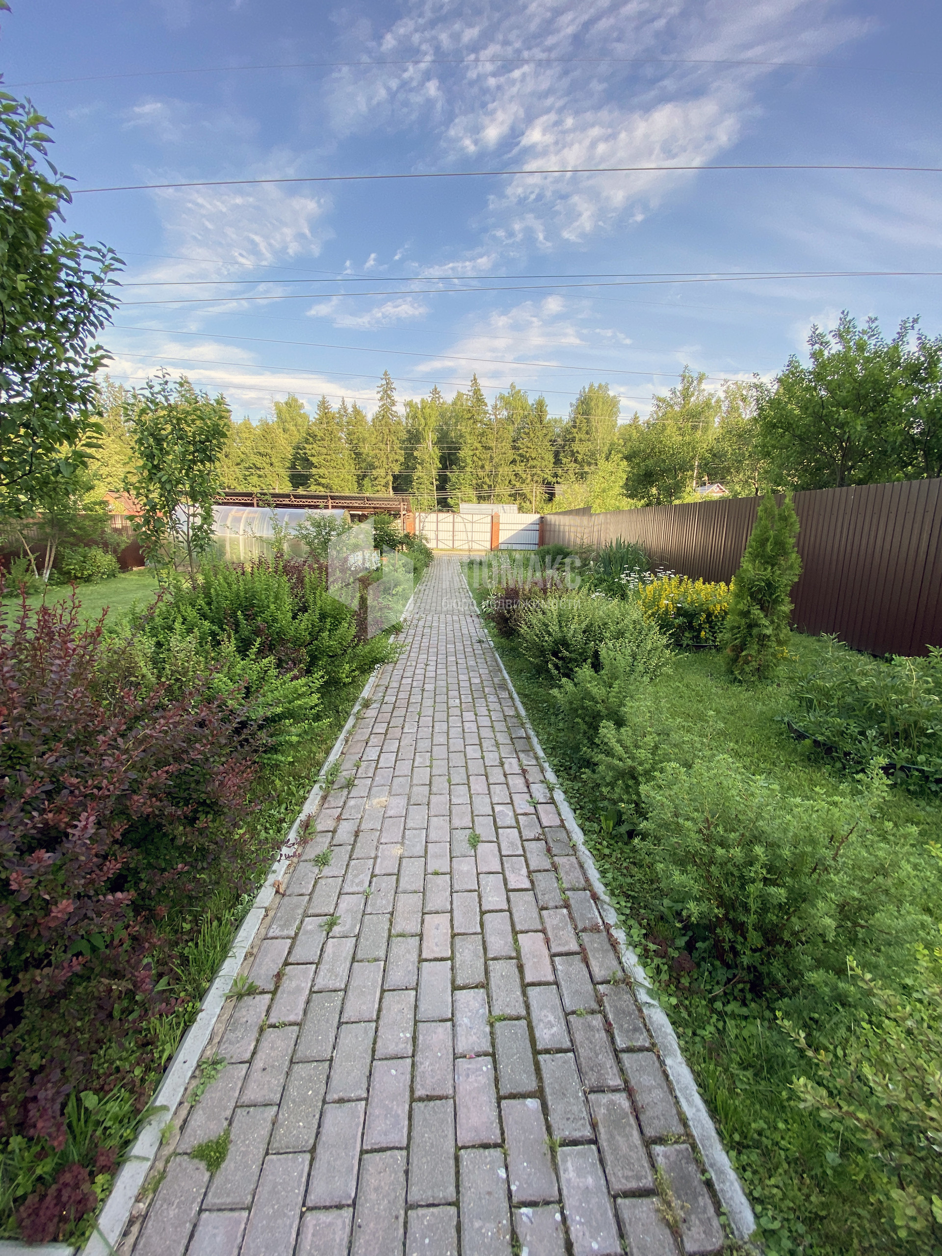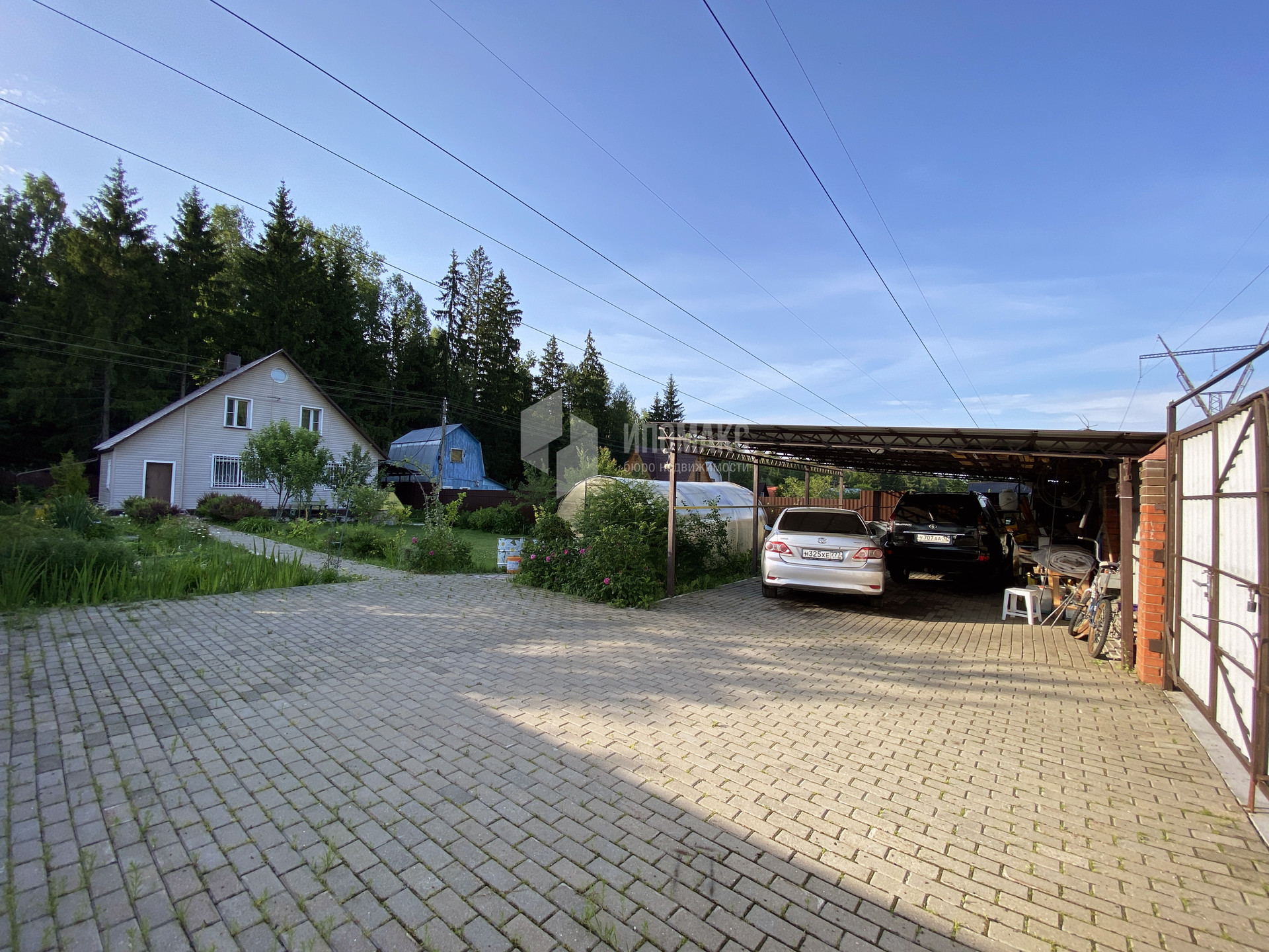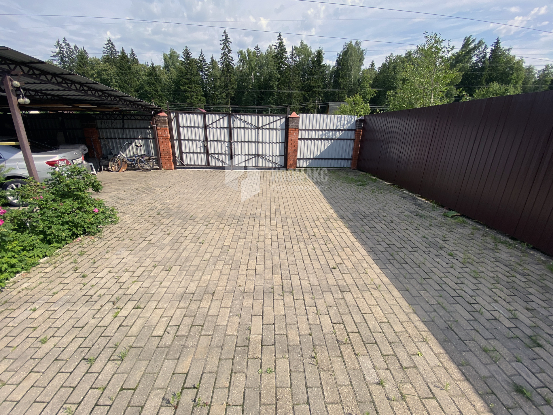 Построен навес на 2 автомобиля с мастерской, распашные ворота, парковочные места и дорожки на участке выложены брусчаткой.