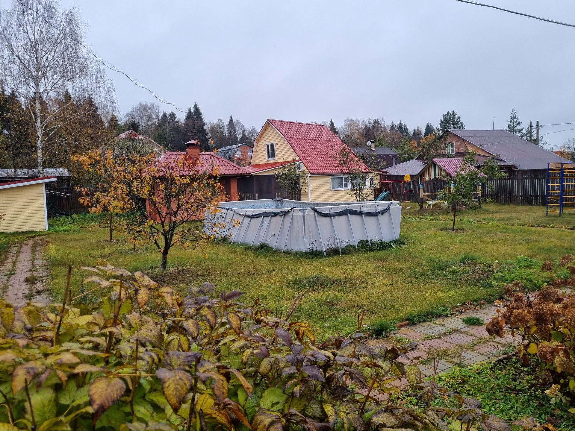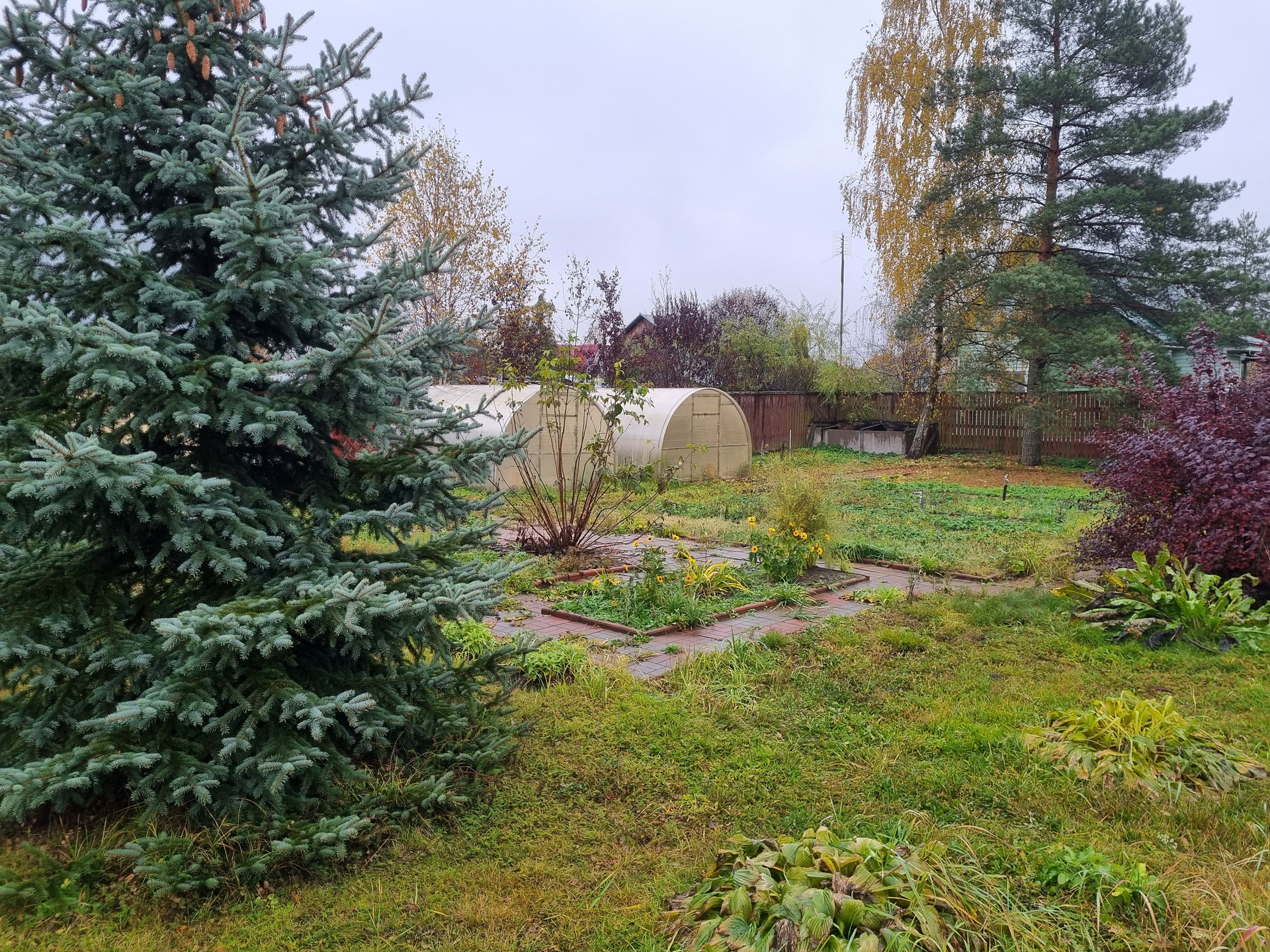 - на участке очень гармонично растут как плодово ягодные деревья так и голубые ели, березы;