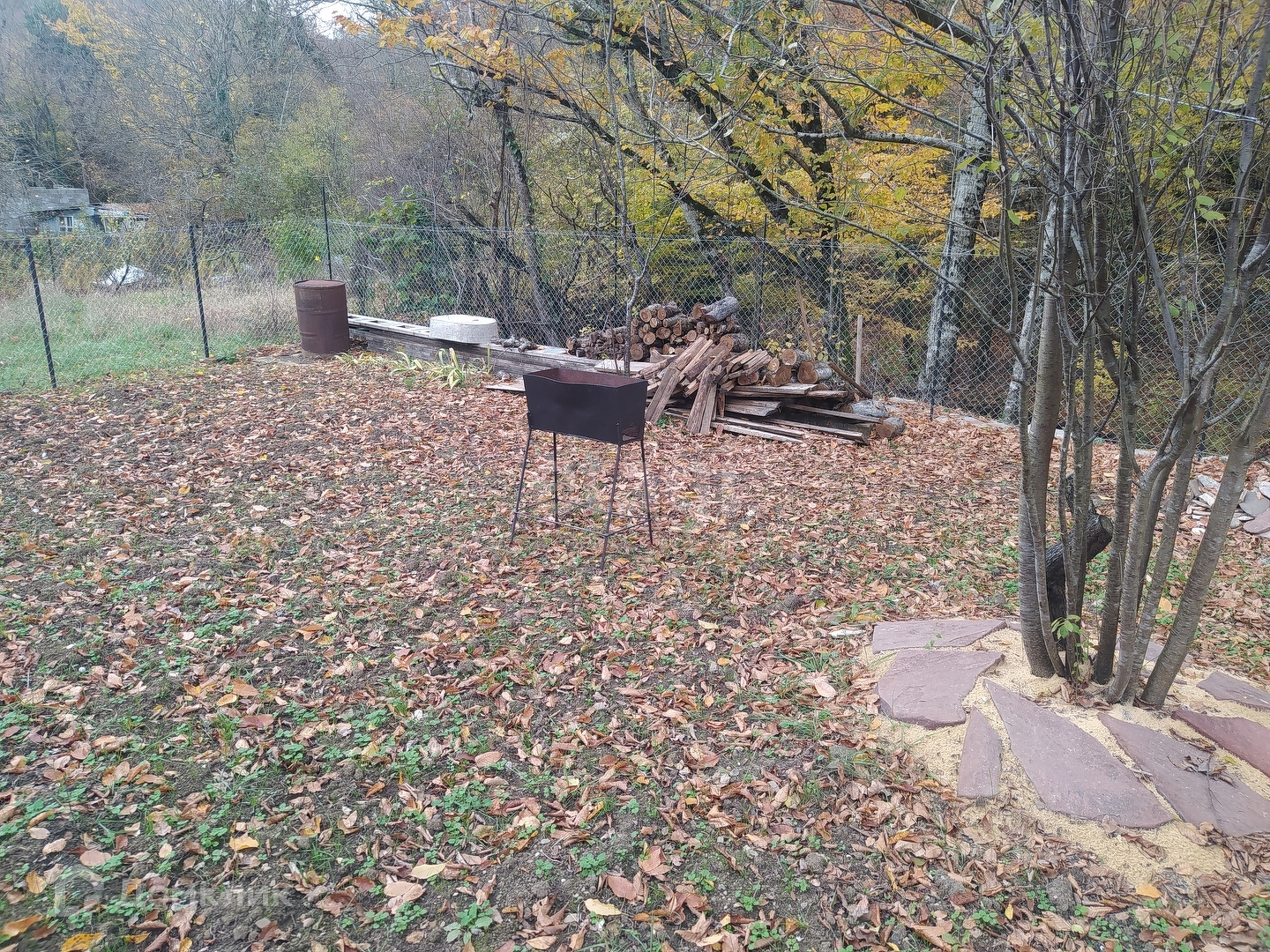 На участке имеется баня, скважина, септик. Электричество заведено в дом. Участок разработан, имеются различные плодовые деревья. Задняя часть участка примыкает к ручью и лесу, поэтому соседи только с двух сторон.