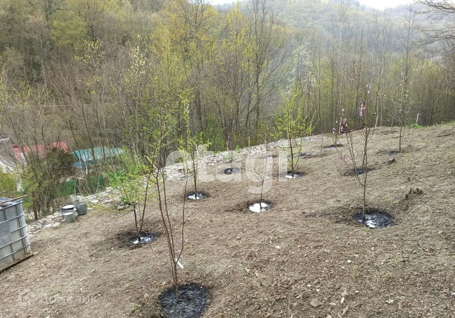 На участке - небольшой домик, пригодный для проживания (сан. узла в доме нет), посажен молодой уже плодоносящий сад, имеется колодец с насосом. Участок облагорожен.