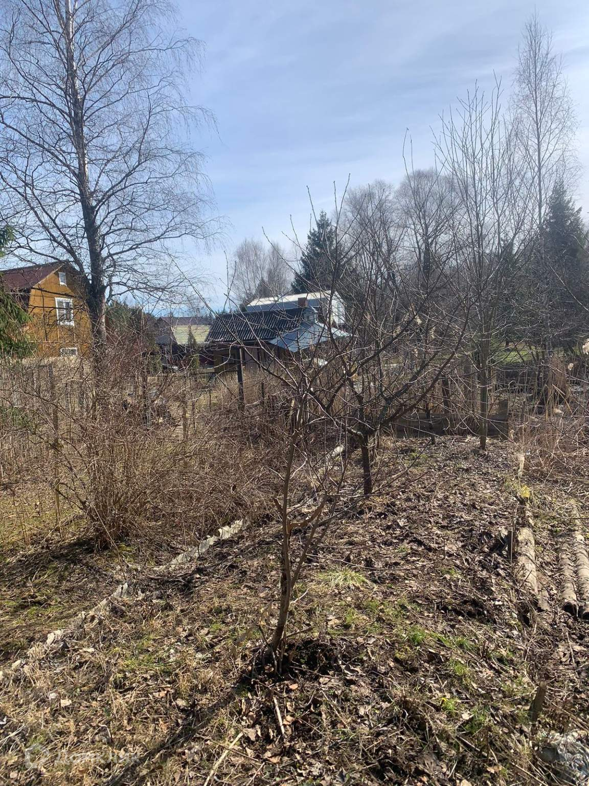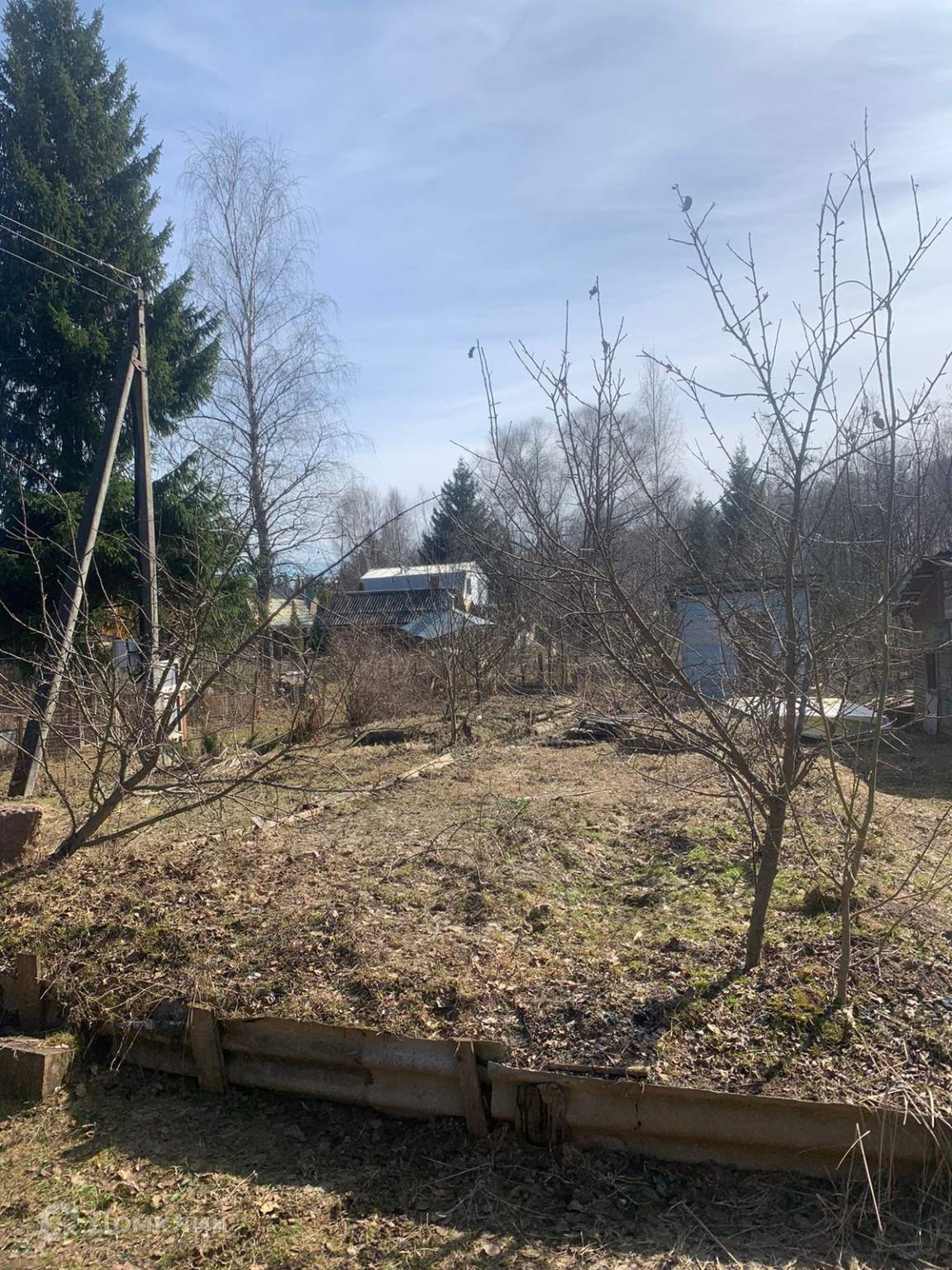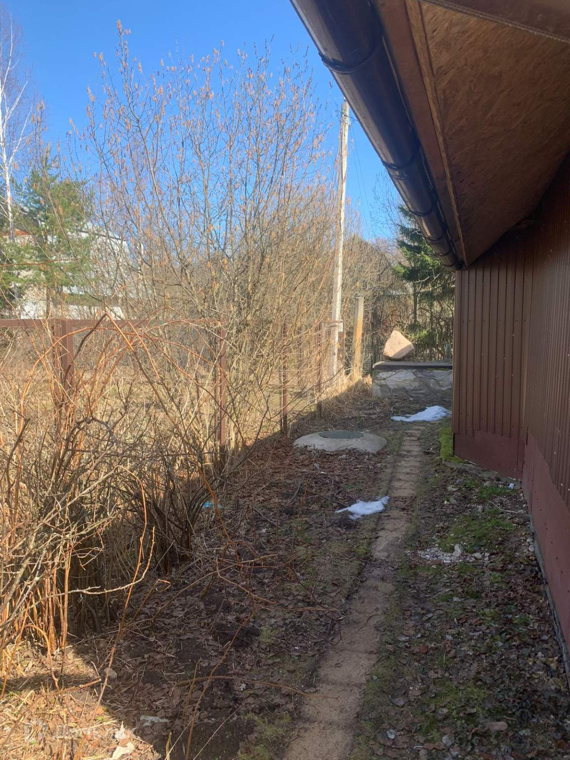 На участке: сарай, деревья (яблони, слива, пихта, многолетние цветы).