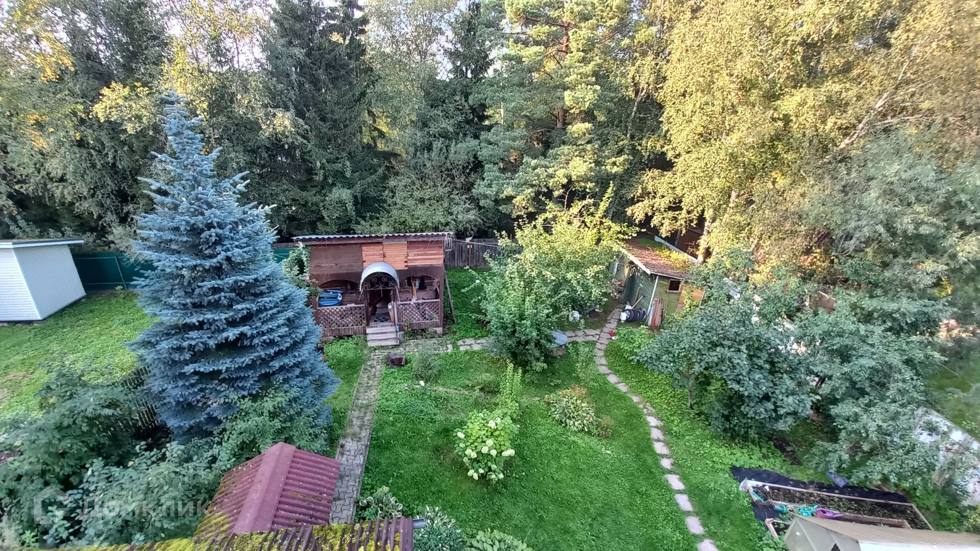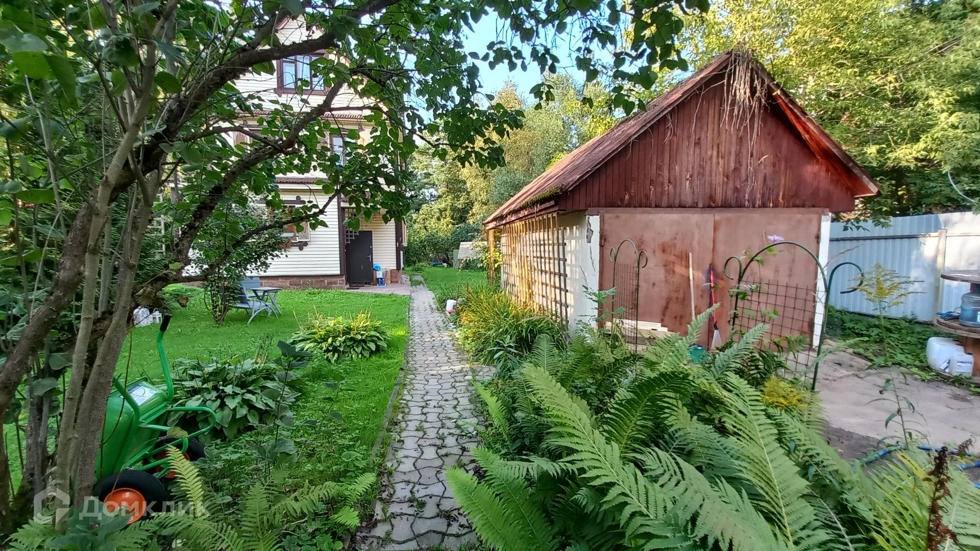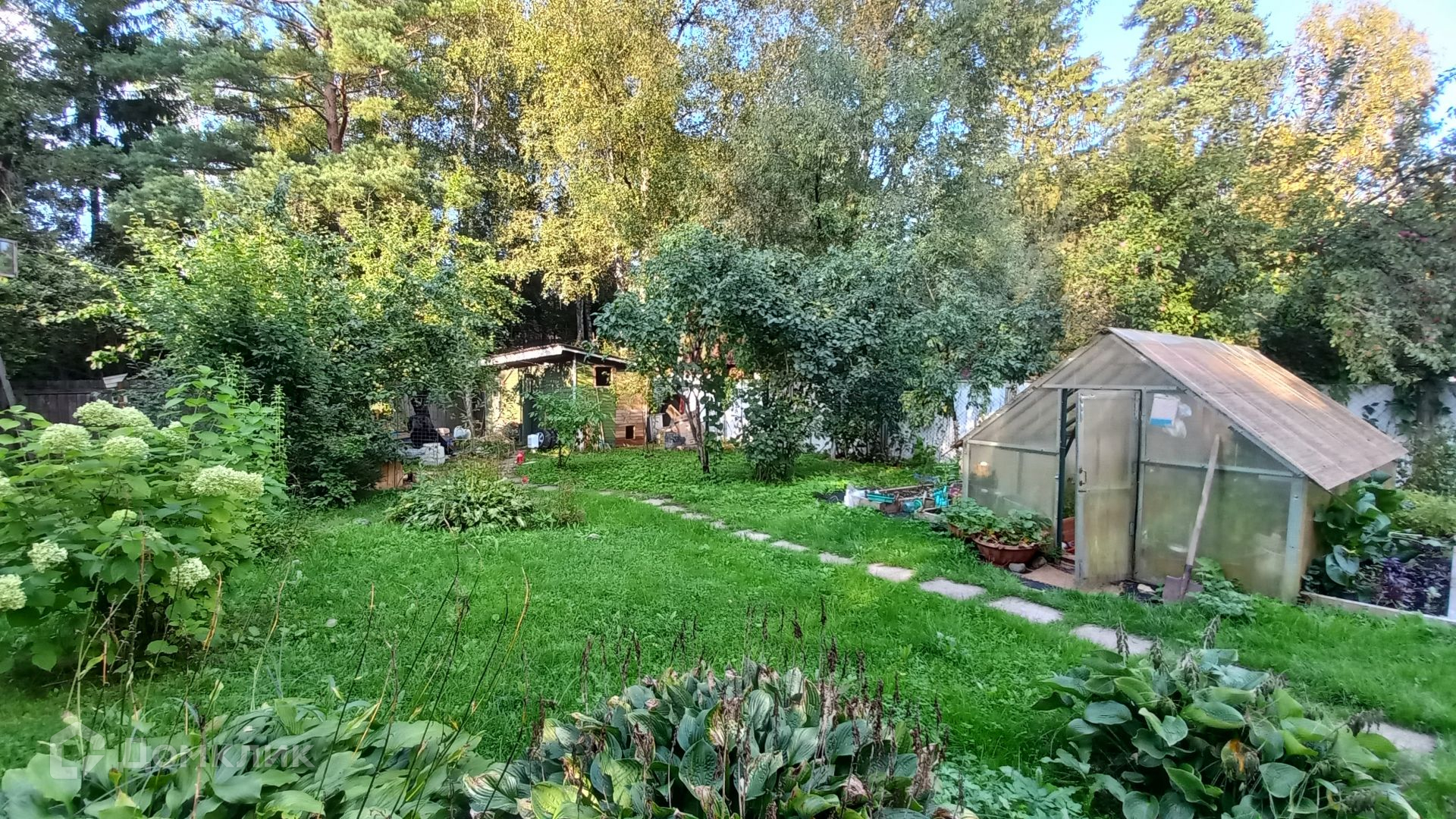 Площадь участка составляет 9,2 сотки. Участок ровный, огорожен по всему периметру, зеленый, на участке растут плодовые деревья, жимолость, ягоды, кустарники. Так же на участке расположен гараж, летняя кухня и хозблок.