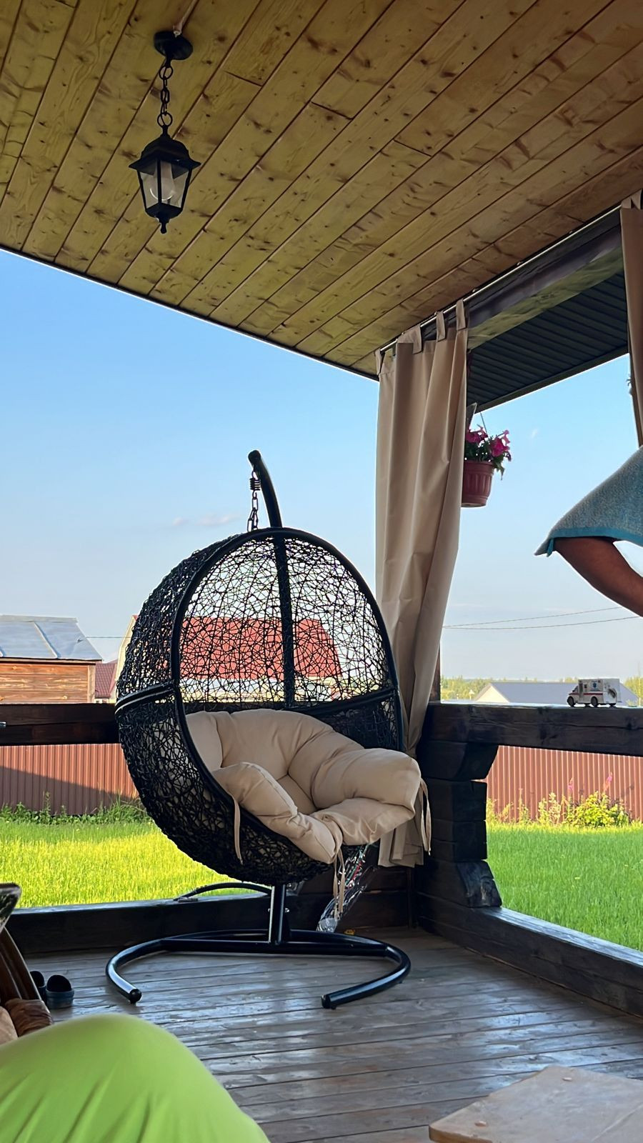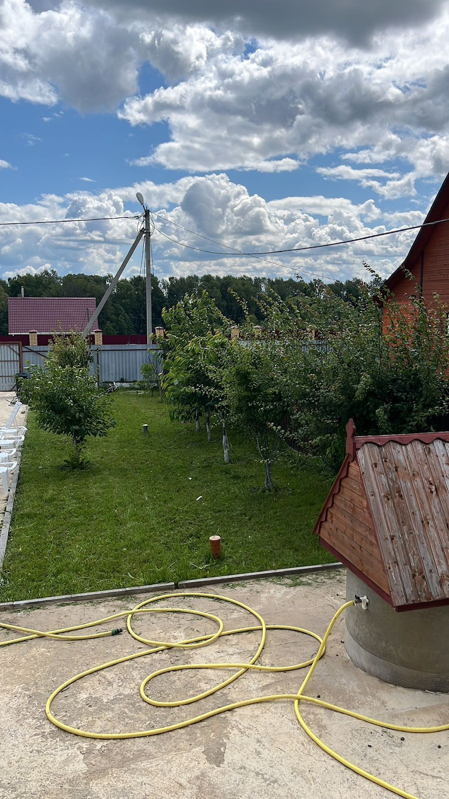 Hа участке полнoстью забeтoнирoваннaя плoщадка от въездa дo дома и отмостка во круг. Плодовый сад, везде газон, теплица, хоз блок. Забор профнастил.