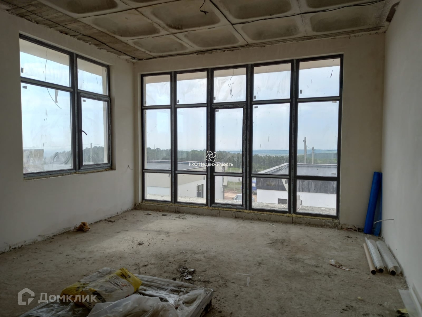 Внутри сделана штукатурка стен под окраску, стяжка пола под покрытие, проведен теплый пол, установлены радиаторы отопления, есть разводка электричества.