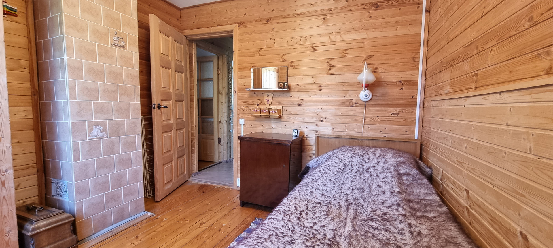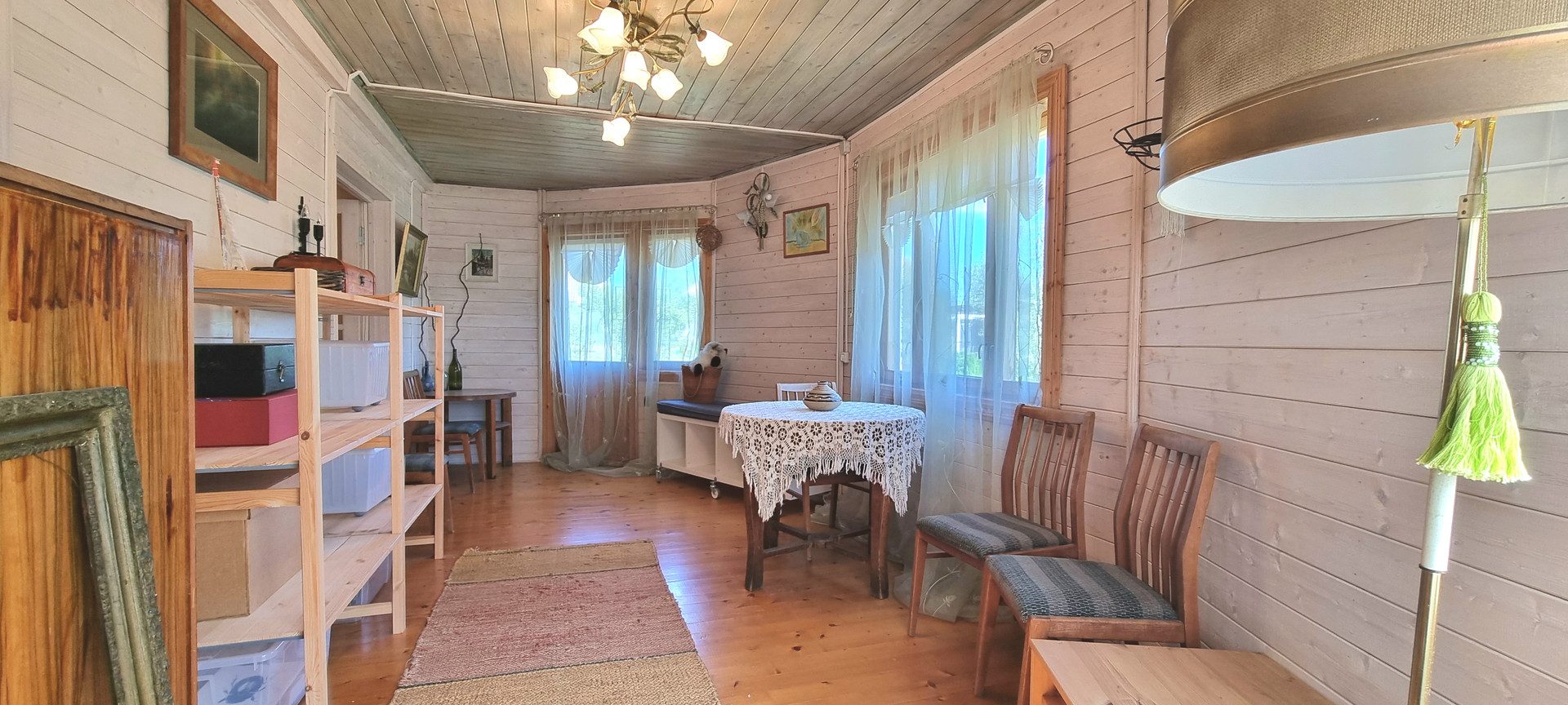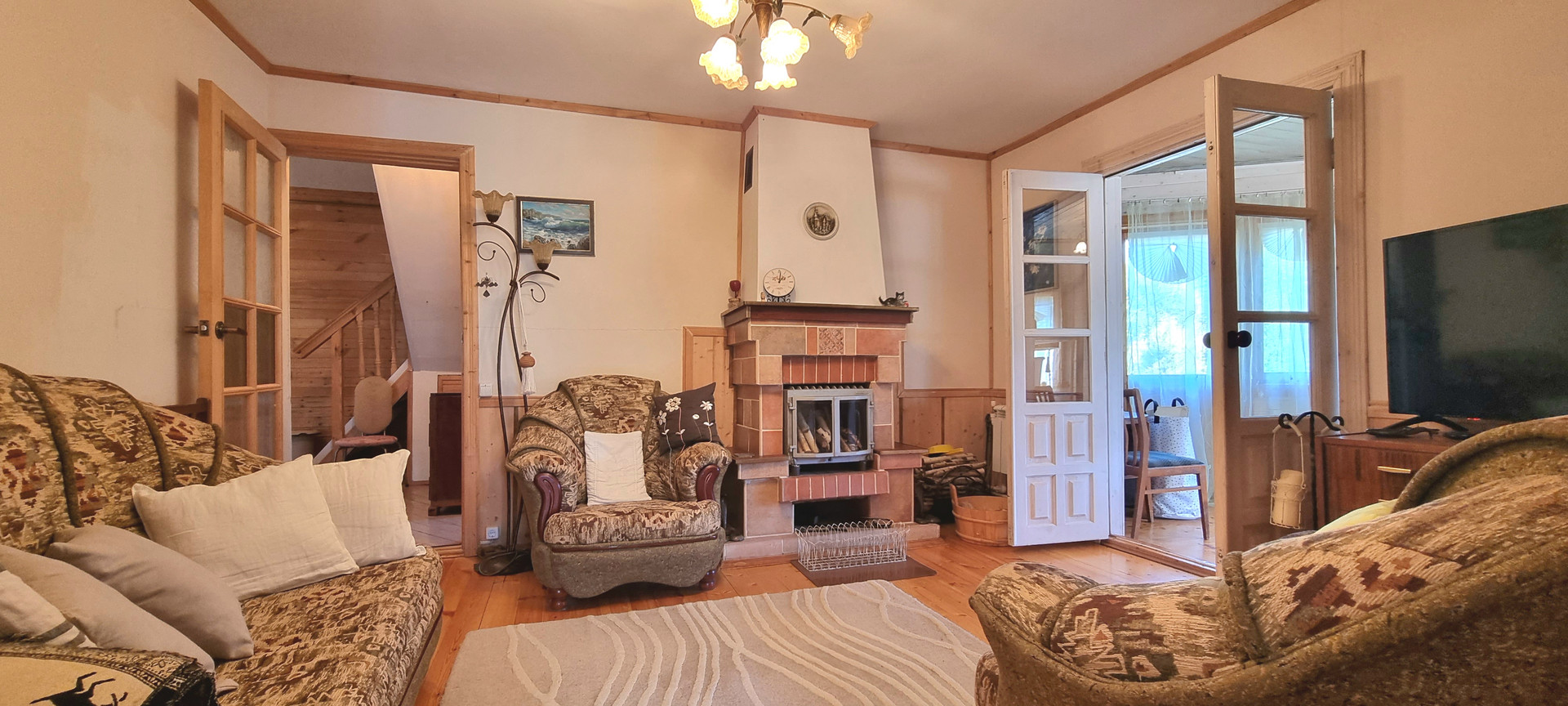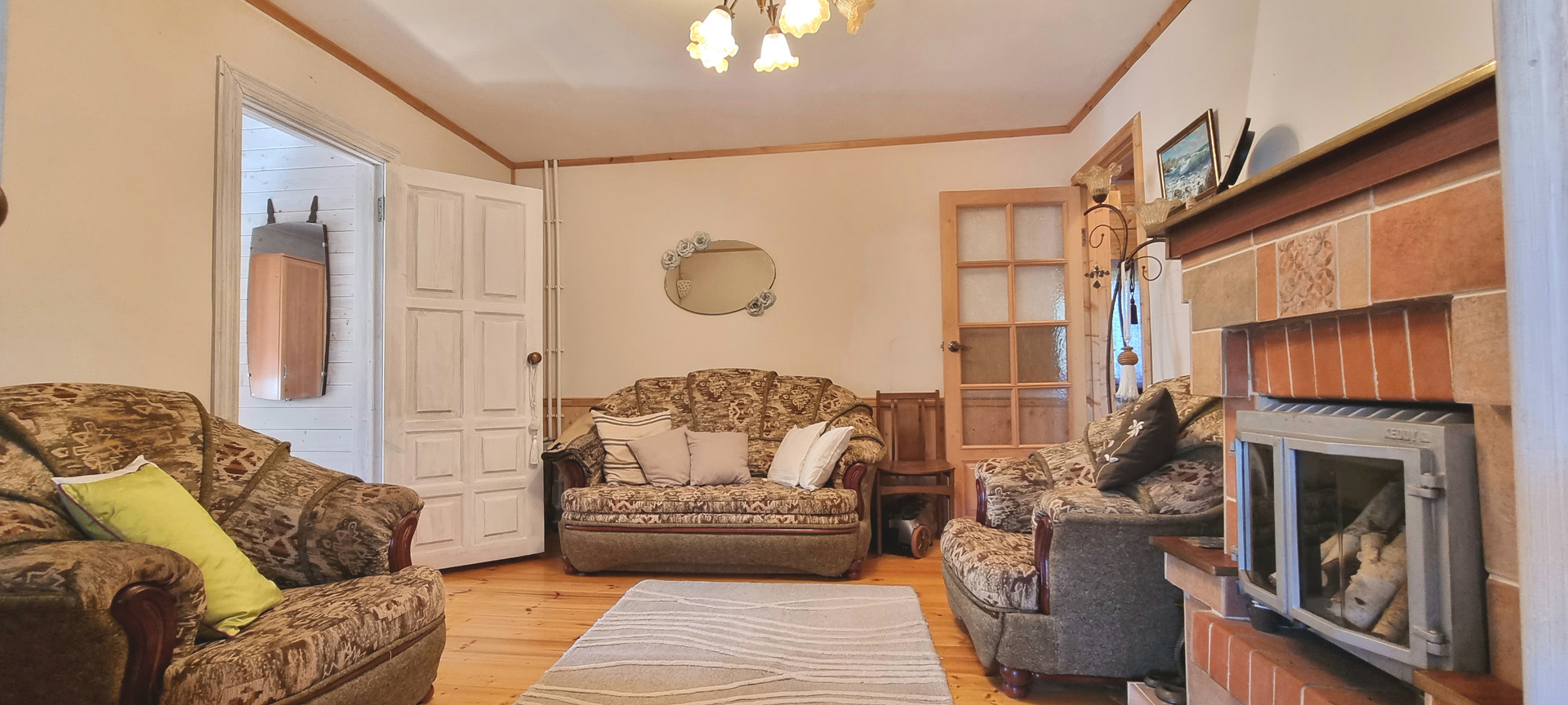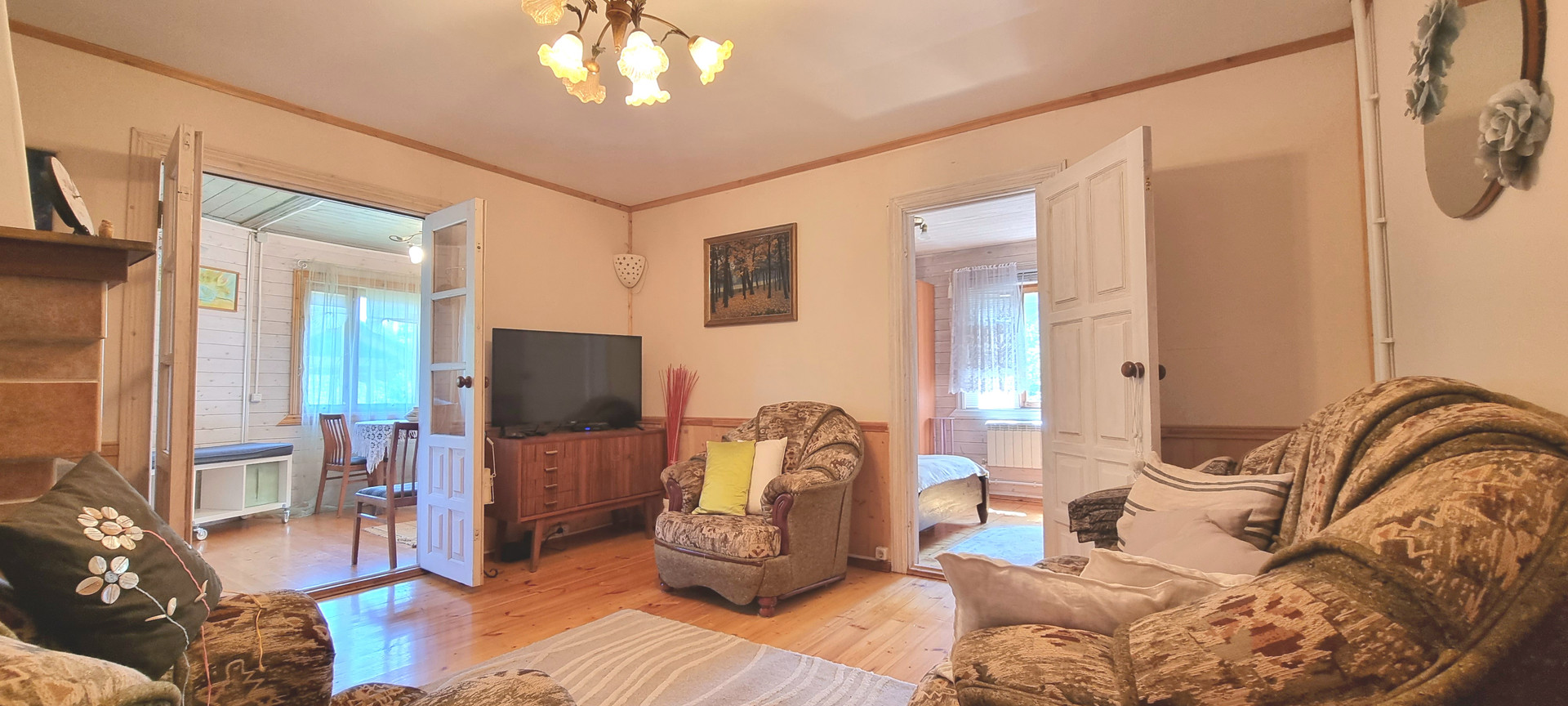 Планировка: 1 этаж, прихожая-веранда, кухня, гостинная, 2 спальни, санузел, .В гостинной есть камин и летняя веранда.