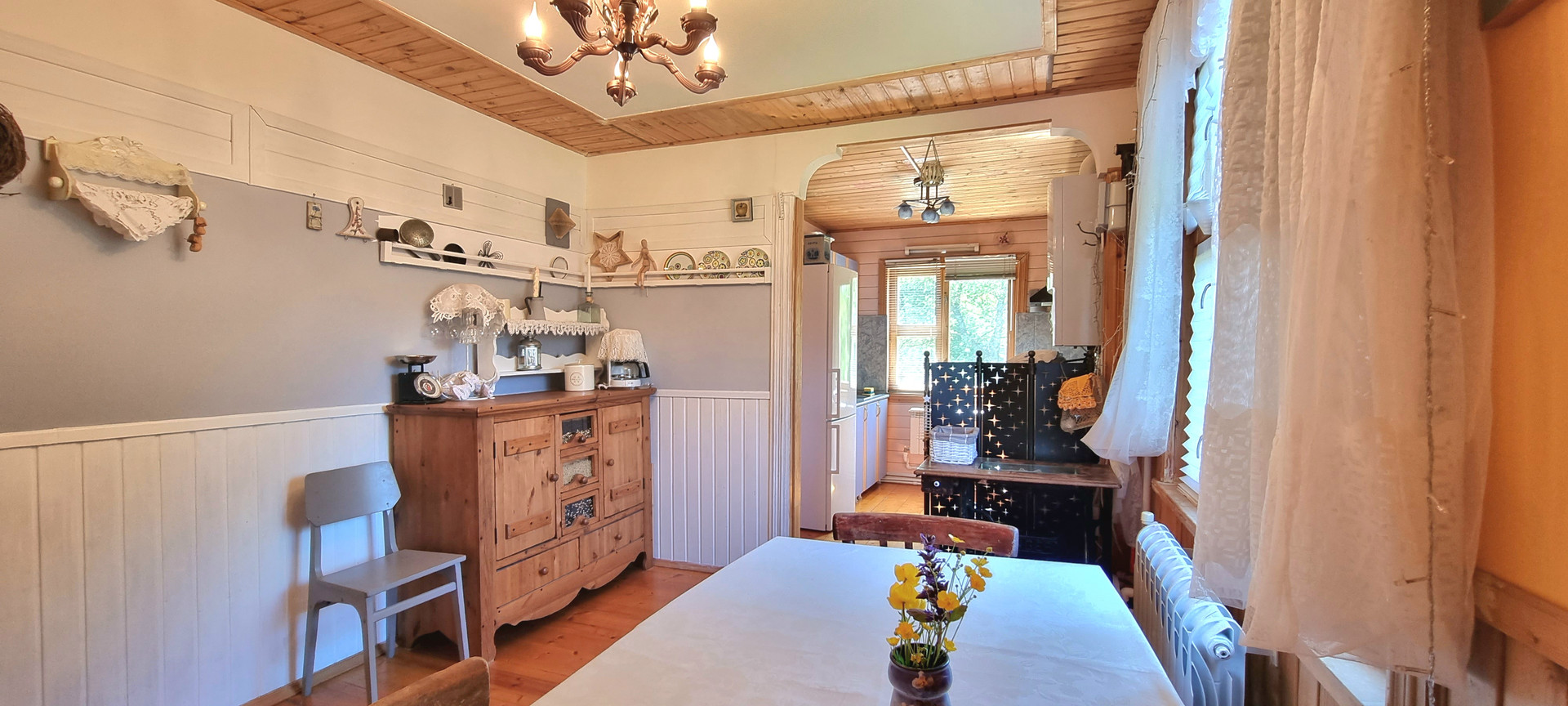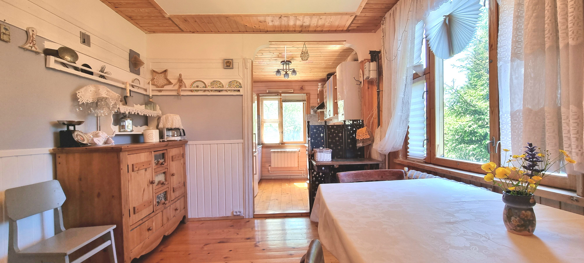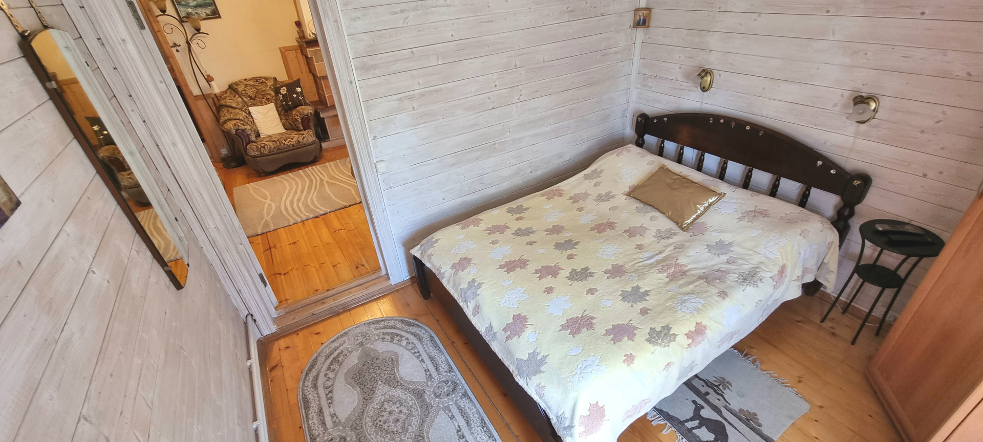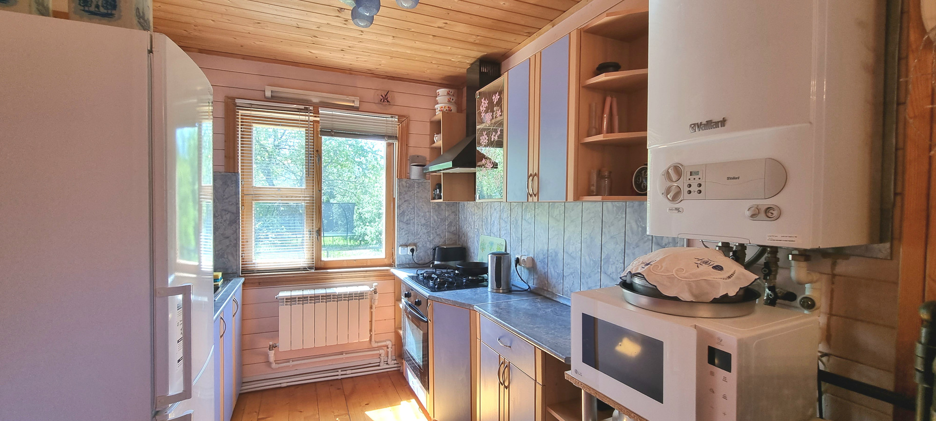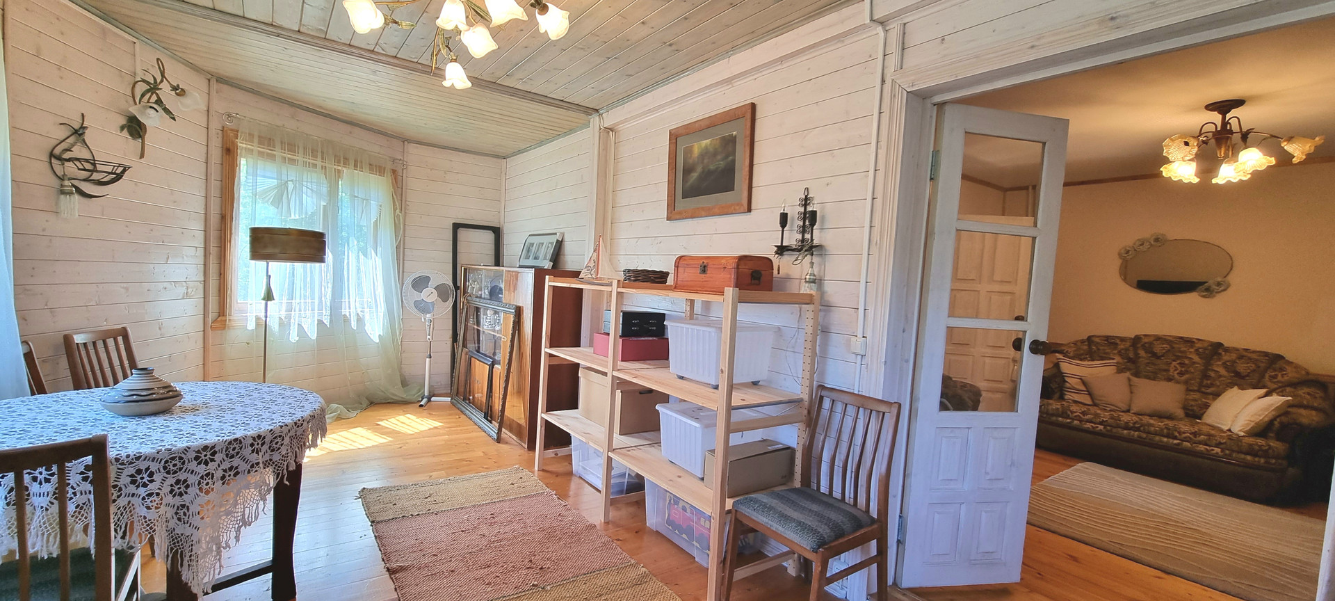 Планировка: 1 этаж, прихожая-веранда, кухня, гостинная, 2 спальни, санузел, .В гостинной есть камин и летняя веранда.
