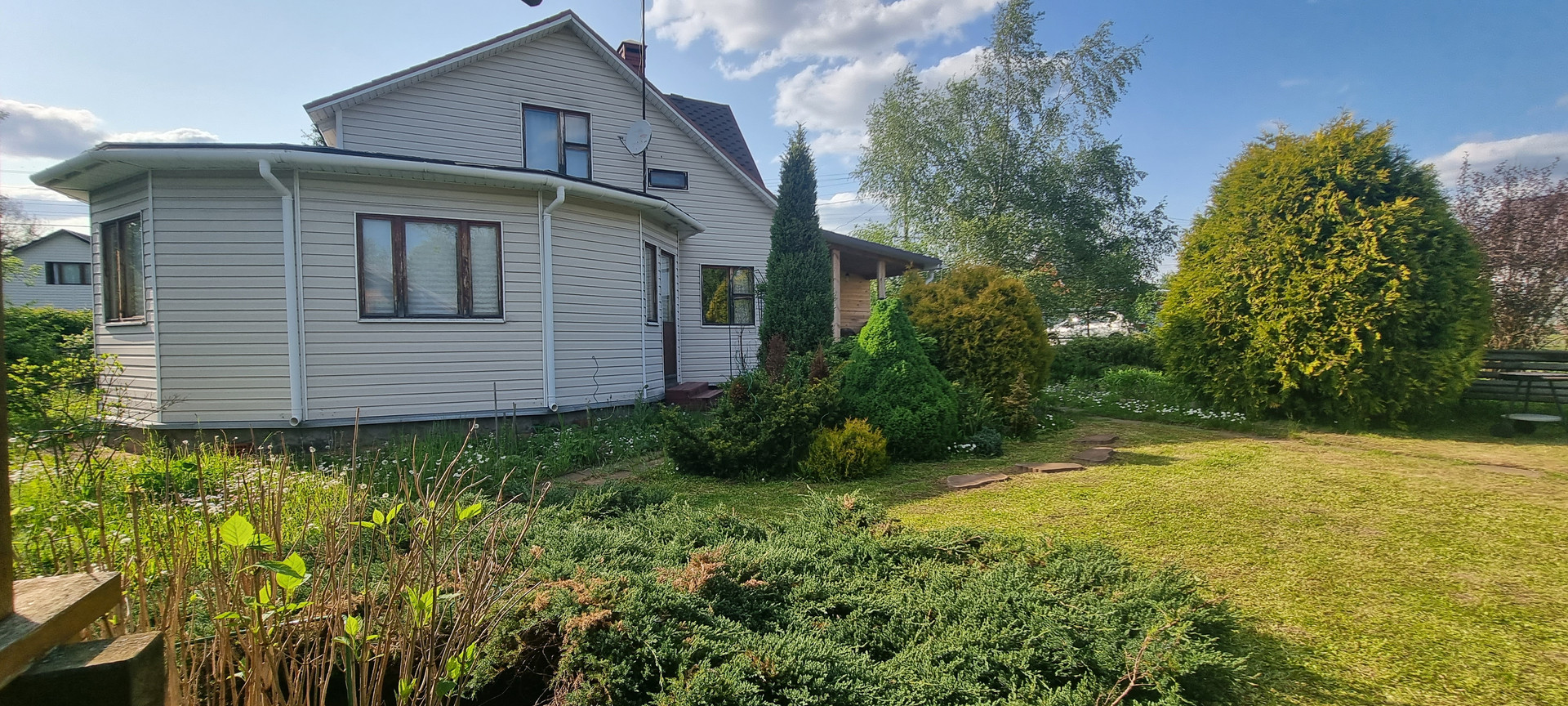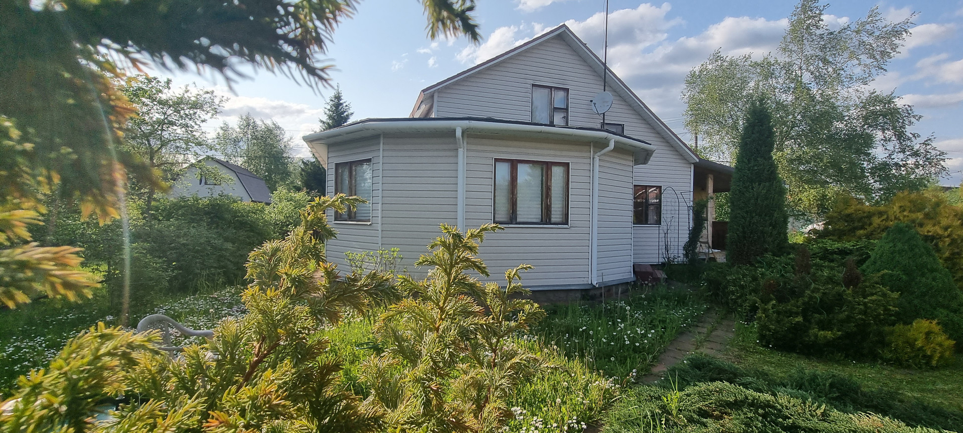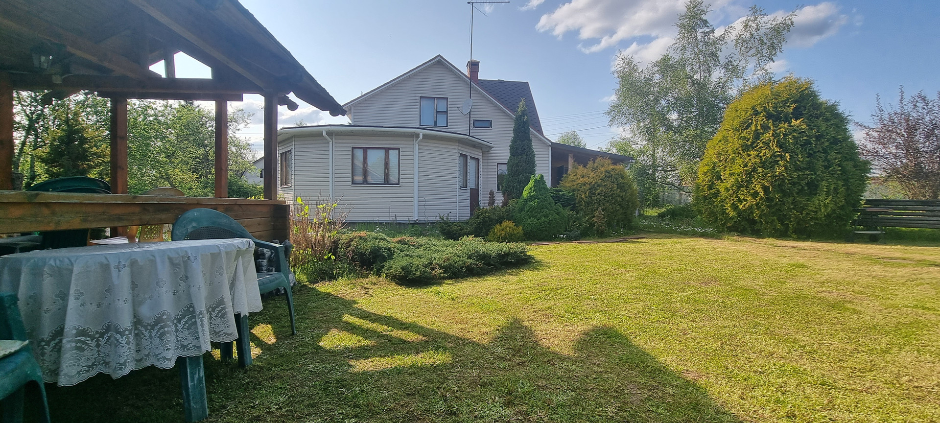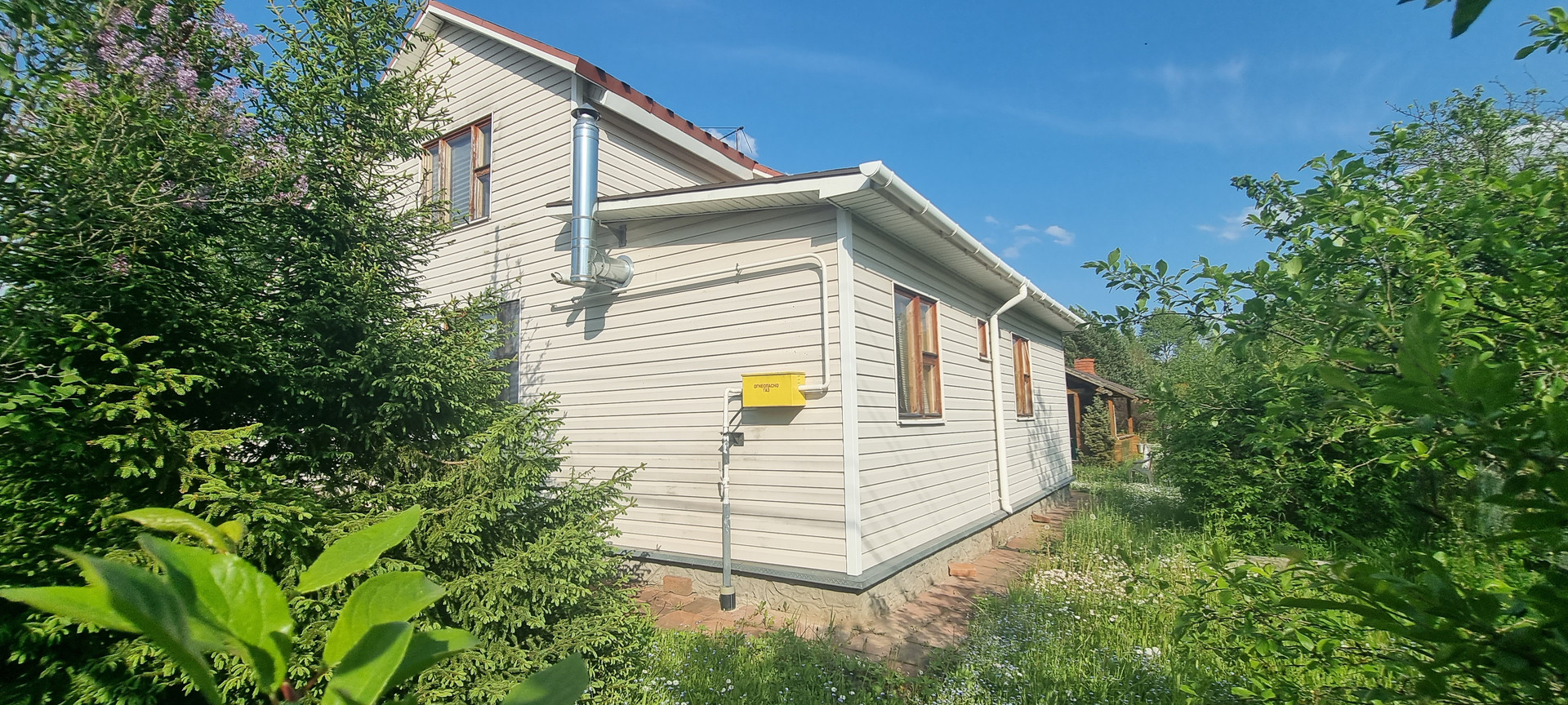 Фундамент: лента, окна: деревянный двойной стеклопакет, кровля: мягкая черепица, вода: скважина 30 метров, септик: автономный. санузел в доме, бойлер на 80 литров, душевая кабина.
