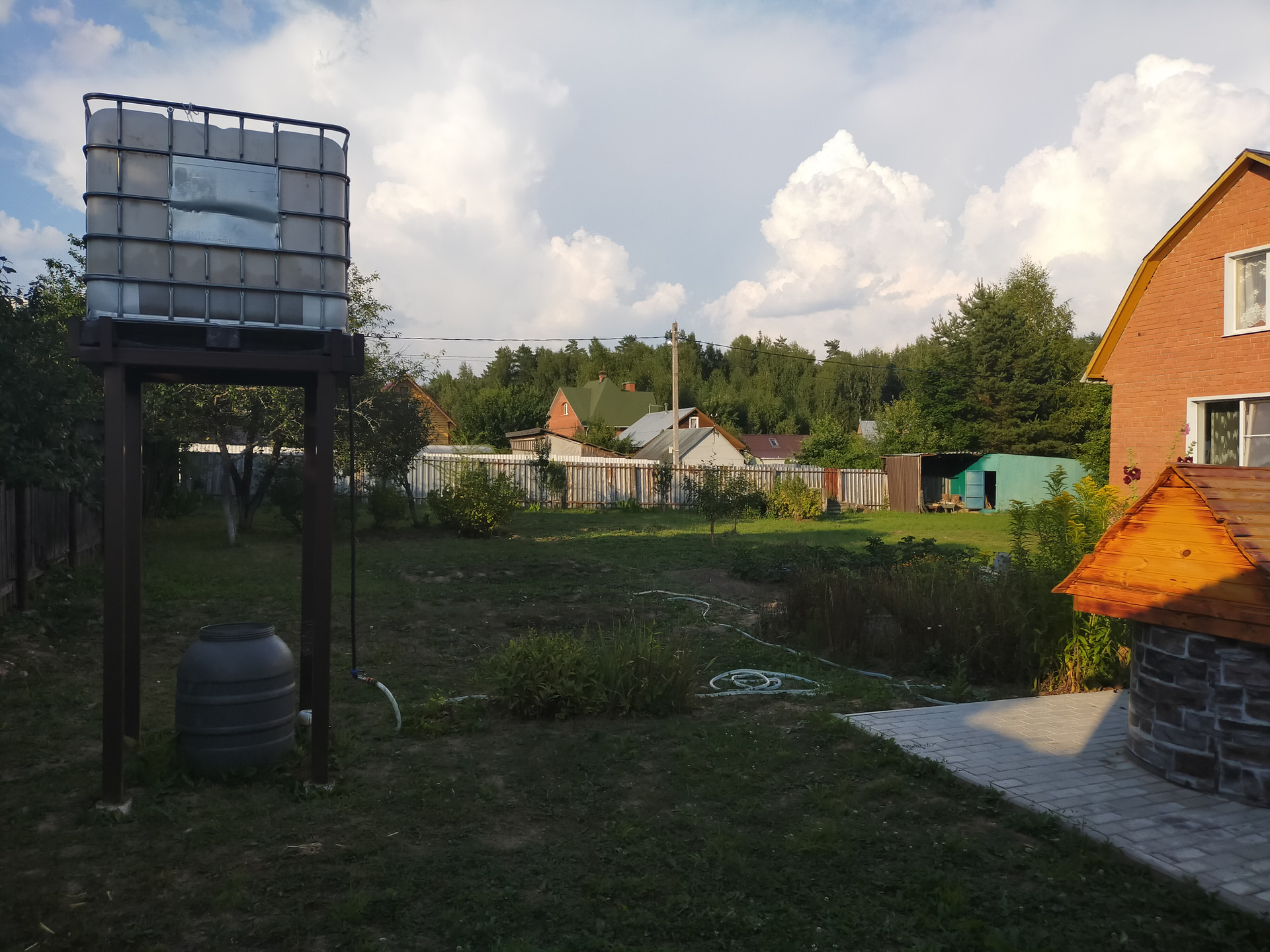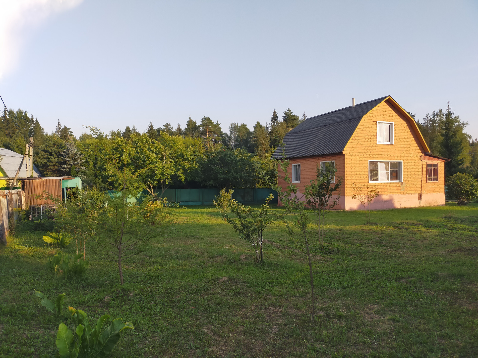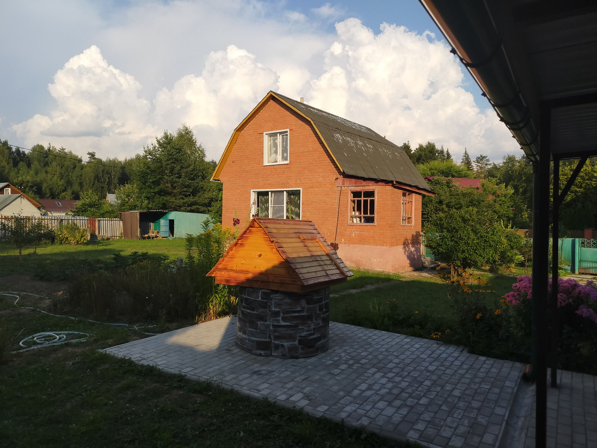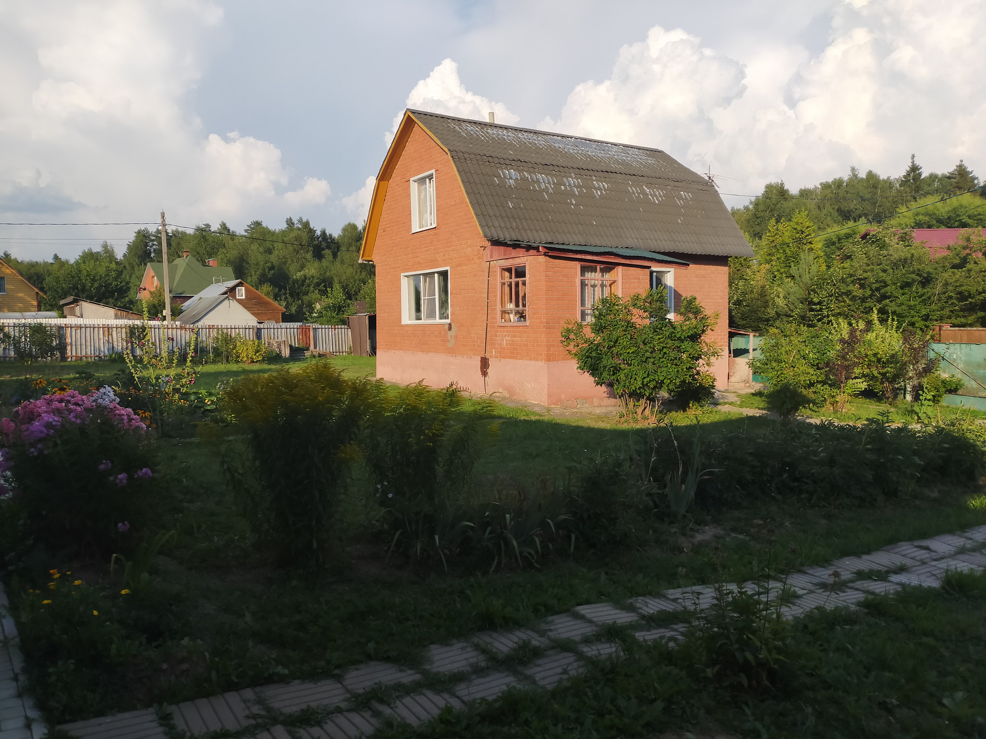 Дача расположена в тихом месте, вокруг леса, от Москвы 40 км. На участке два дома, летний щитовой на сваях (недавно поставили) и основной кирпичный из двух этажей с подвалом. Участок огорожен. Электричество, колодец 6 колец, выгребная яма.