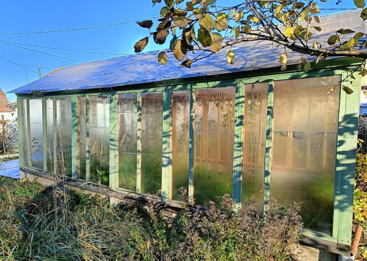 На участке плодовые деревья и кустарники, 2 стеклянные теплицы, туалет и сарай.