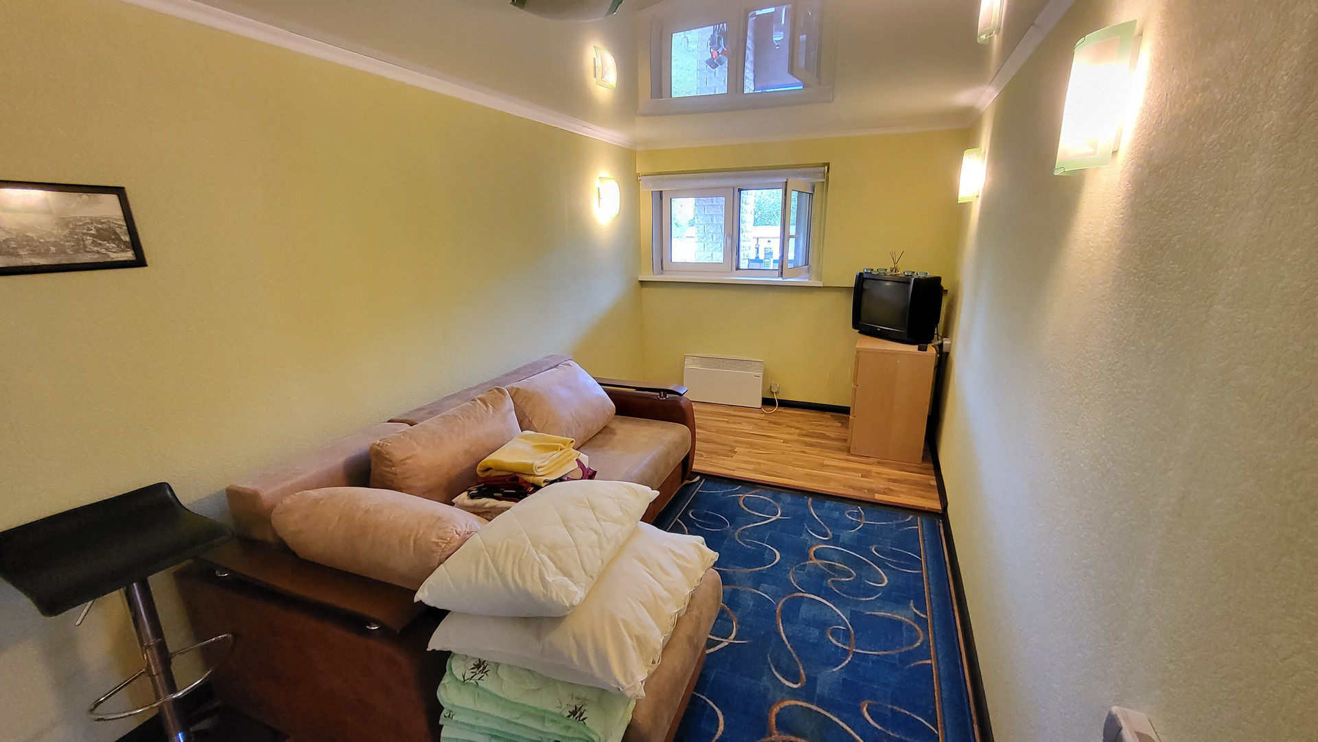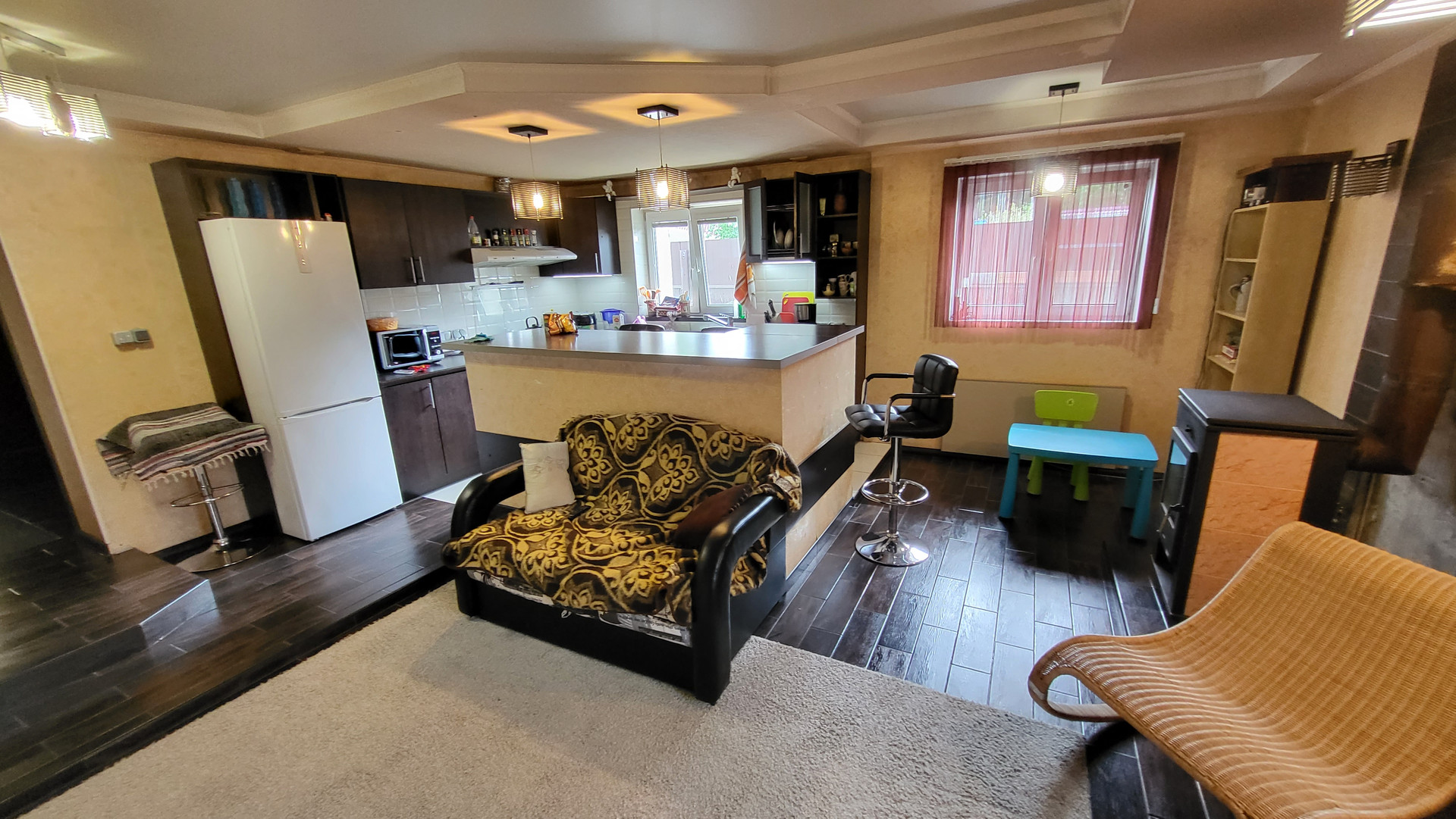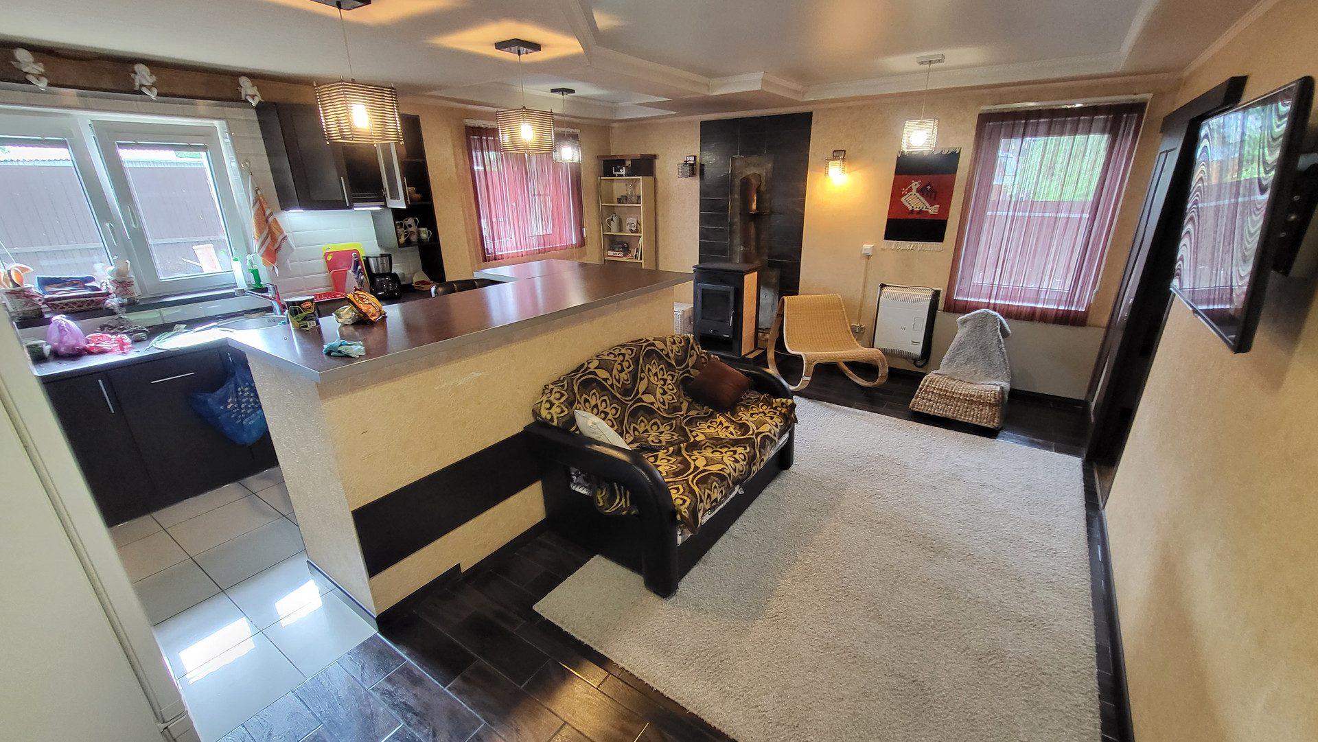 Дом 2 этажный. 1-й этаж: прихожая, ванная с с/у, кухня-гостиная с барной стойкой (студия), гостевая спальня; 2-ой этаж - 2 спальни; чердак - свободная планировка.