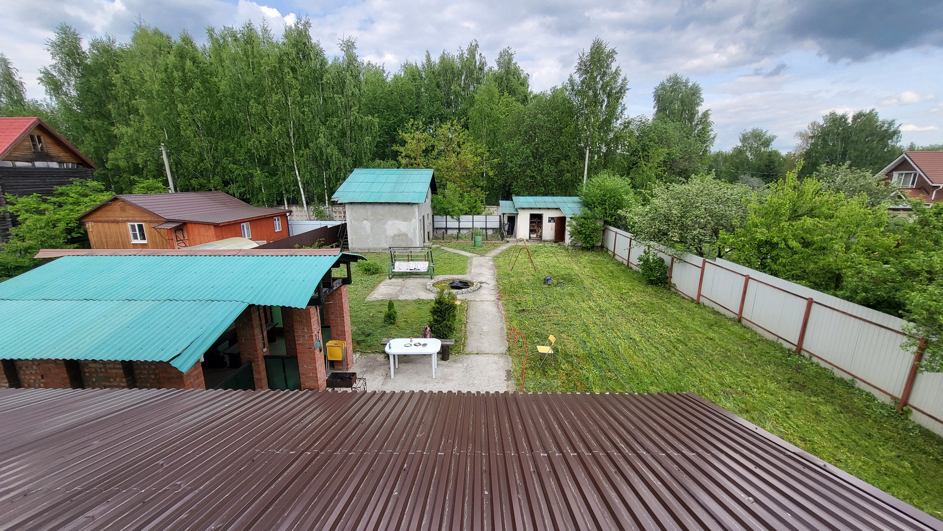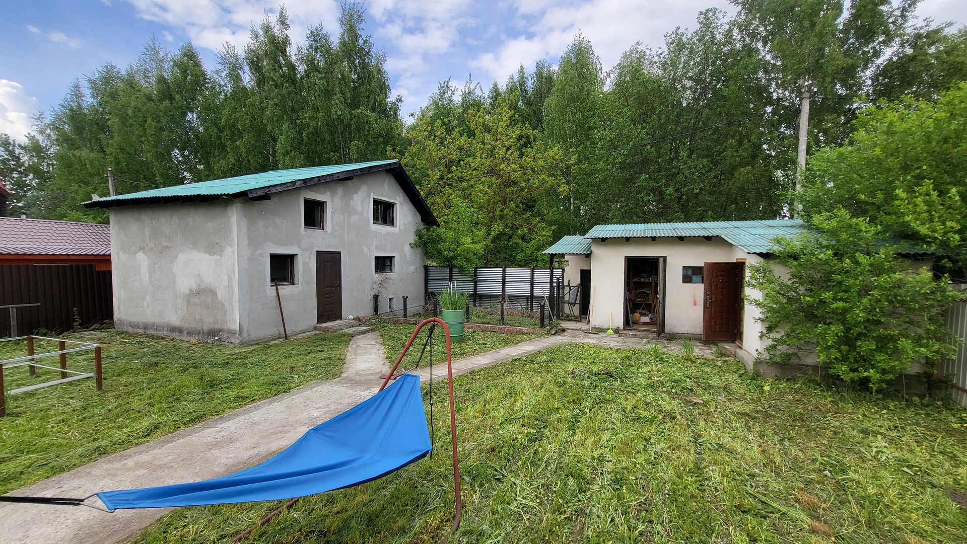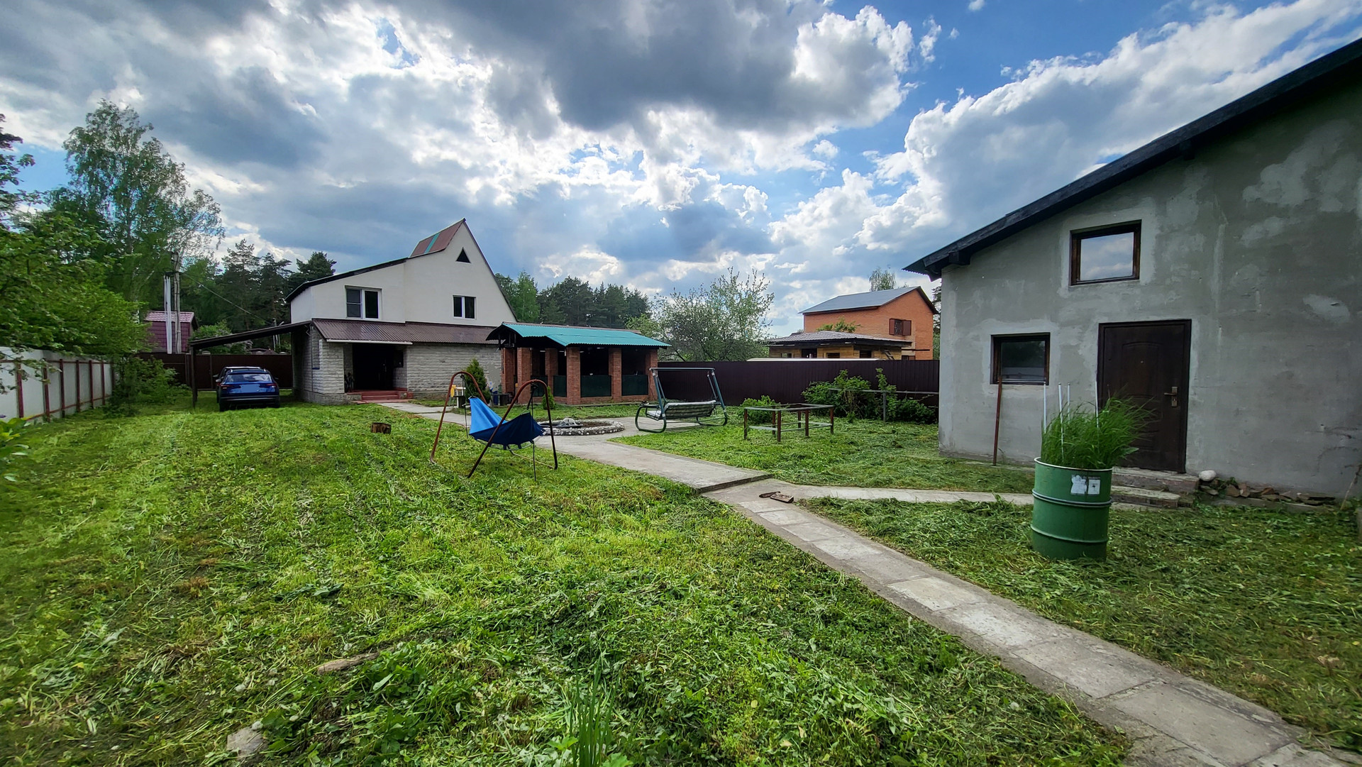 Беседка 20 кв.м на фундаменте, строение под баню (2 этажа), хоз. постройка (кирпичный сарай), навес для 2-х авто. По периметру 2 м. забор, откатные автоматические ворота.