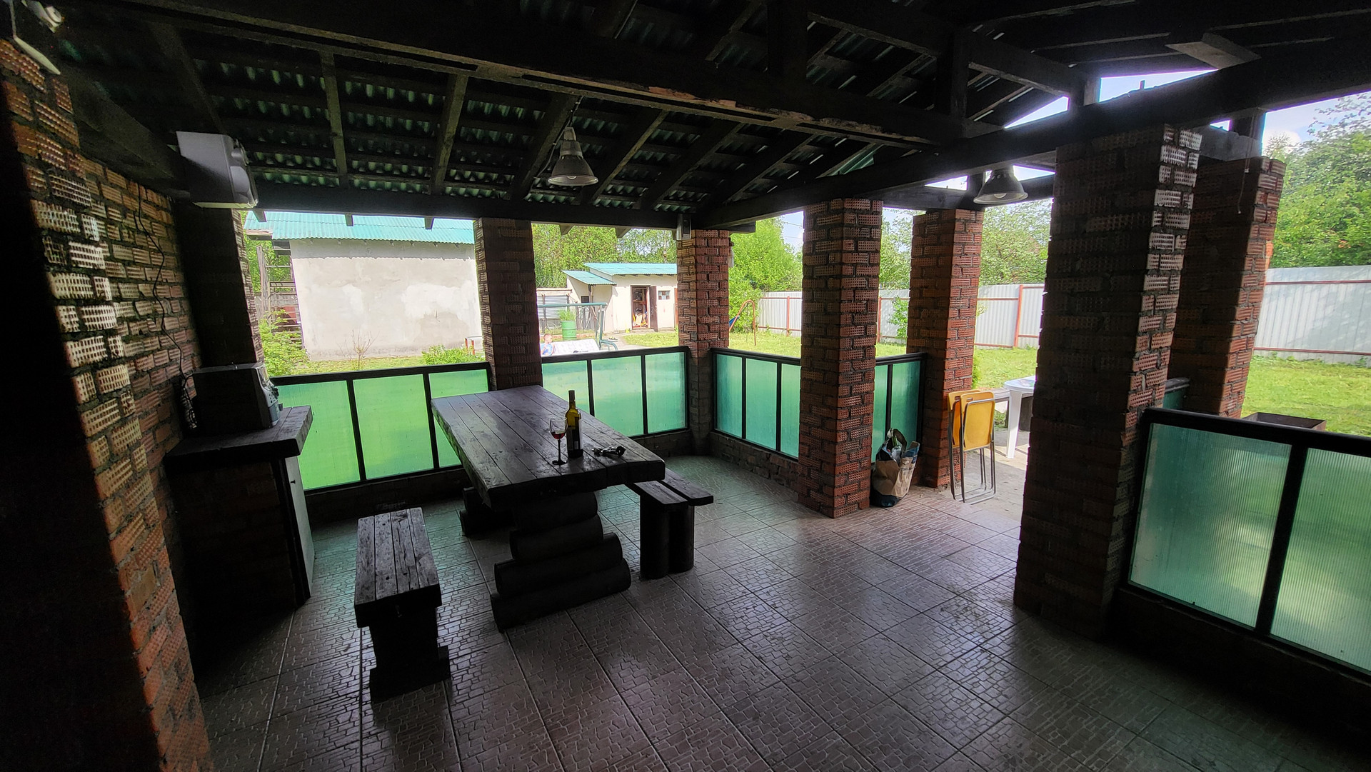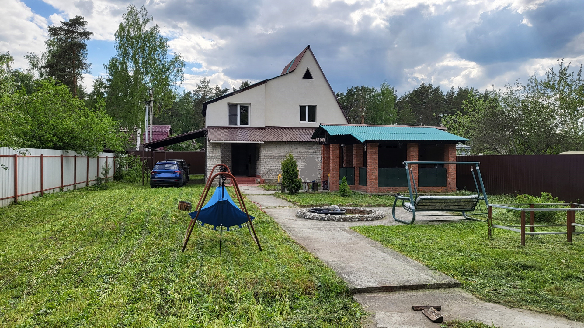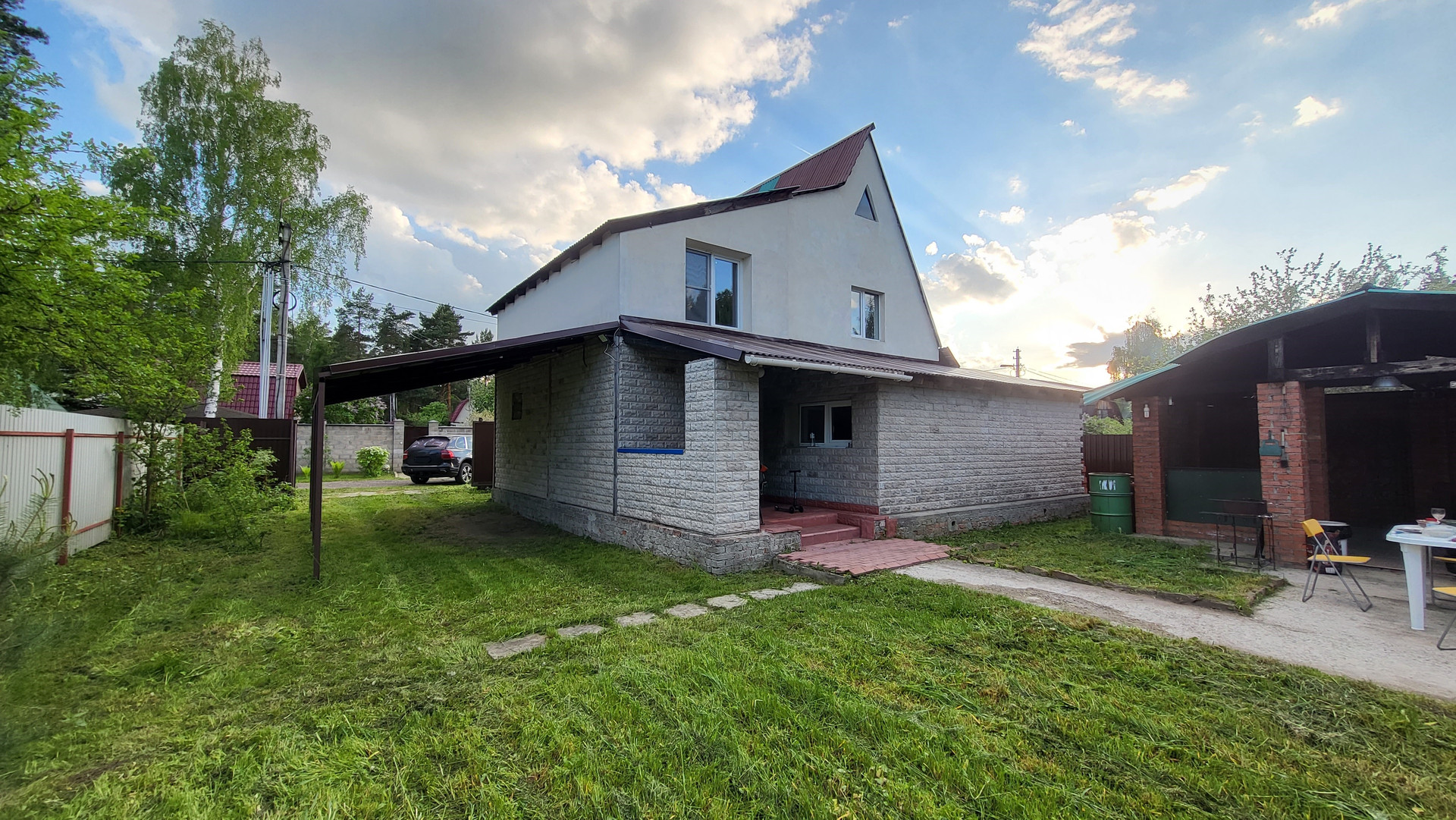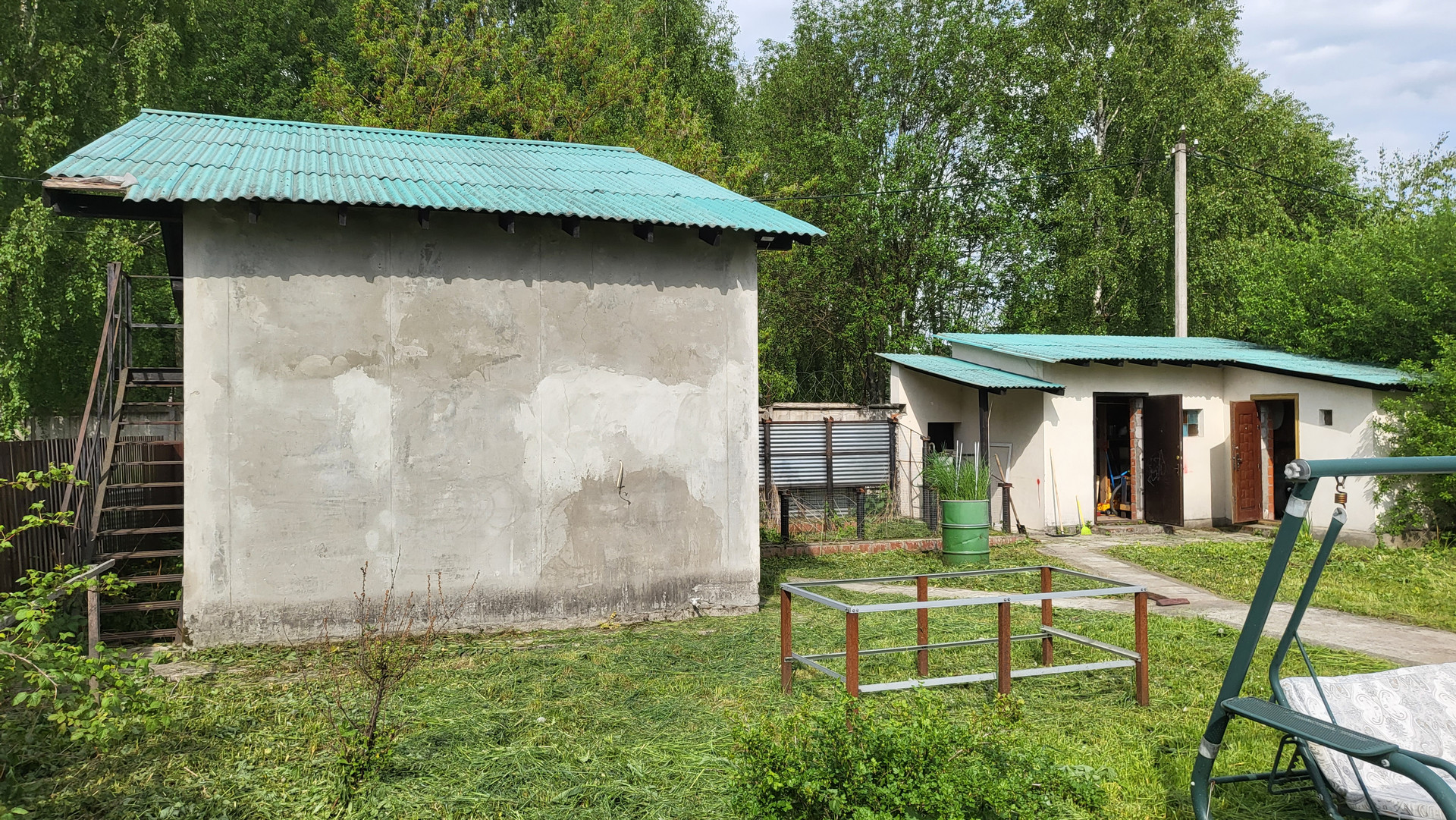 Беседка 20 кв.м на фундаменте, строение под баню (2 этажа), хоз. постройка (кирпичный сарай), навес для 2-х авто. По периметру 2 м. забор, откатные автоматические ворота.