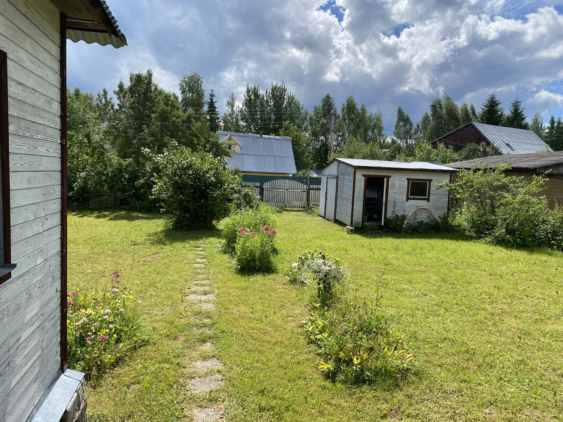 Дом каркасно-щитовой, огорожен забором , фундамент ленточный, в доме свет, летний водопровод, 1-эт.: кухня, 2 комнаты, 2-эт.:  большая спальня. Участок ровный правильной формы. На участке имеются хоз. постройки: летний душ, туалет, сарай. Плодово- ягодные деревья, кустарники, цветы. В окружении леса. Экологически чистое место, подходит для семейного отдыха. СНТ благоустроено, на территории есть магазин, где можно приобрести все необходимое.