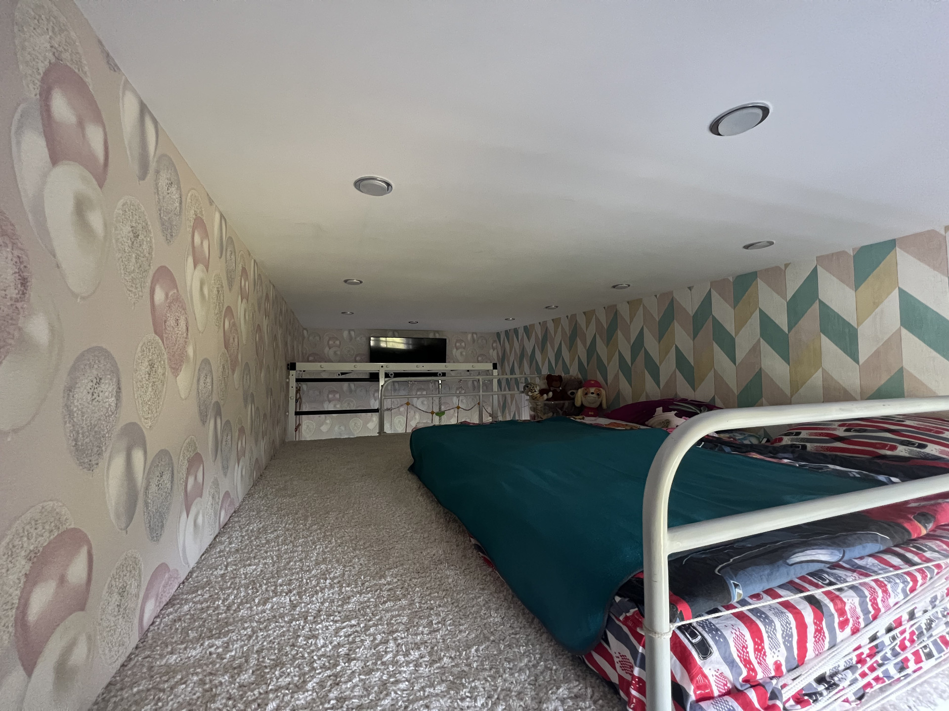 На втором этаже три отделных комнаты, центральная с панорамным окном - спальня с императорской кроватью и двумя огромными шкафами. слева спортивная комната со штангой, батутом и прочими тренажерами, справа детская комната, в которой реализована детская мечта.