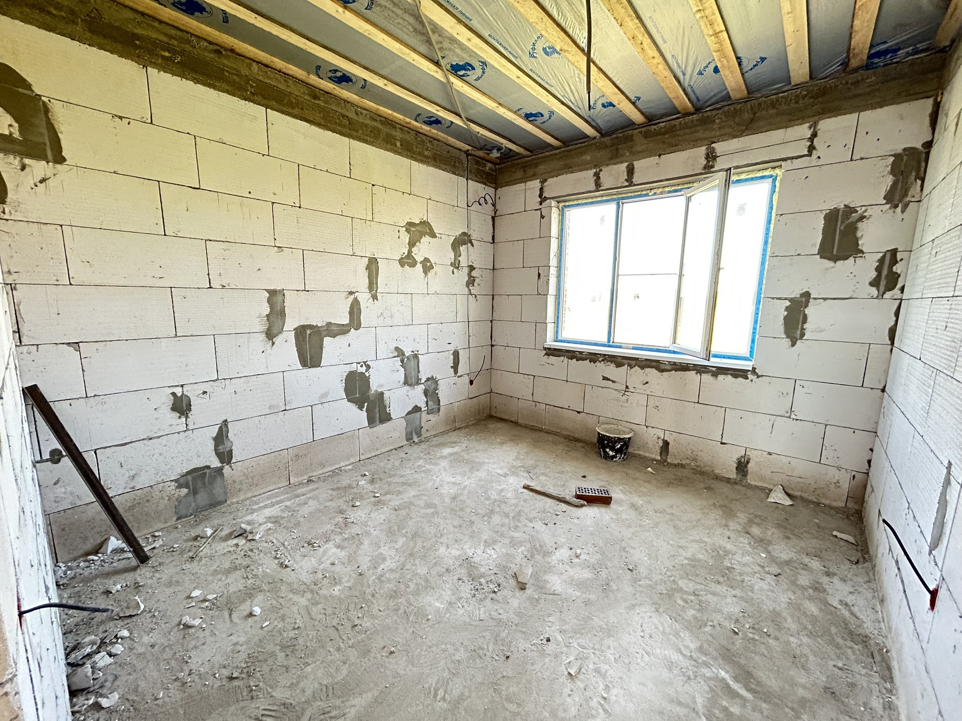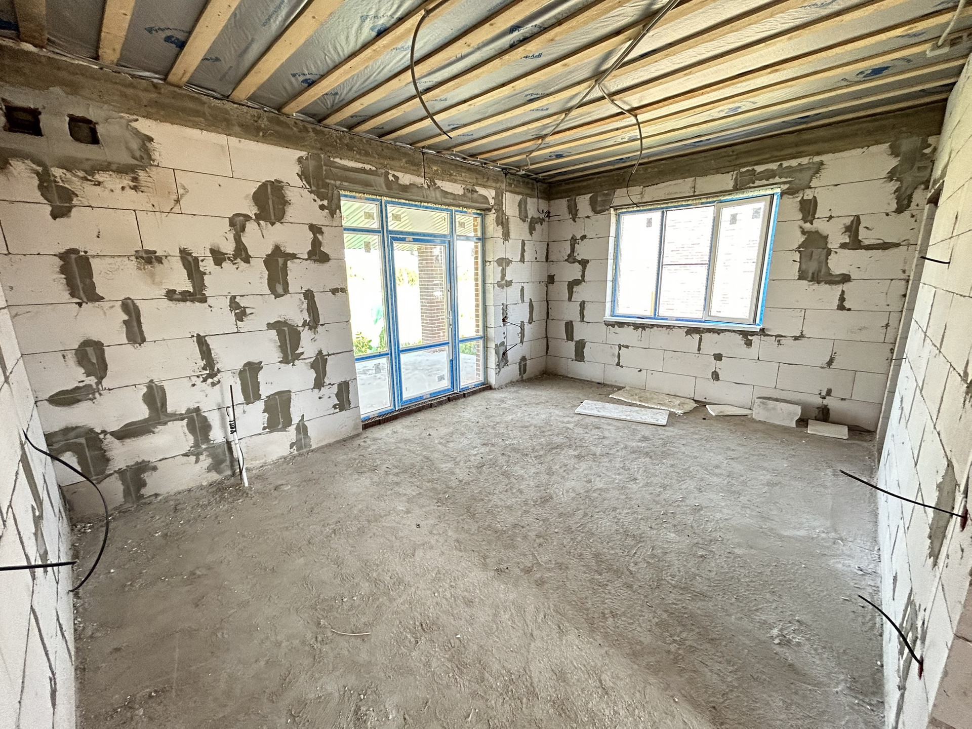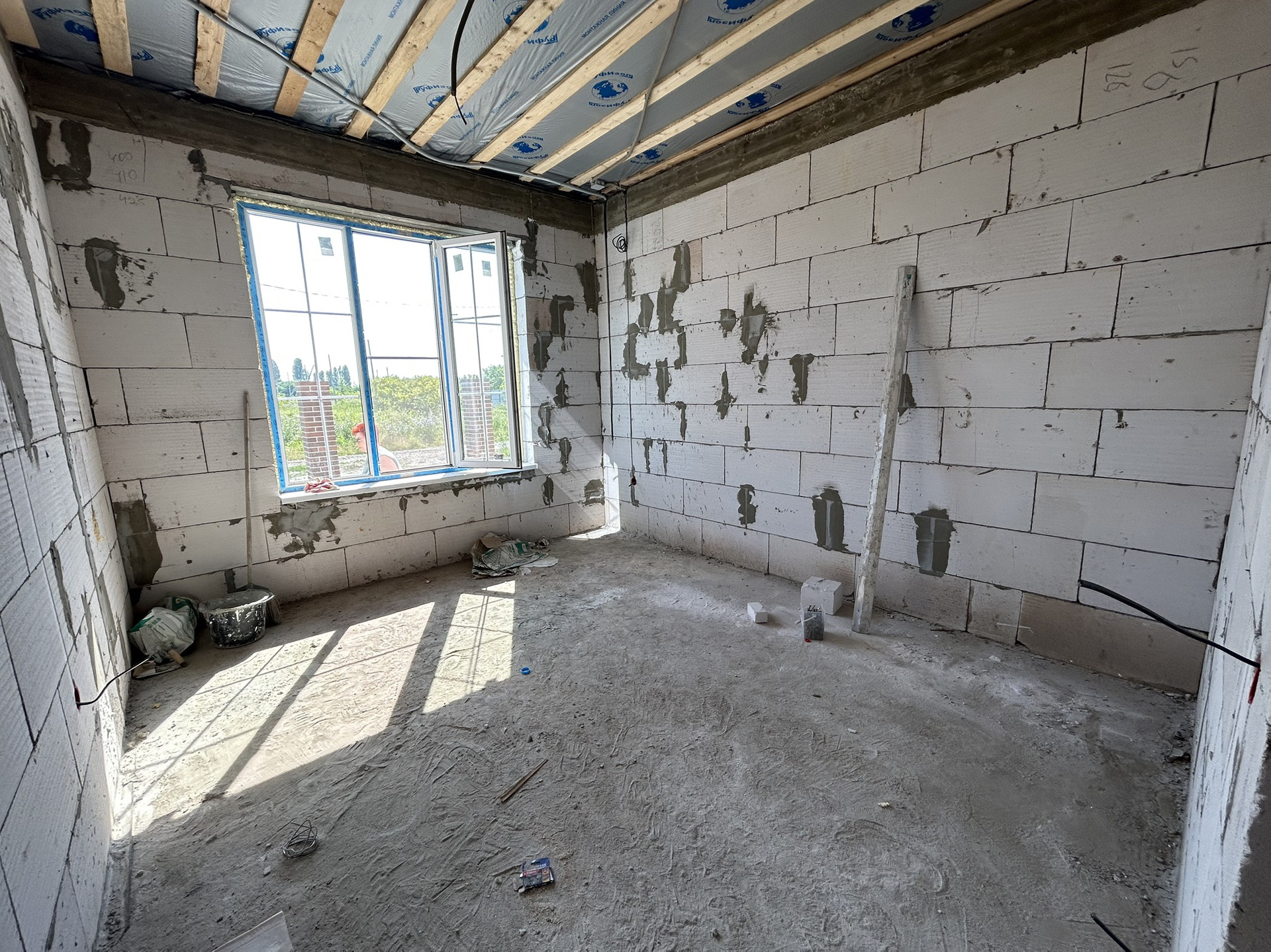 Дом с предчистовой отделкой, тёплые полы, полусухая механизированная стяжка пола, смонтировано отопление, установлены радиаторы, выполнена разводка электрики, стены отштукатурены и отшпатлеваны.