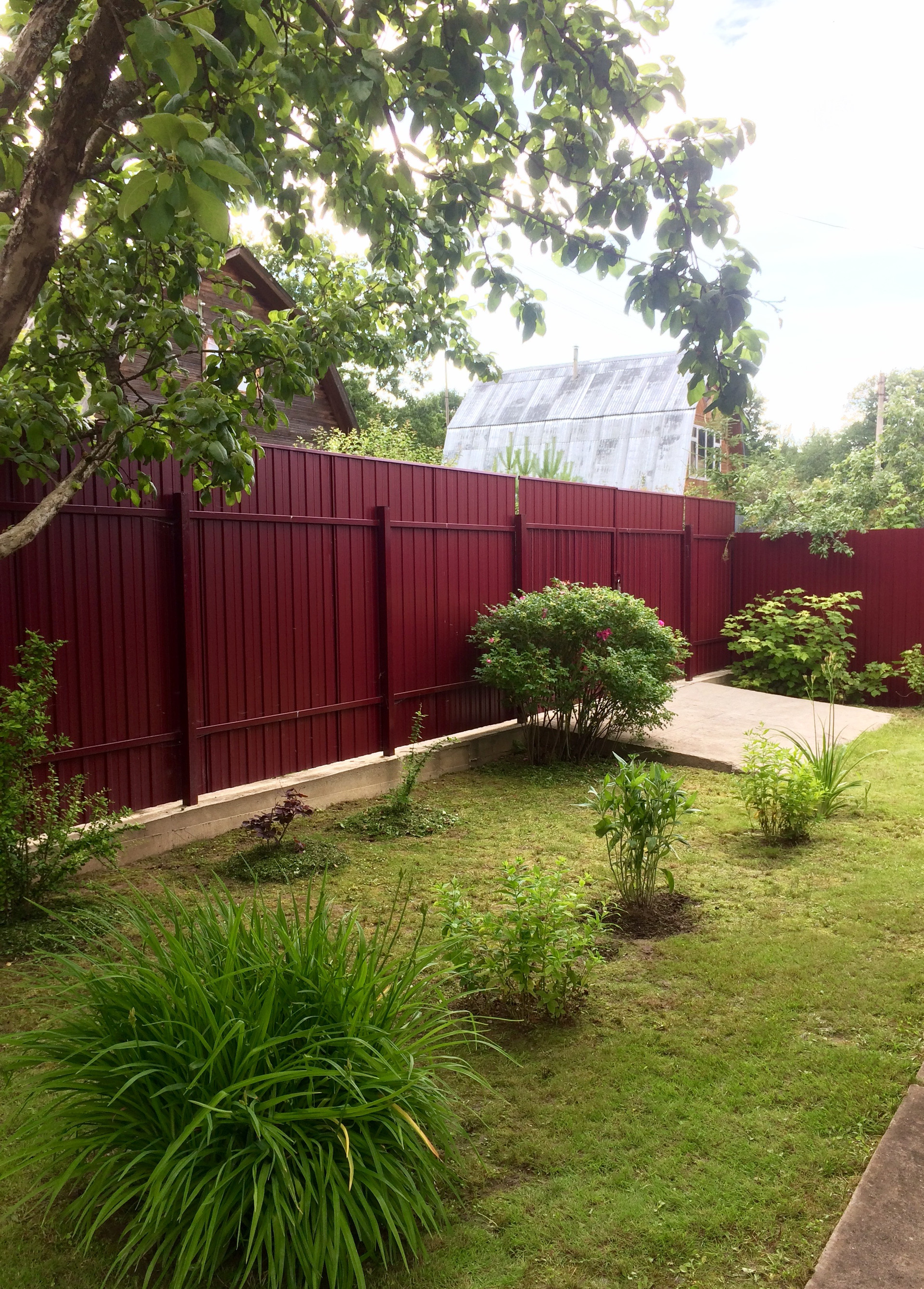 Участок огорожен забором из профлиста, фасадная часть на фундаменте, два въезда через ворота.