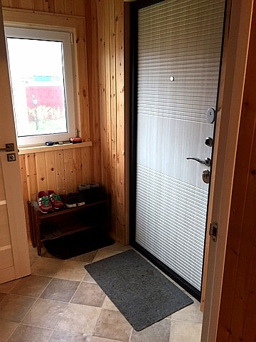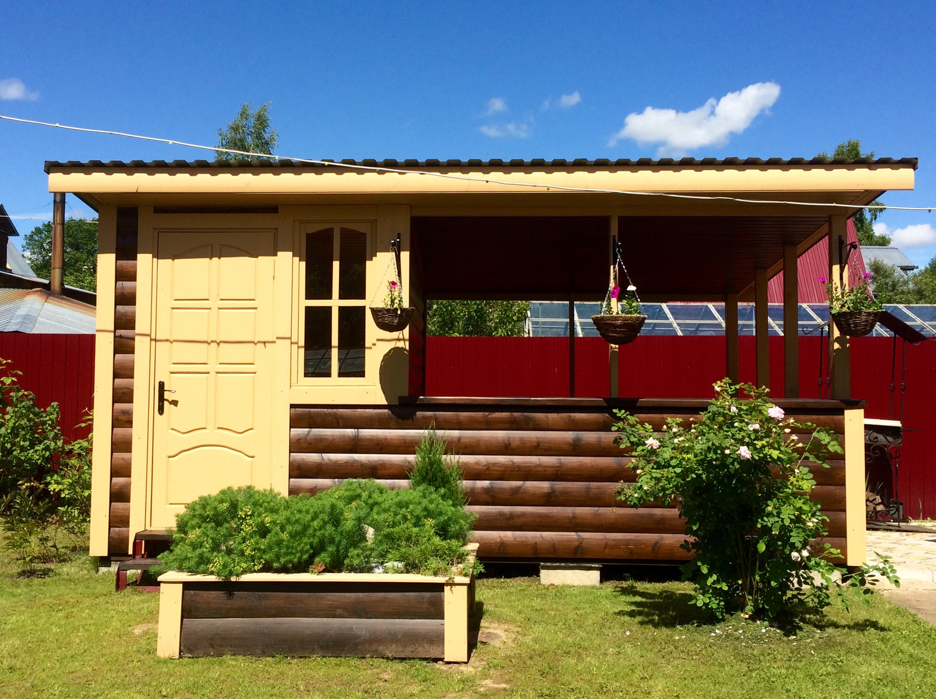 -уютный утепленный домик со стеллажи для разных нужных вещей и инвентаря.