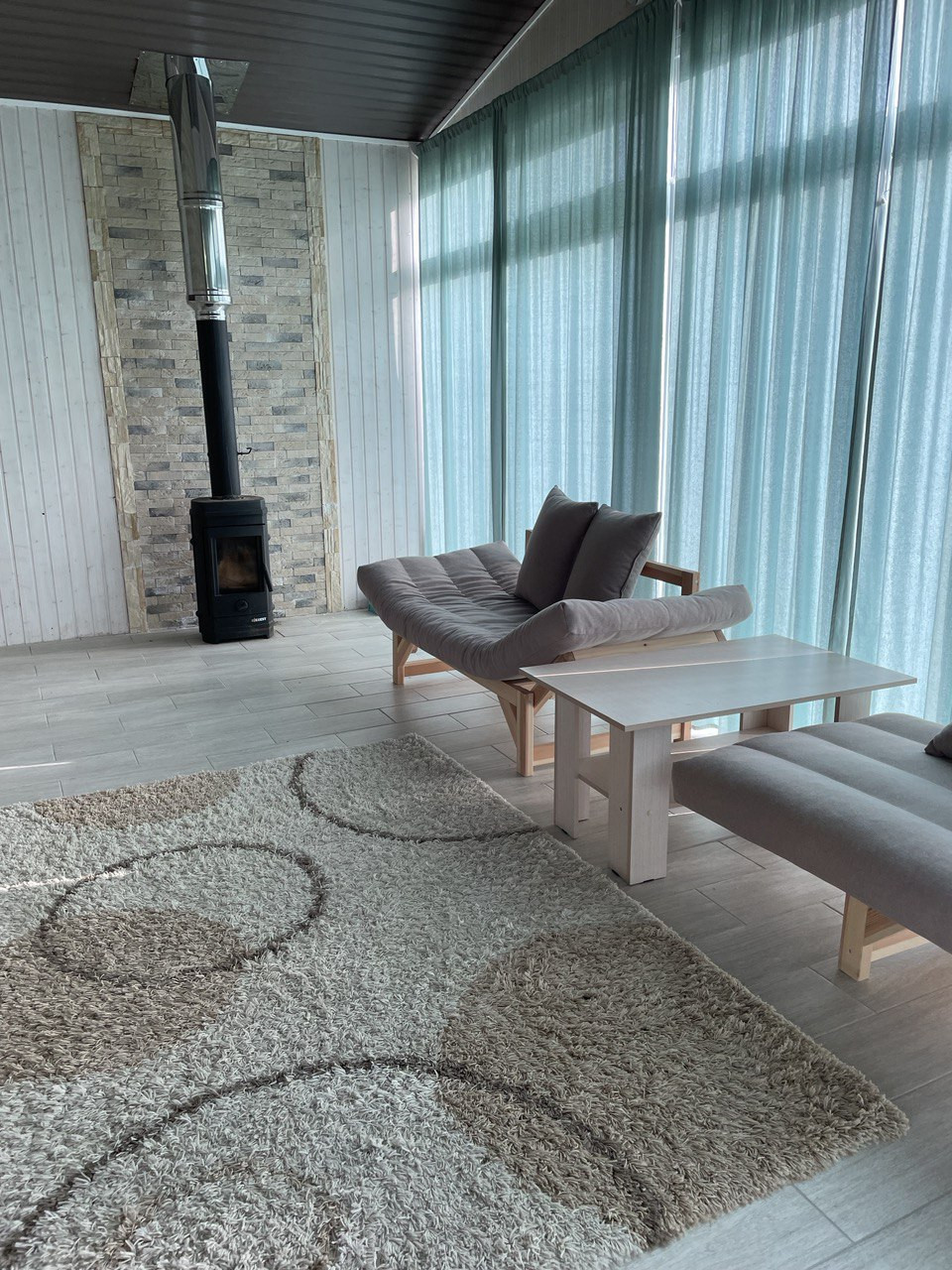 Первый этаж - прихожая с гардеробом, кухня, гостиная с каминным залом, просторный сан.узел с сауной, остекленная теплая терраса с камином-печью и бойлерная. На второй этаж ведет массивная стильная лестница с подсветкой. На втором этаже 2 спальни с панорамным остеклением и видом на участок (не на соседей), зал с угловым диваном и просторный открытый балкон.