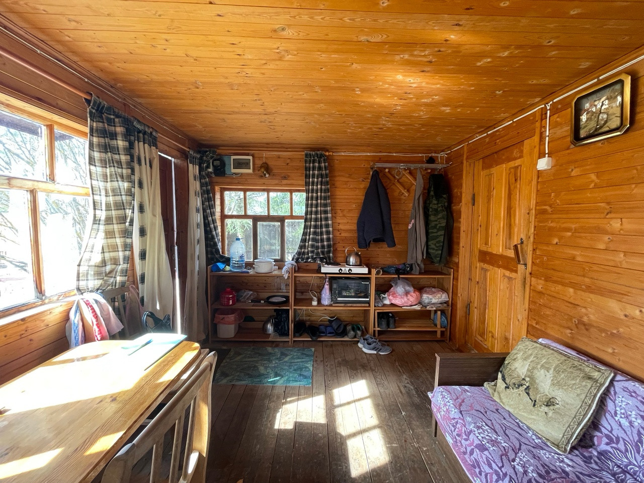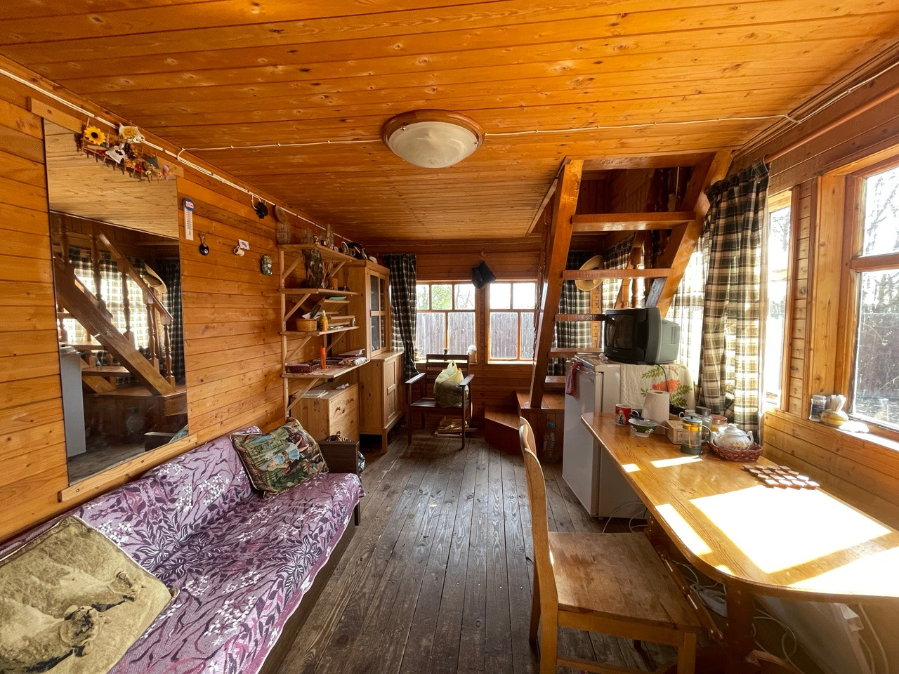 Удачная планировка дома: На первом этаже кухня-гостиная, баня и душ. На втором этаже комната.
