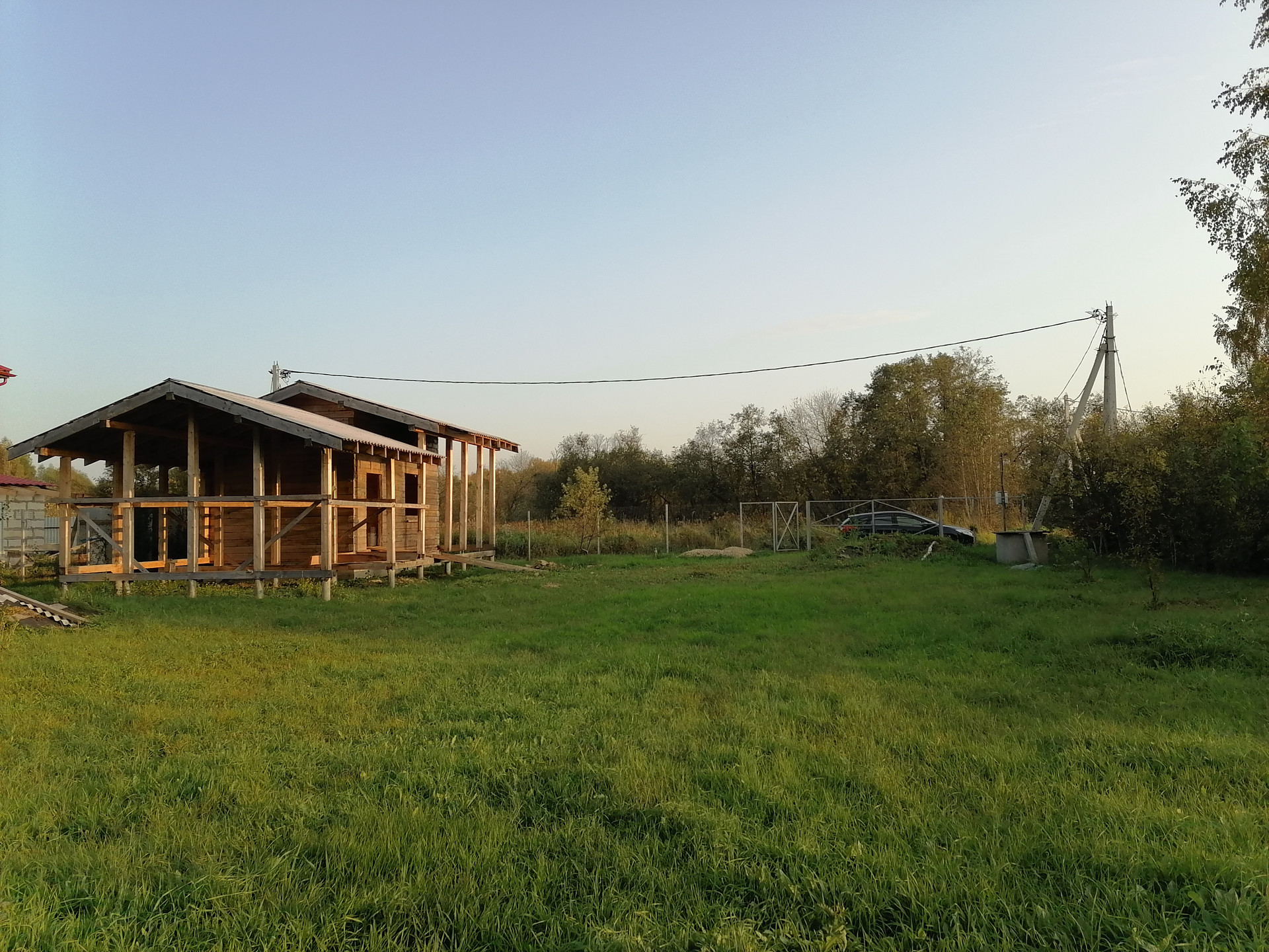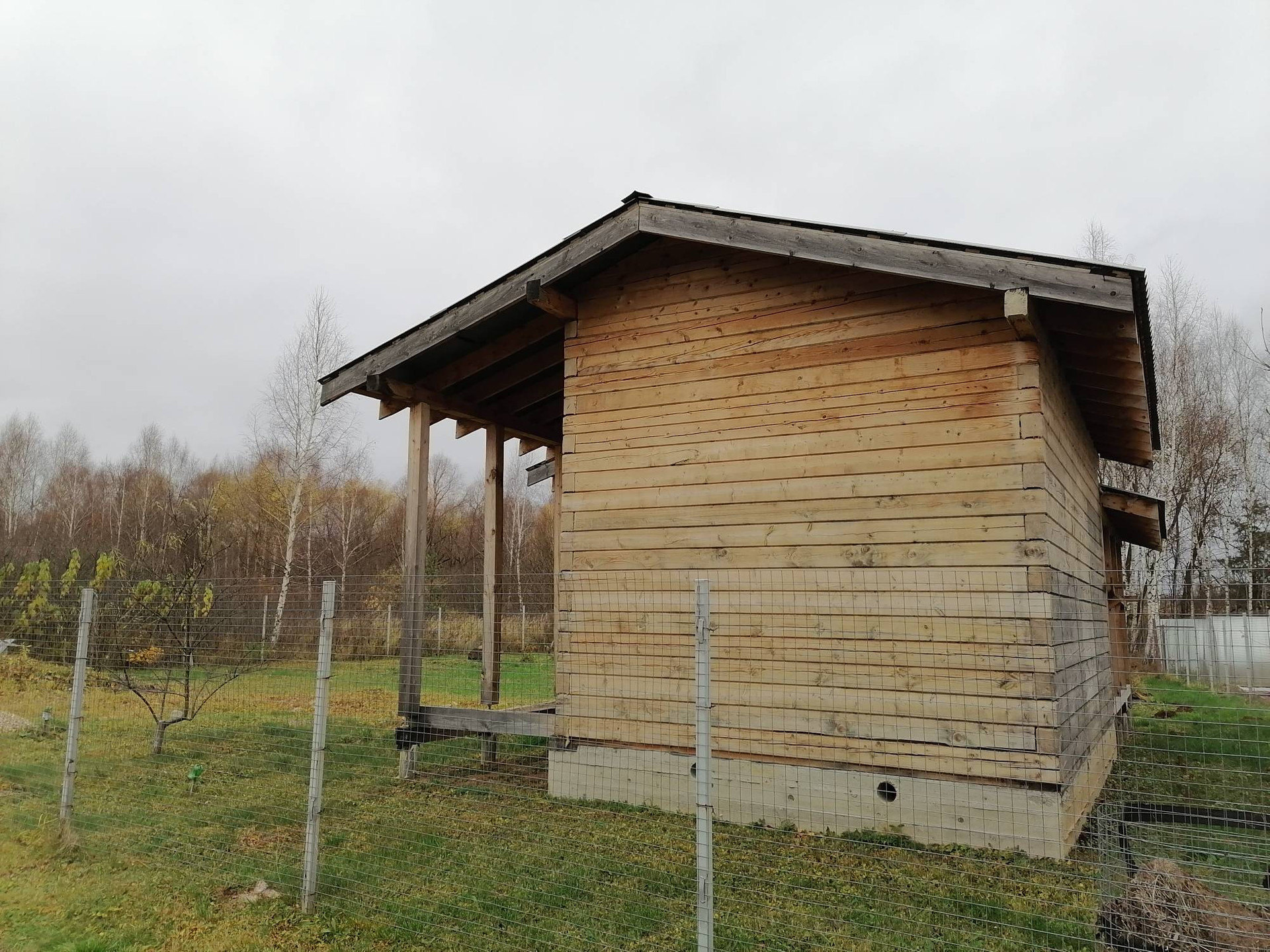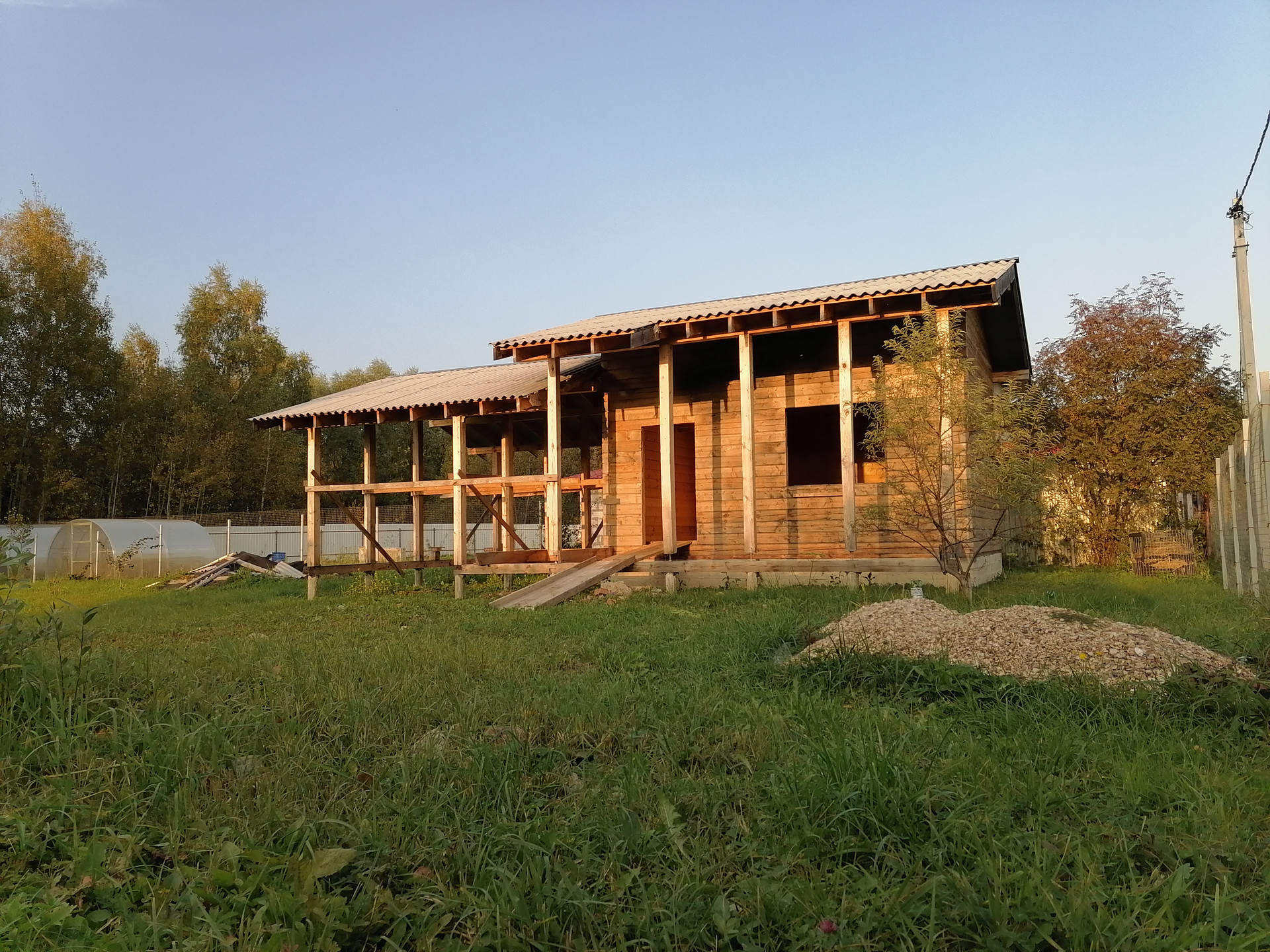 Есть огромный навес для веранды, с возможностью его присоединения и за счёт него расширения дома.