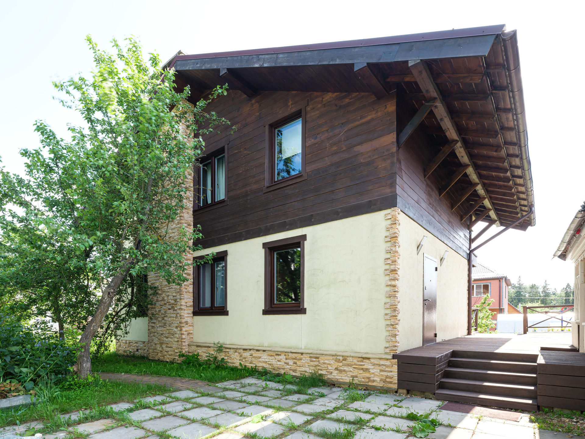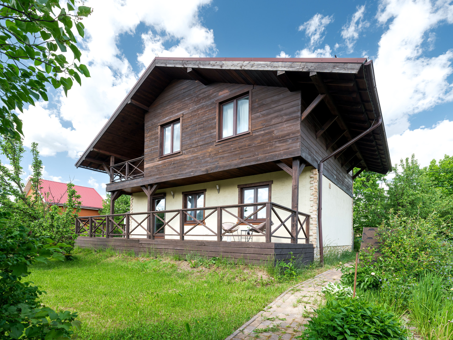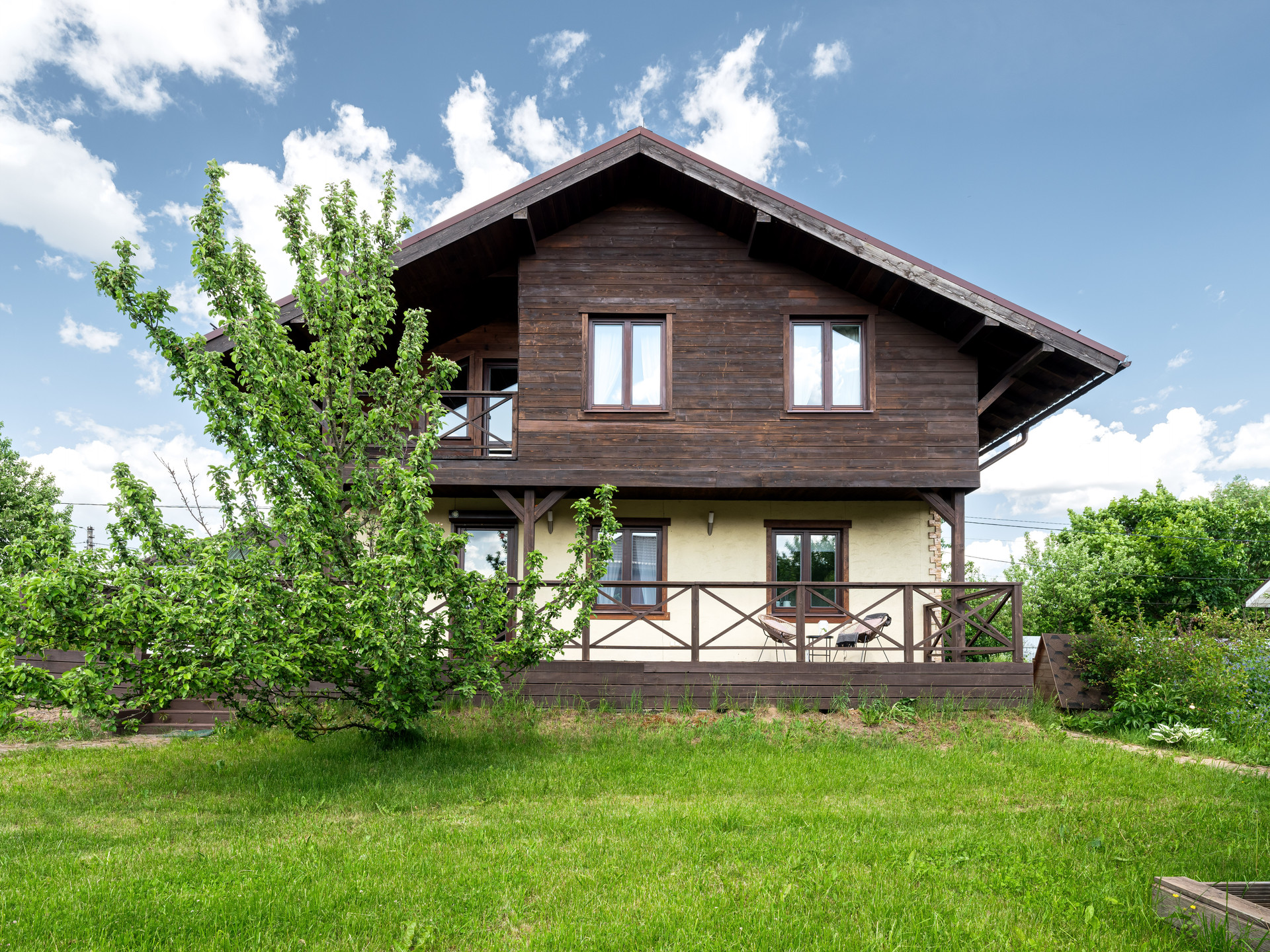Просторный двухэтажный шале в дали от городской суеты. Участок расположен в 16 км от Москвы по Дмитровскому или Ленинградскому шоссе (в пригороде Лобни).