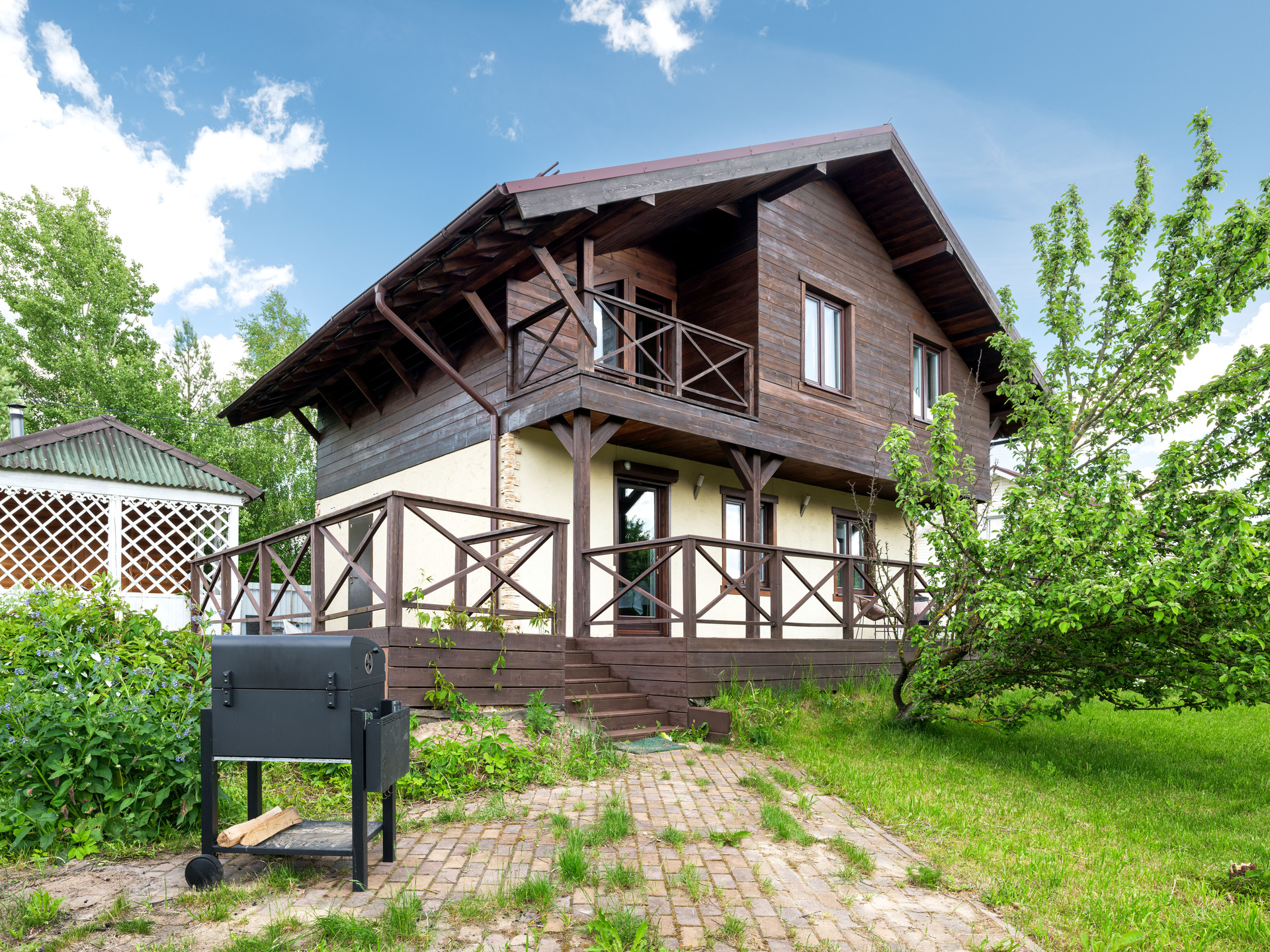 Детская площадка и зона для барбекю с грилем.