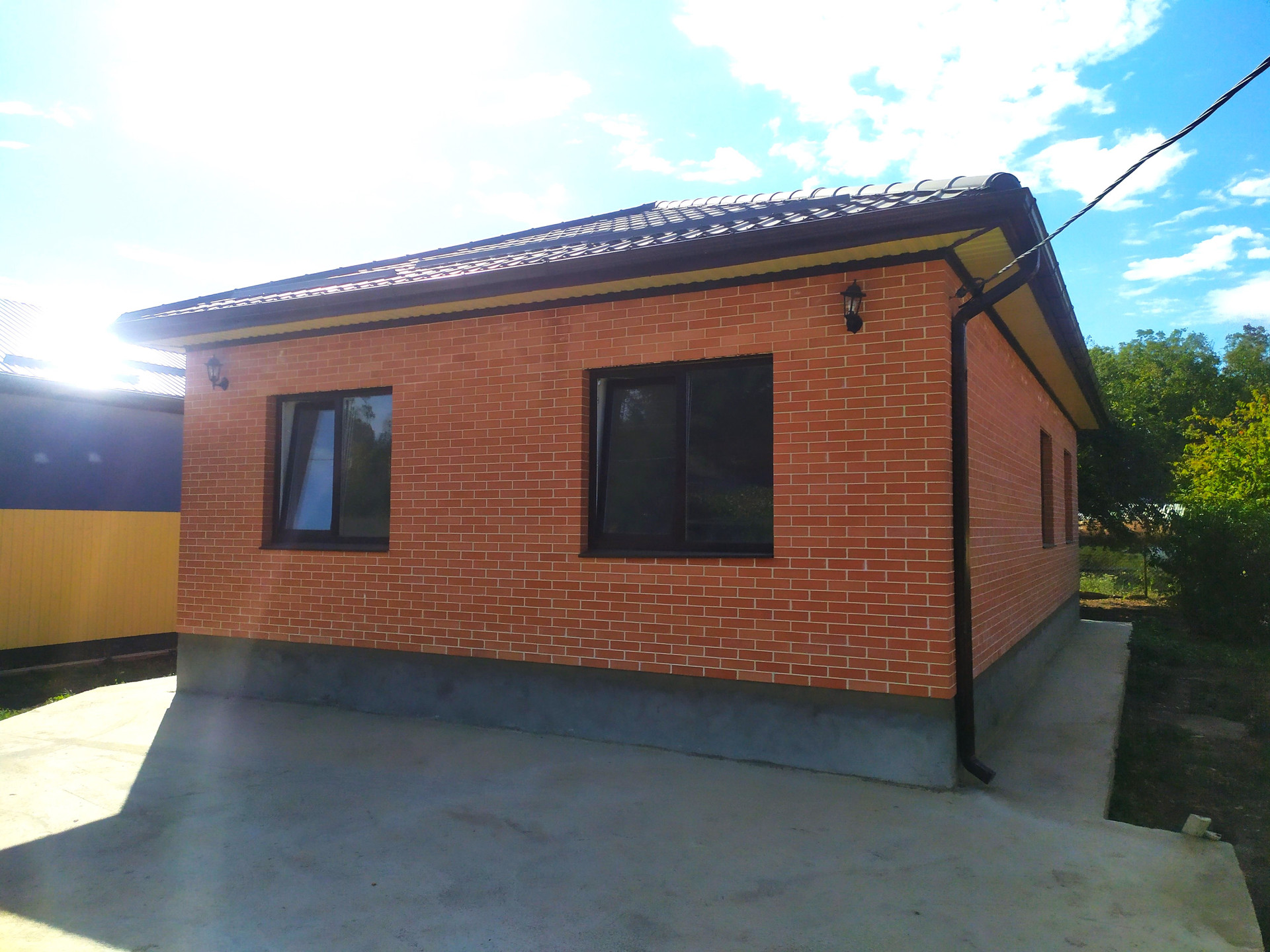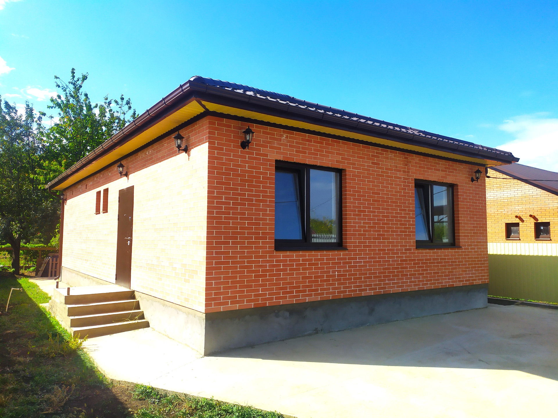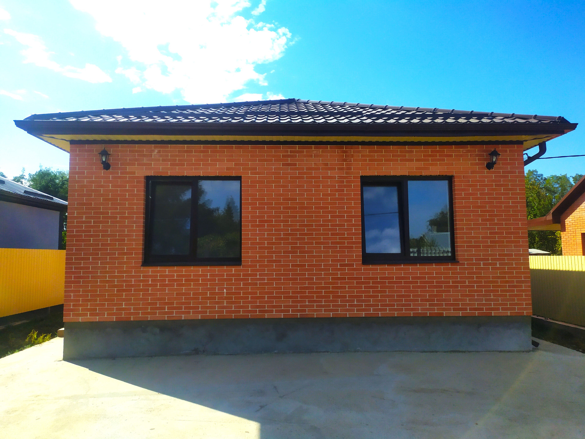 По периметру дома — бетонная отмостка. Внутри участка — забетонированная площадка для автомобиля, откатные ворота, калитка, с фасадной стороны — забор из профнастила.