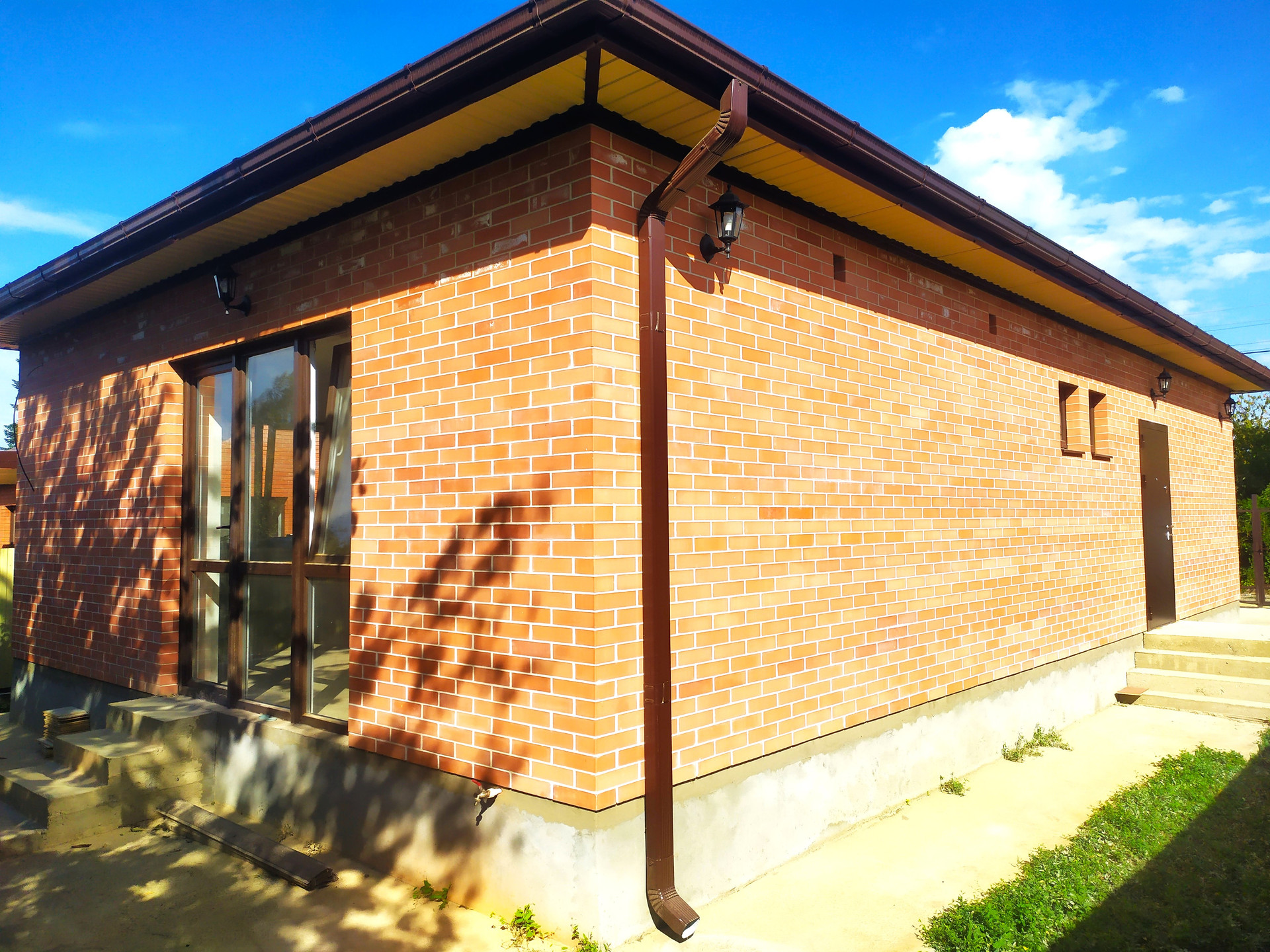 Возведен на ленточном фундаменте, стены — газоблок, утеплитель, наружные стены — керамический кирпич, металлопластиковые окна с внешней ламинацией, кровля — металлочерепица, входные двери.