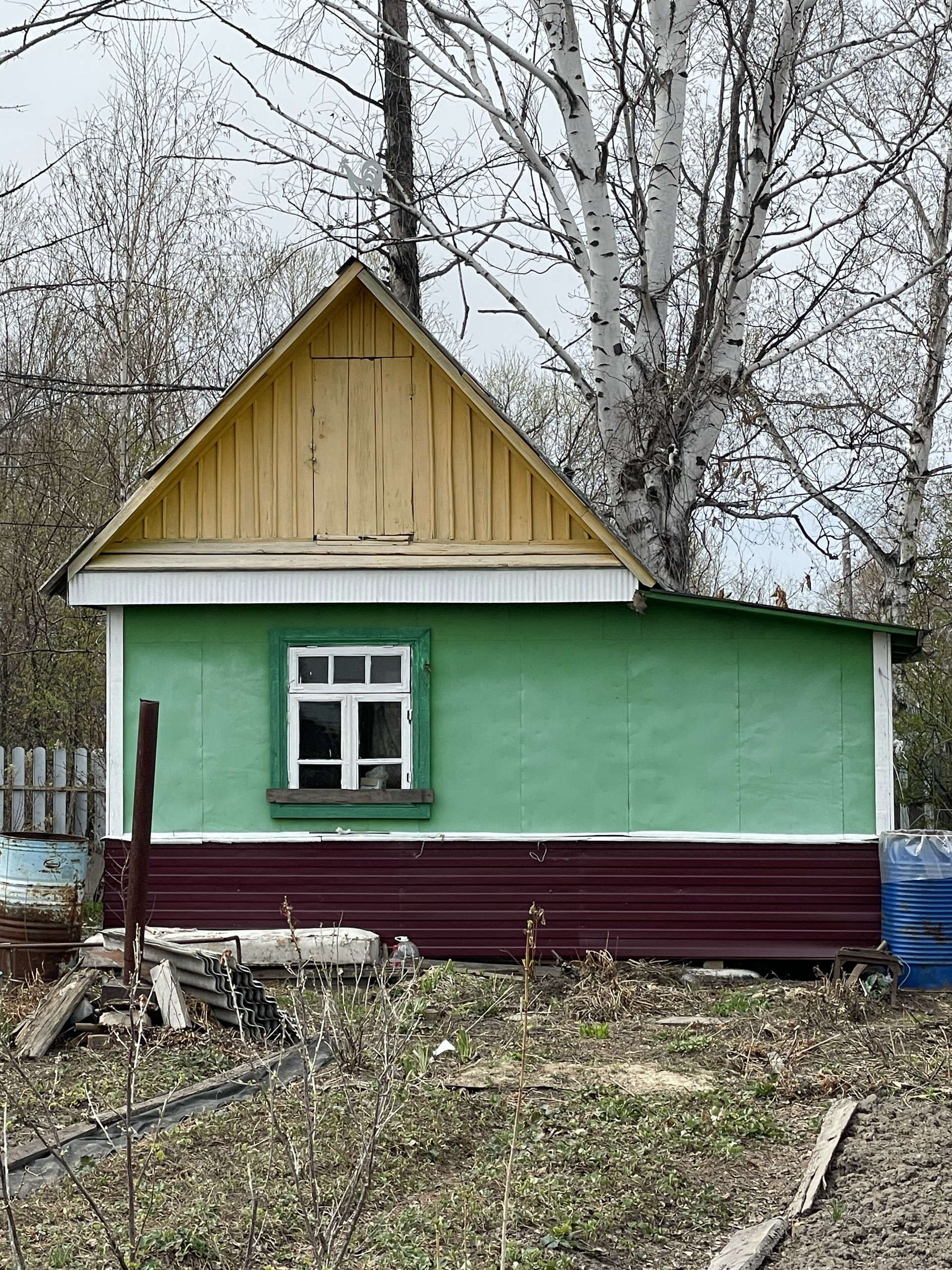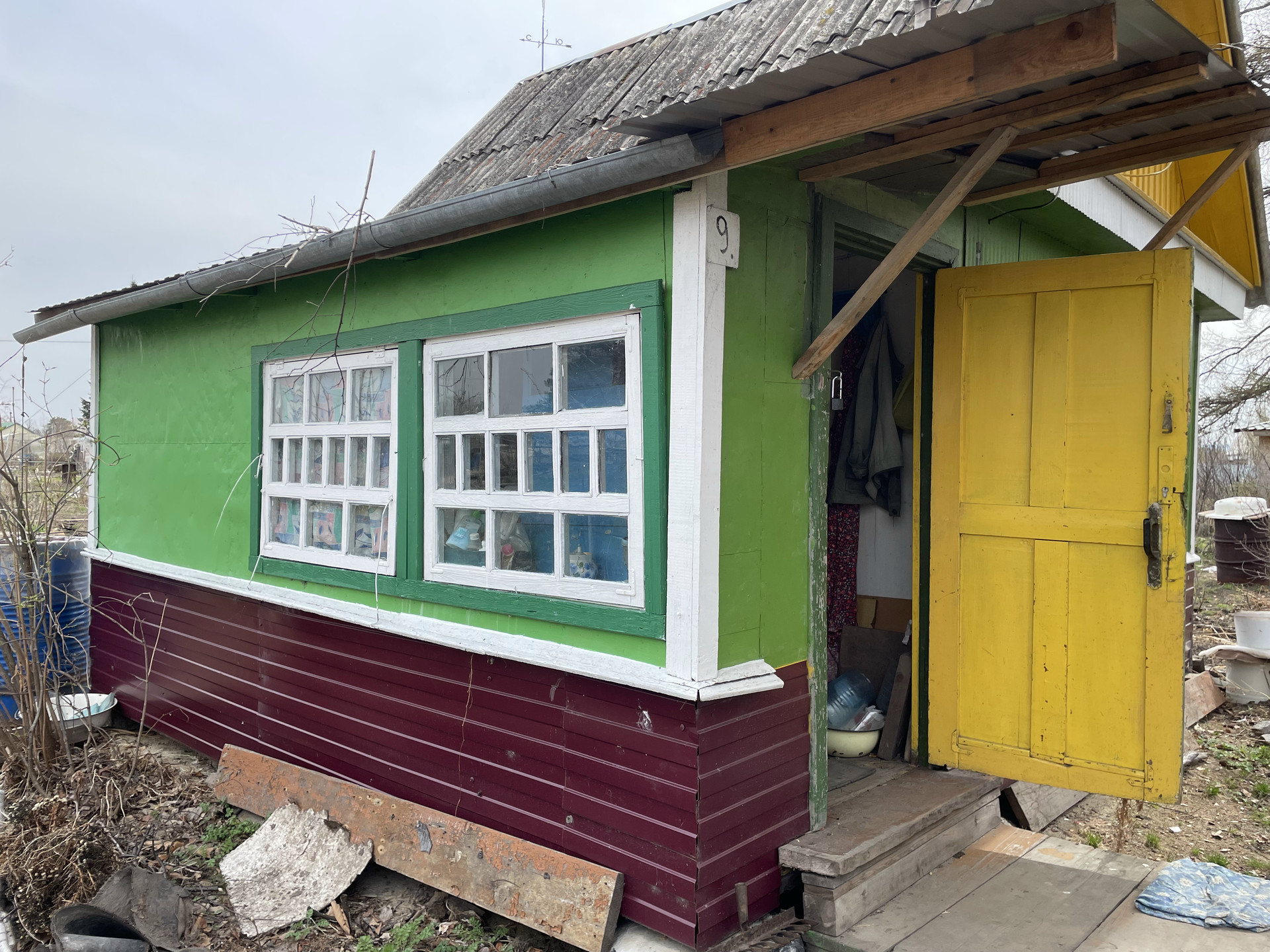 Дачный летний дом- комната и веранда. Из мебели в комнате имеется 1 кровать, 2 стола, 2 кресла; на веранде 1 стол и 3 стула, так же имеется кладовка под инструменты. В 2023 году в доме был полностью заменен пол и дом поднят. На данный момент дом в процессе косметического ремонта (материал куплен находится на даче в доме). Окна выходят на все стороны, дом очень светлый. Электричество проведено, на участке установленна новая колонка, новая уборная и новый забор, так же имеется зона под автомобиль.