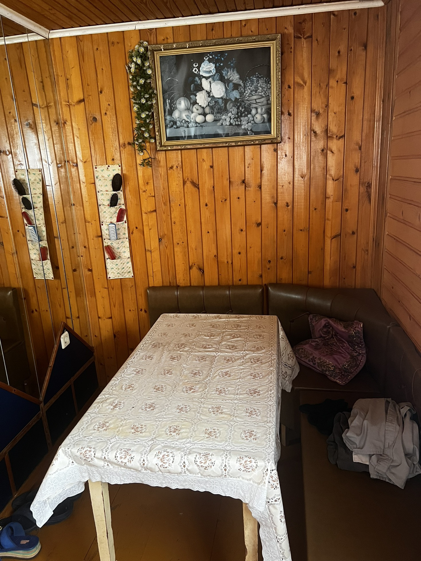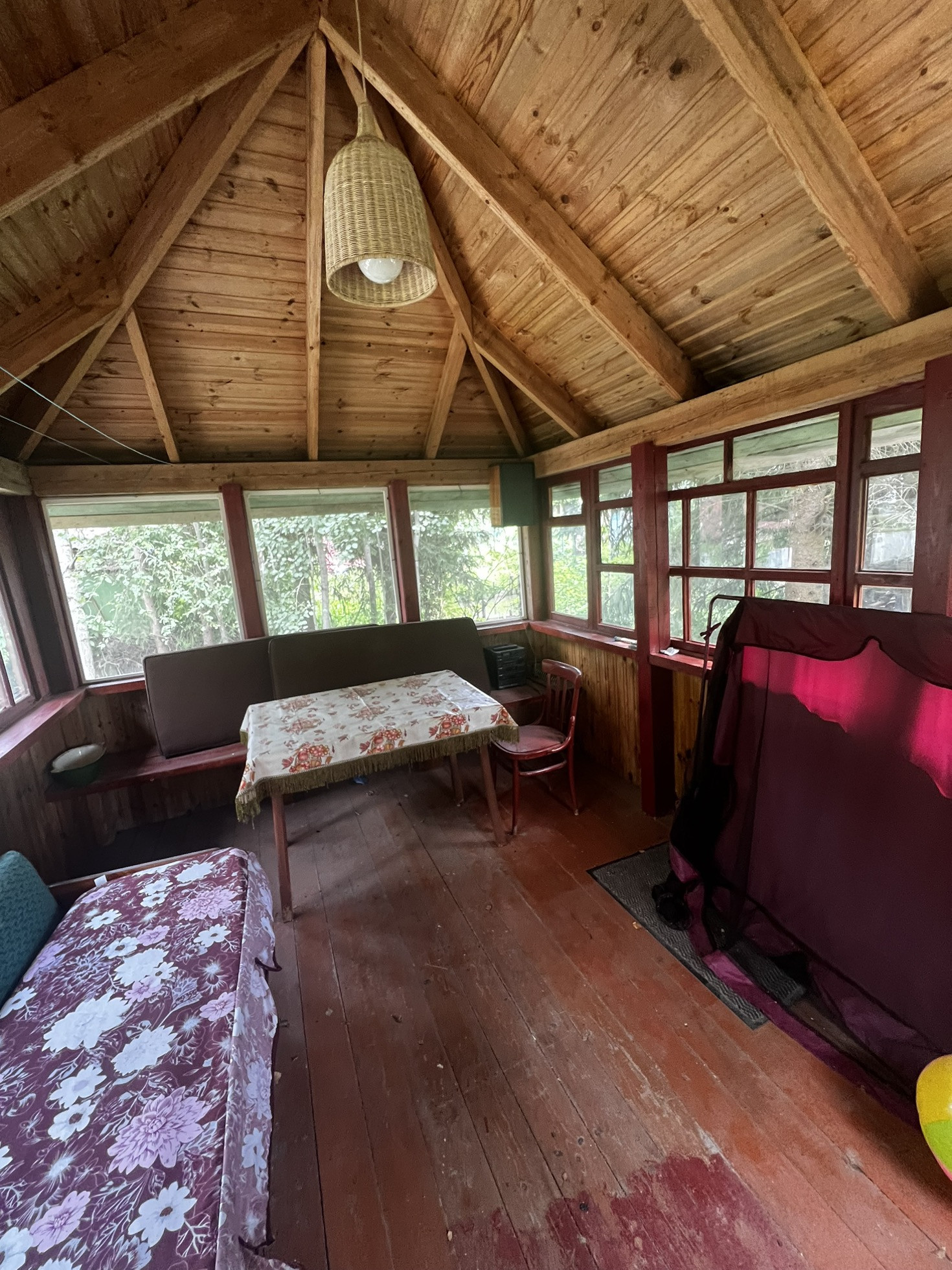 •Застекленная беседка с большим столом, диваном , а рядом расположена зона барбекю с мангалом и умывальником.