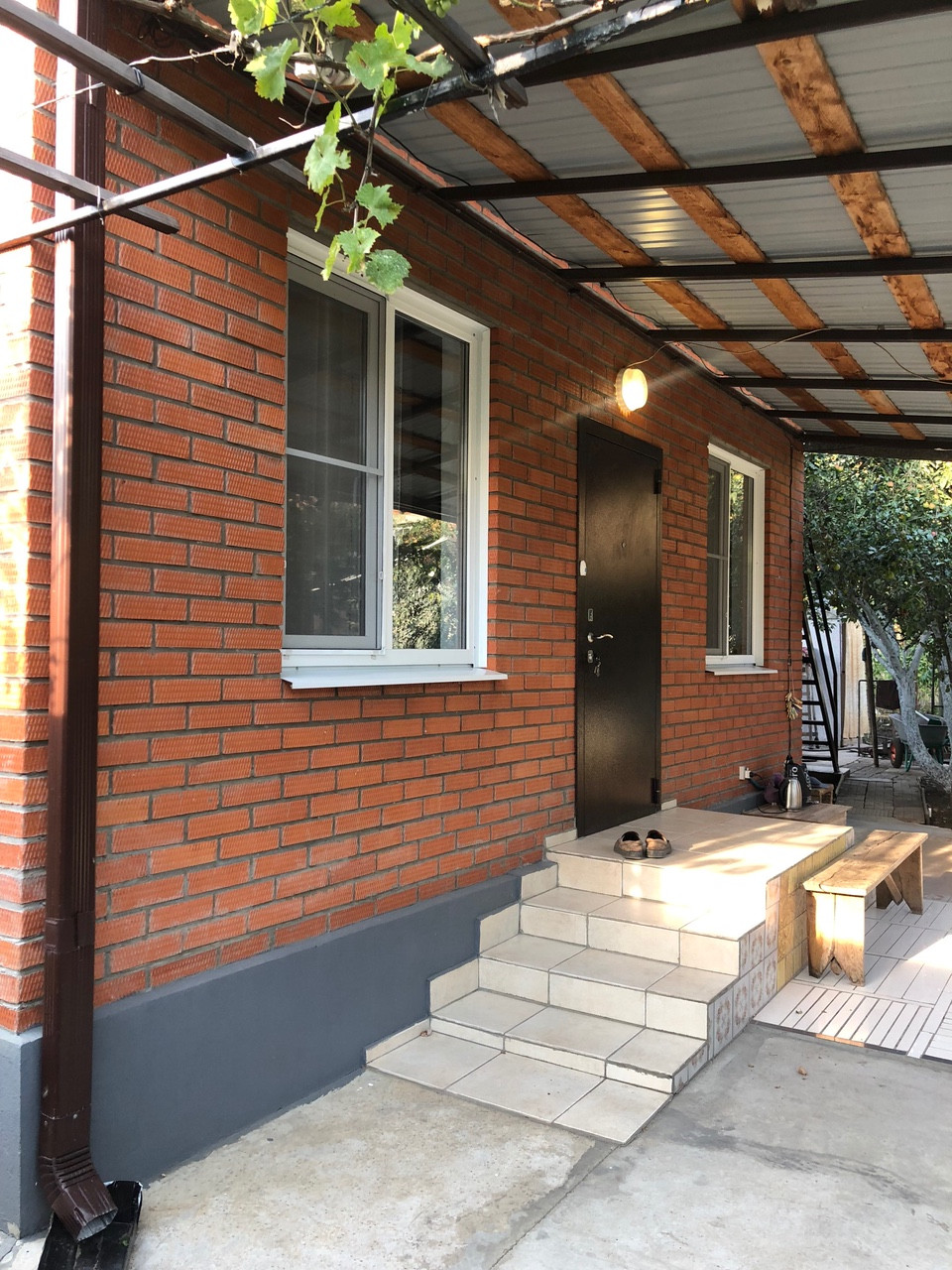 Во дворе постройки - летняя кухня, мангал, отдельная кладовая, летний душ, туалет и помещение для садового инвентаря. Двор под навесом, забетонирован и выложен плиткой.