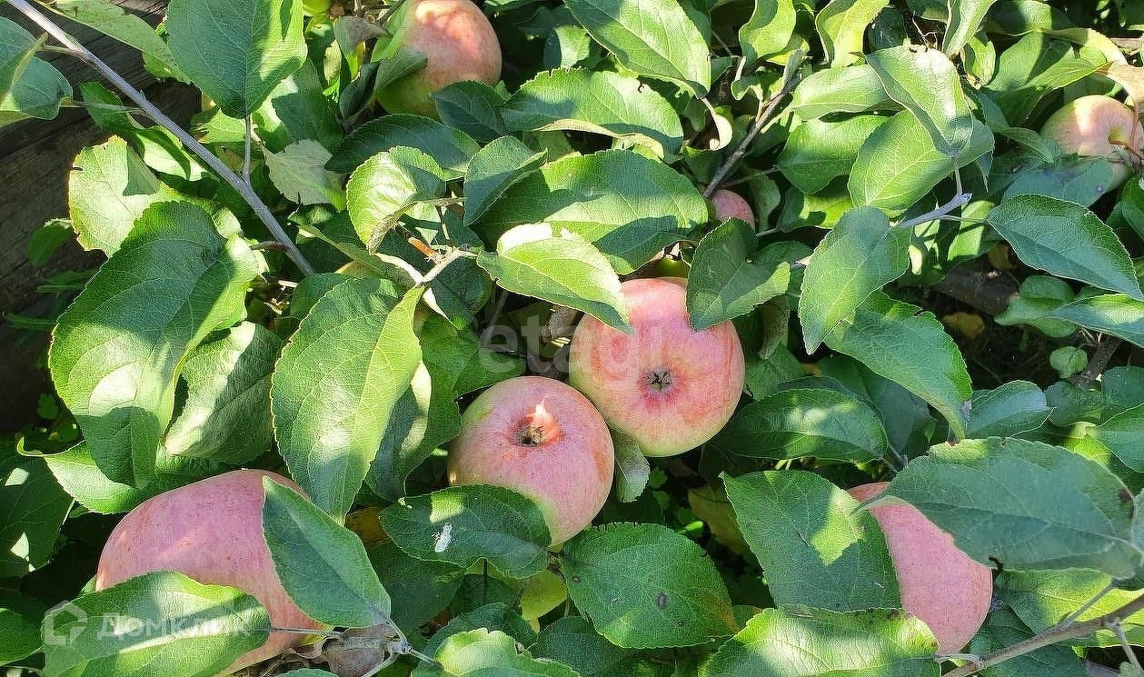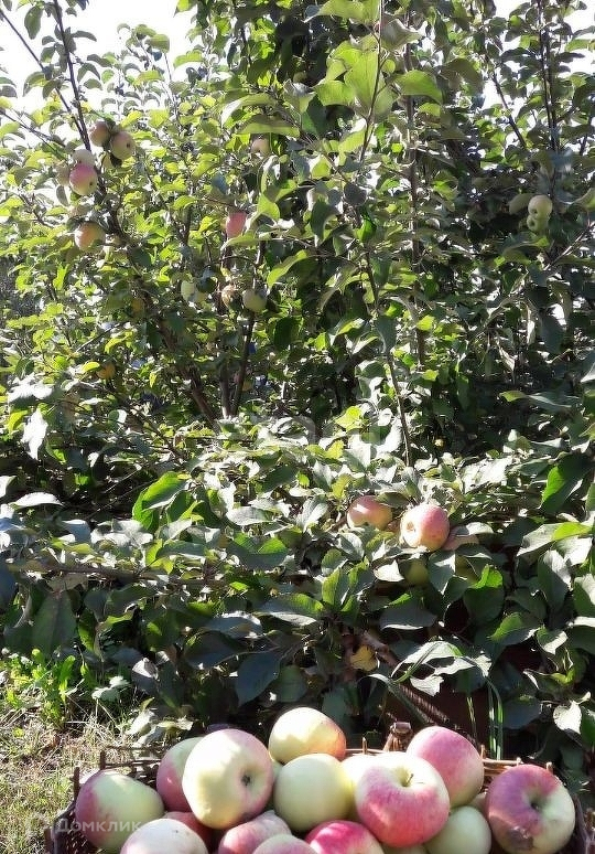 На участке газон, посадки (3 яблони с крупными яблоками, малина, жимолость, облепиха, черная смородина, груша, вишня, клубника).