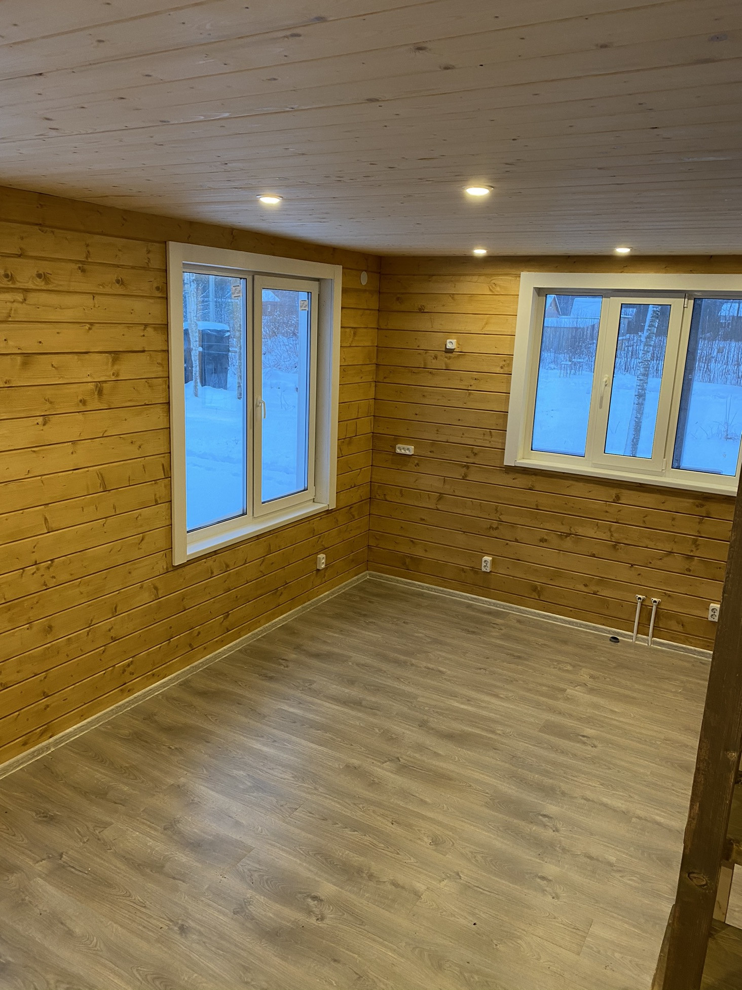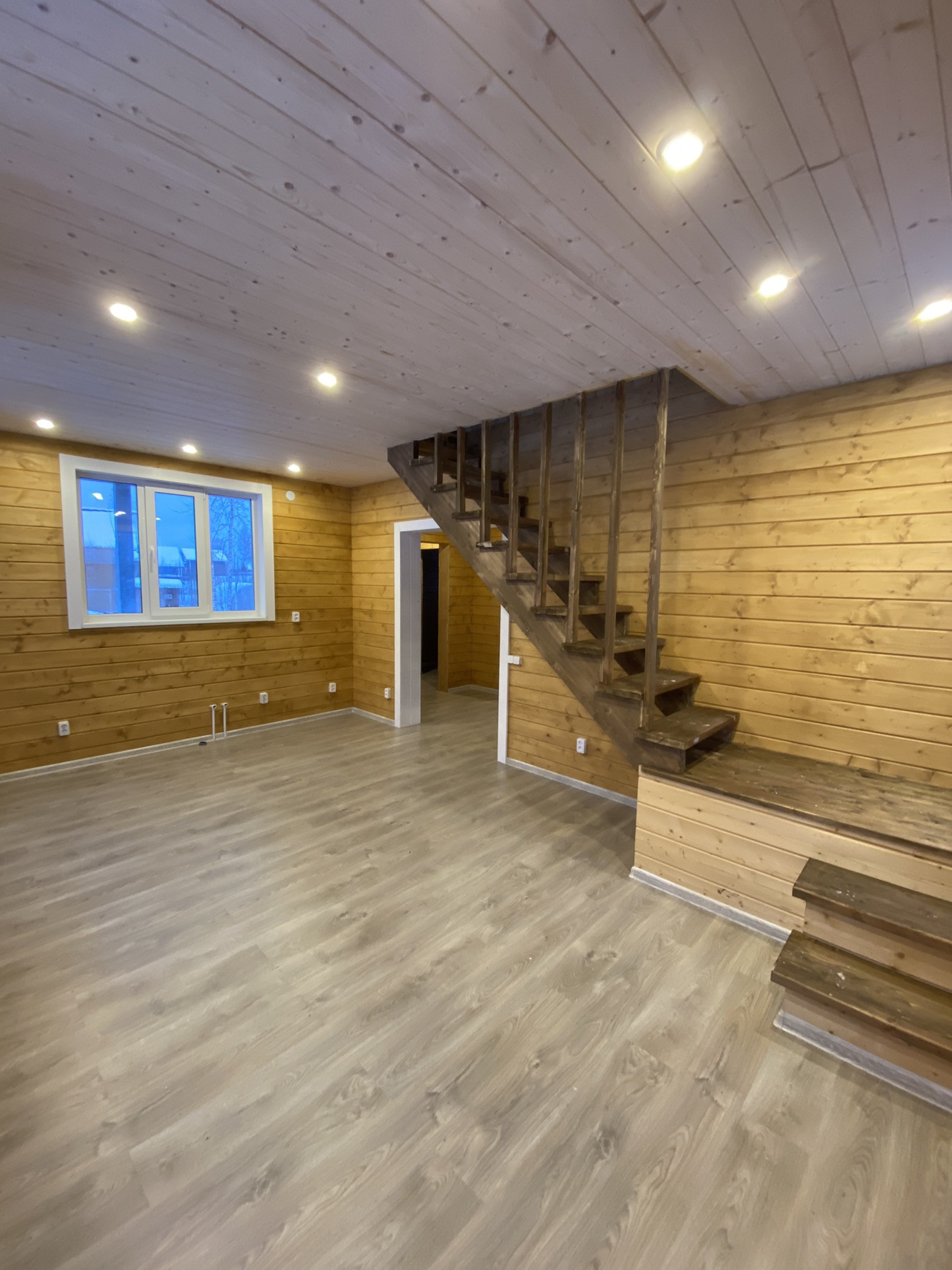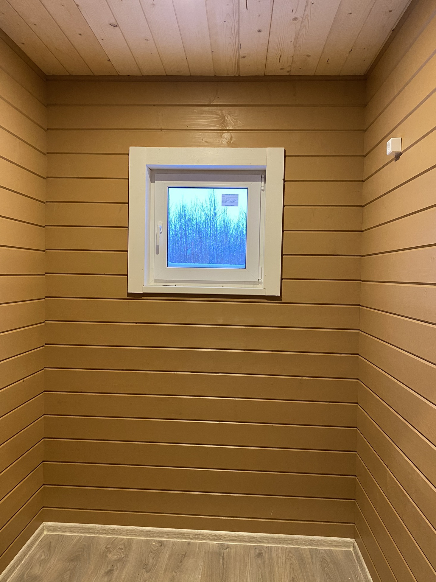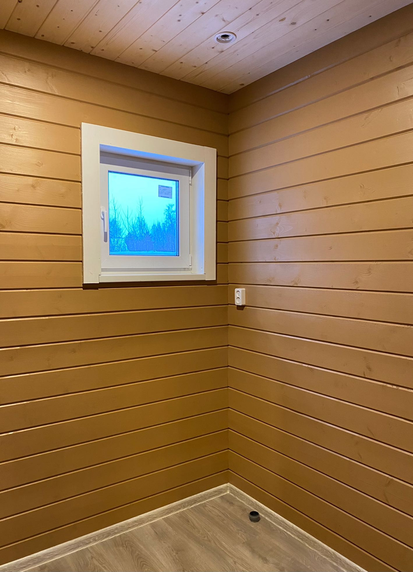 Внутренняя отделка стен и потолков из Имитации бруса, на полу ламинат.