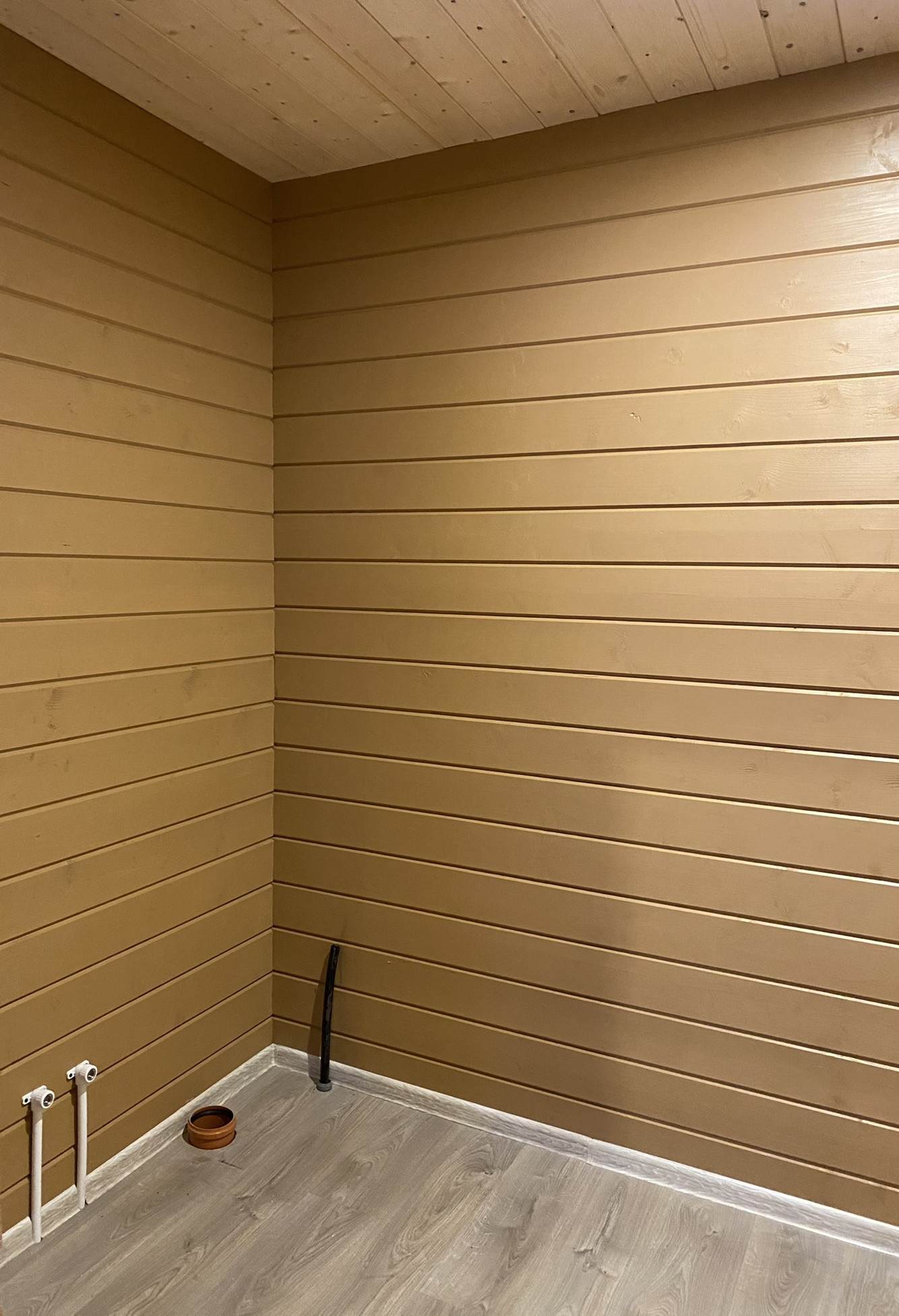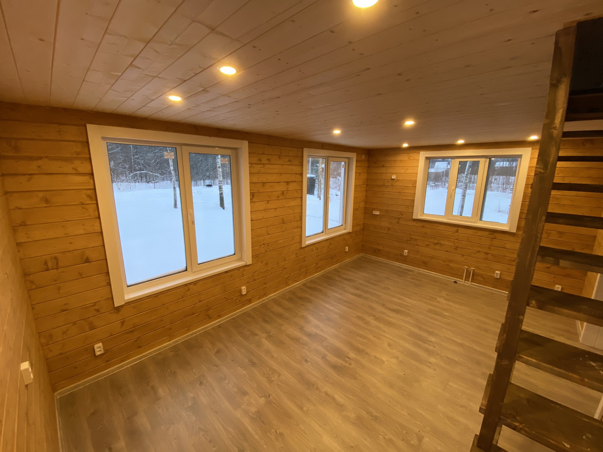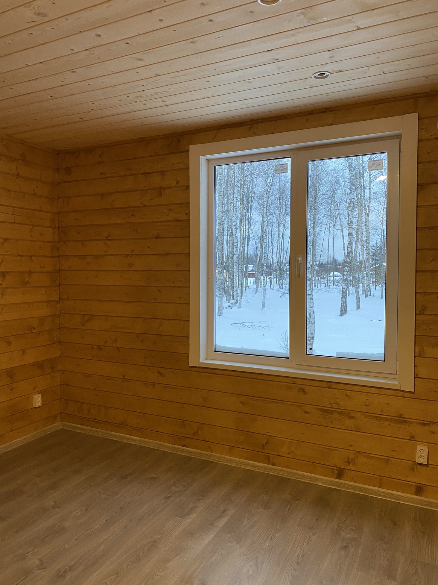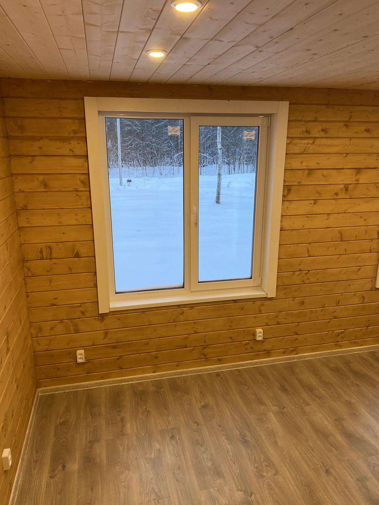 Внутренняя отделка стен и потолков из Имитации бруса, на полу ламинат.