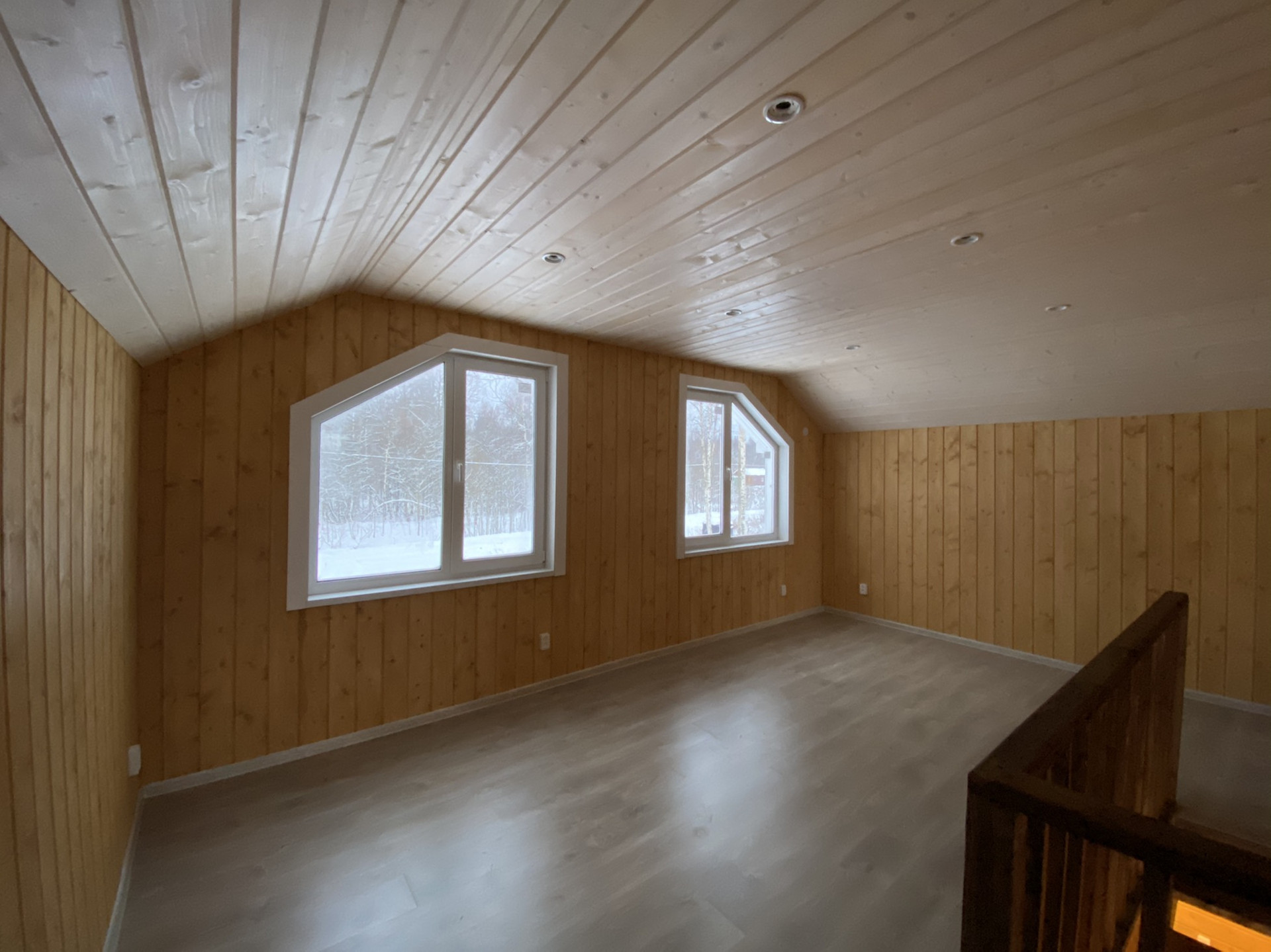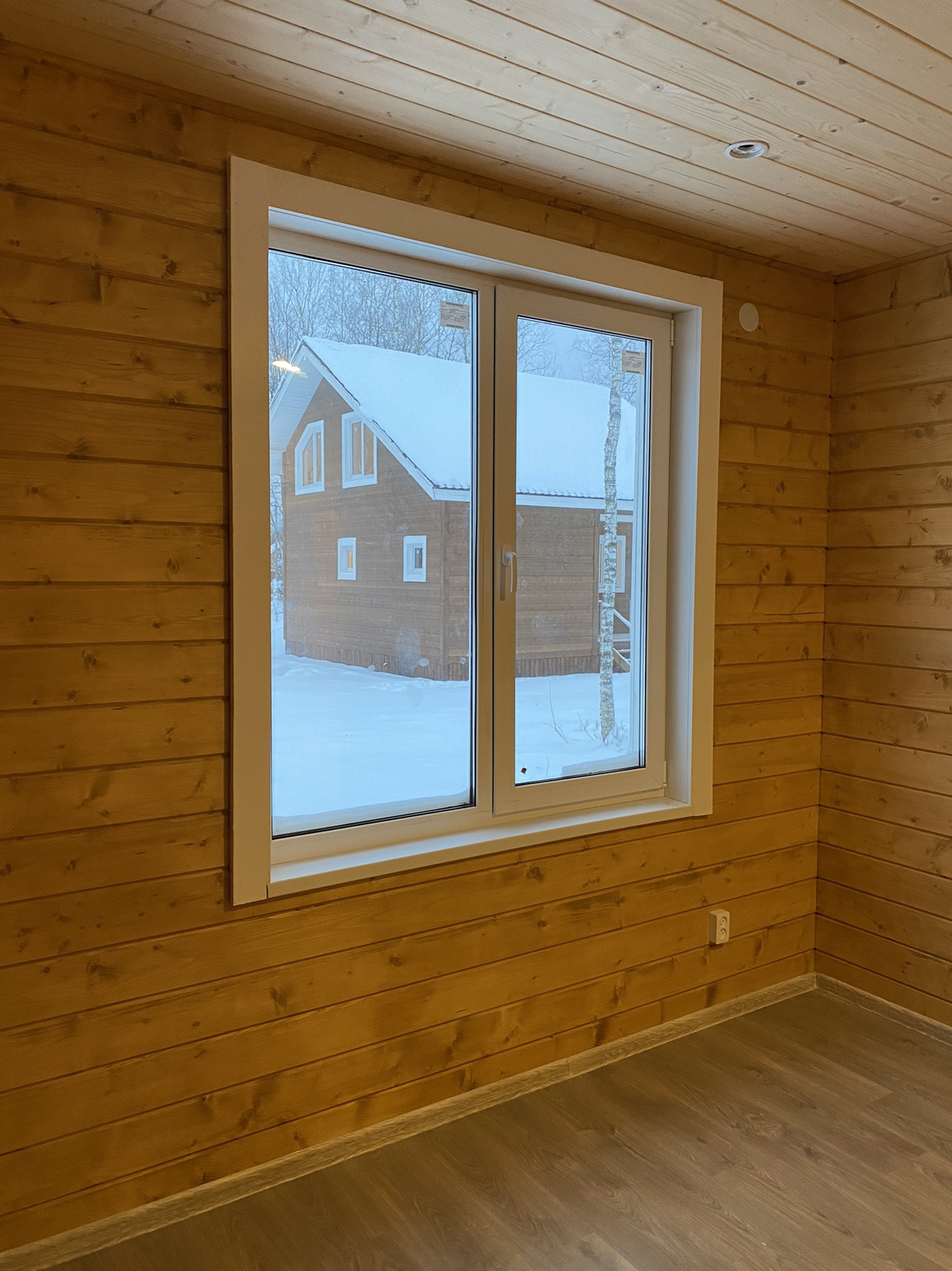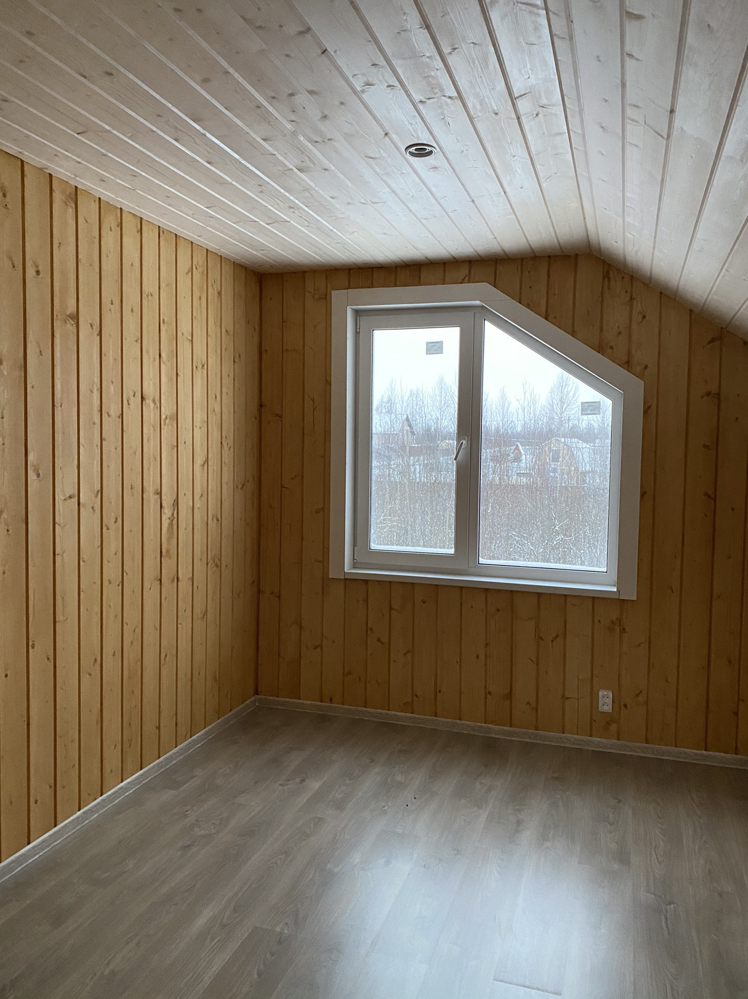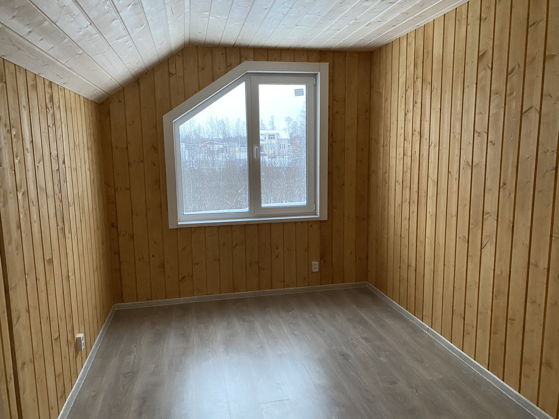 Внутренняя отделка стен и потолков из Имитации бруса, на полу ламинат.