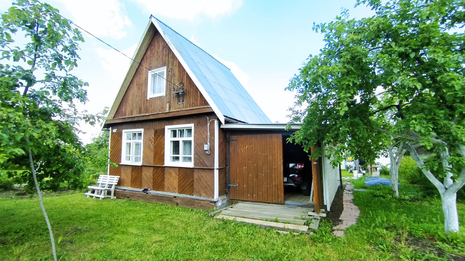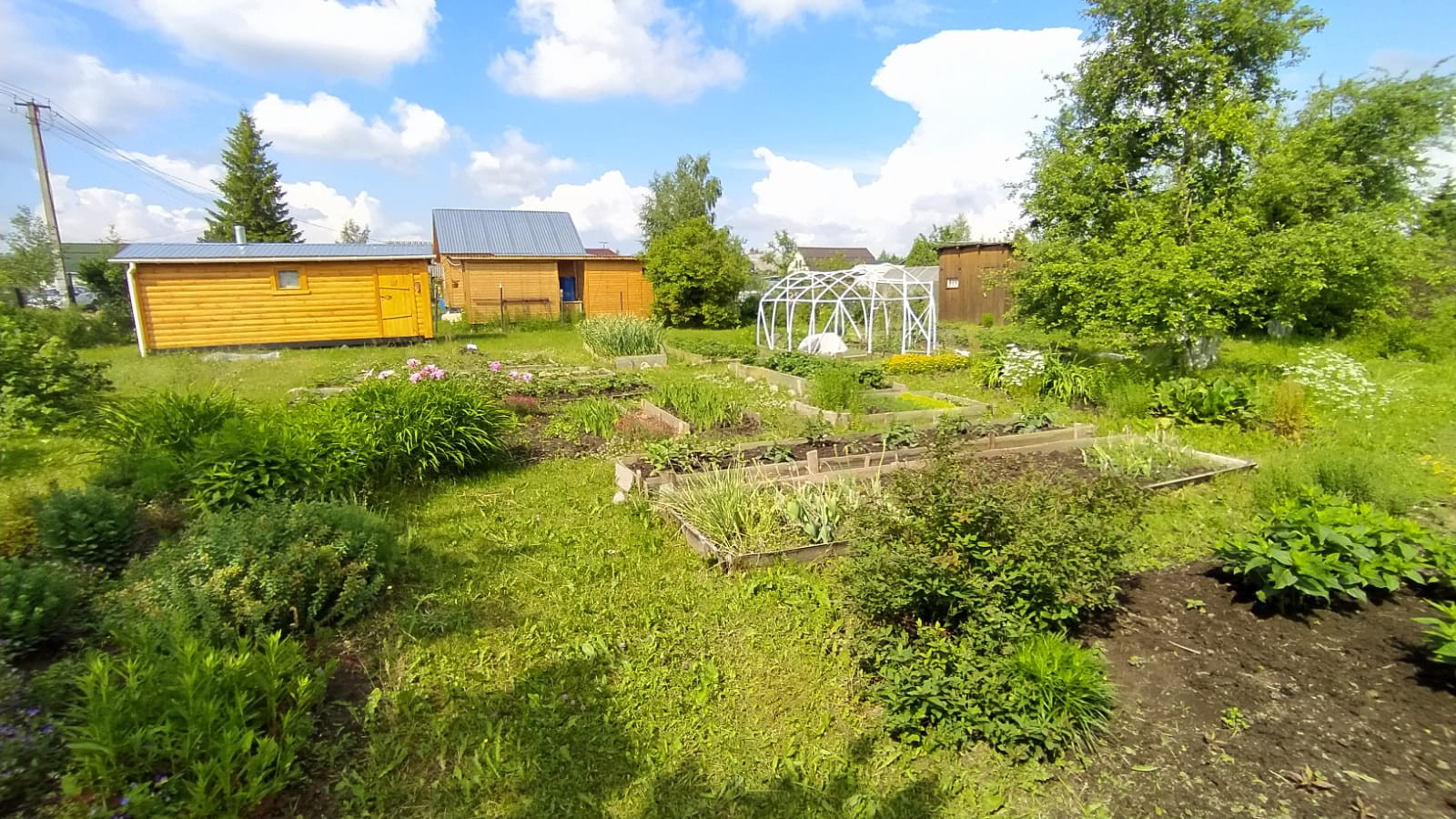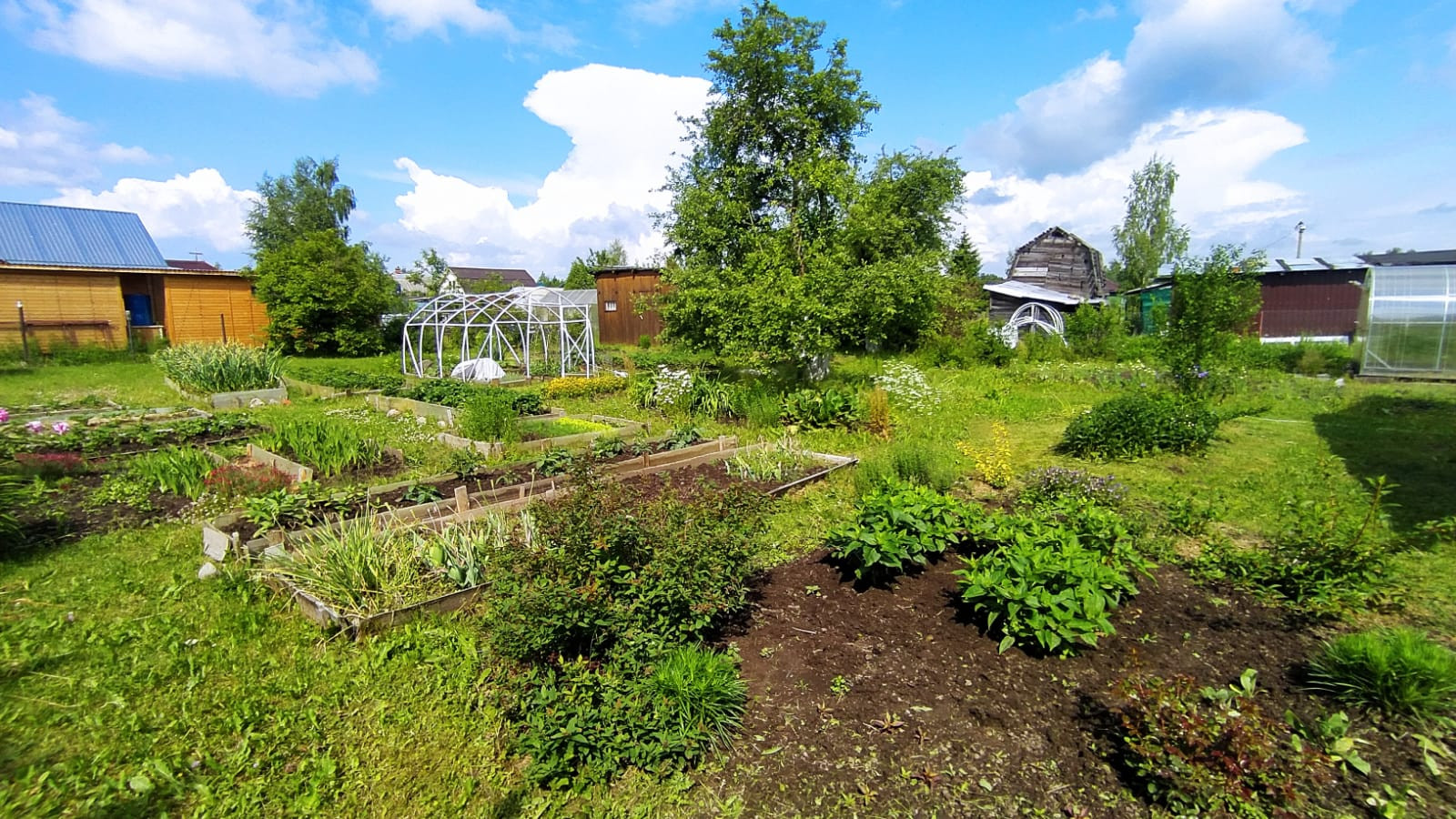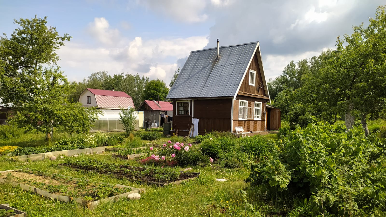 Есть плодовые деревья, кусты смородины, крыжовника, грядки с клубникой и не только, большое количество разнообразных цветов.
