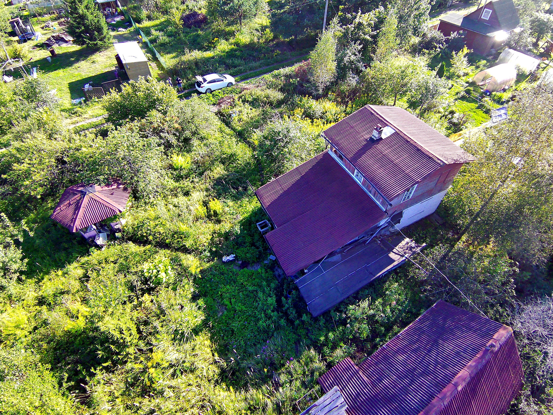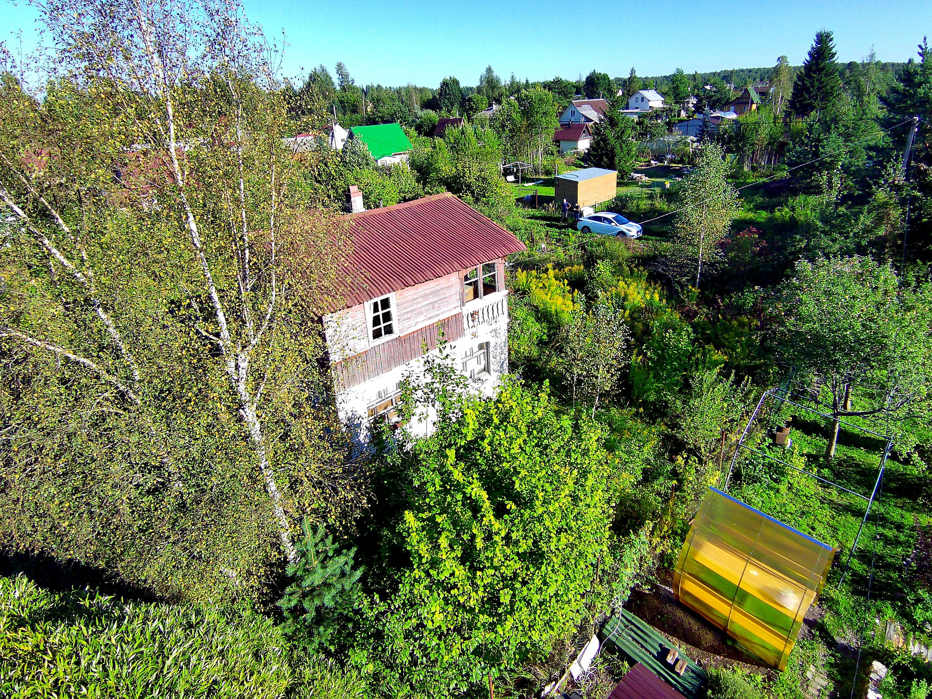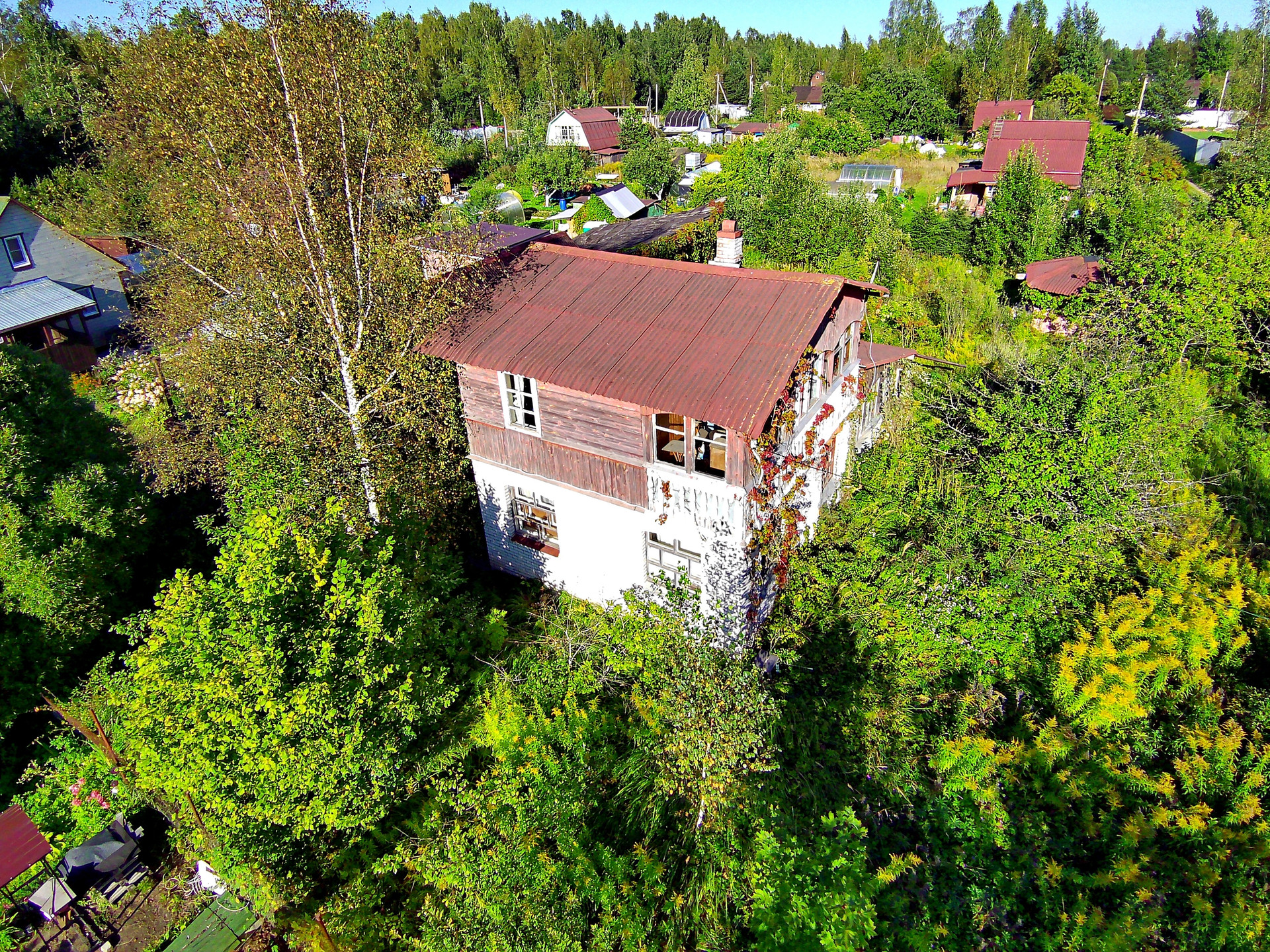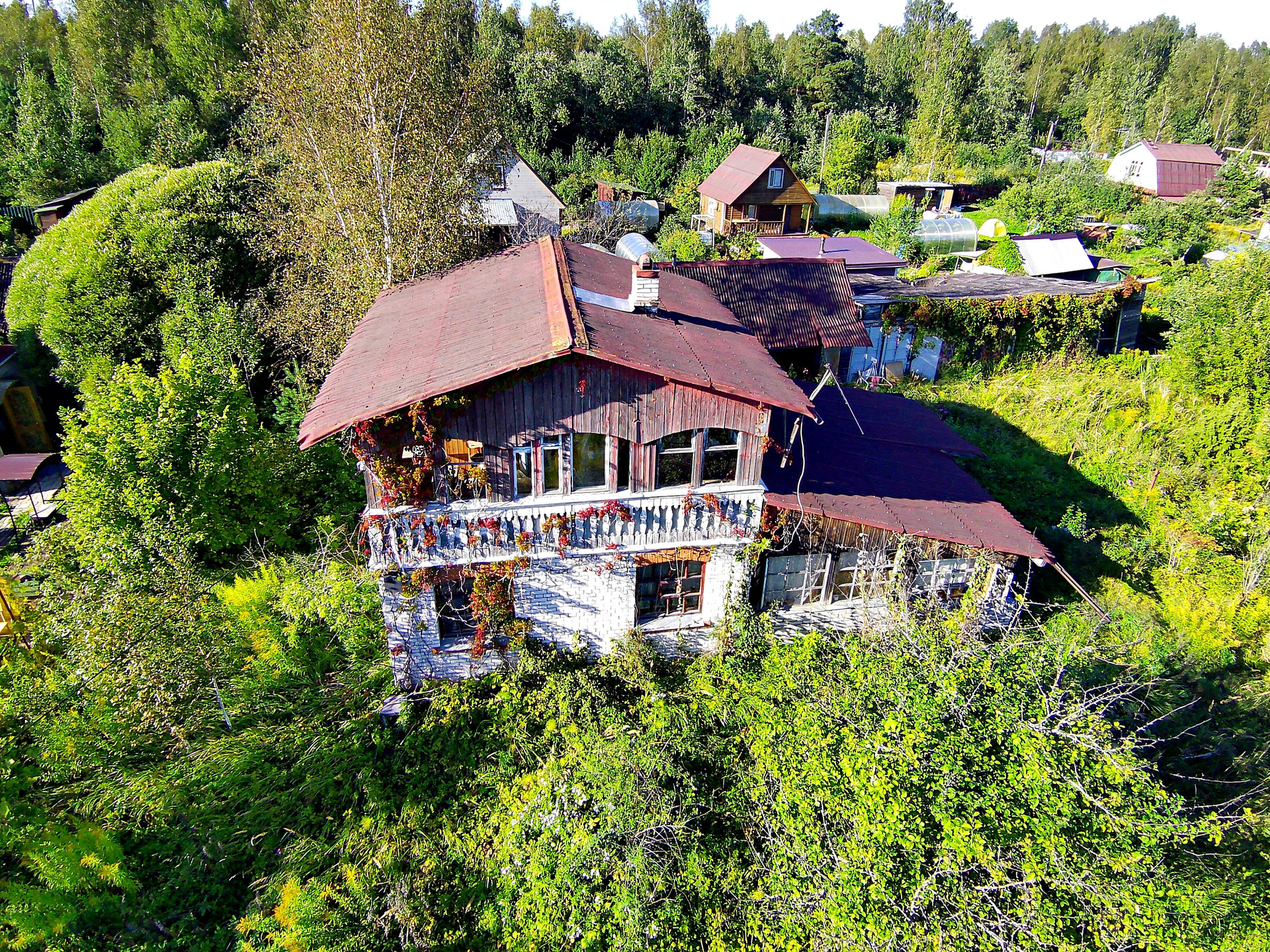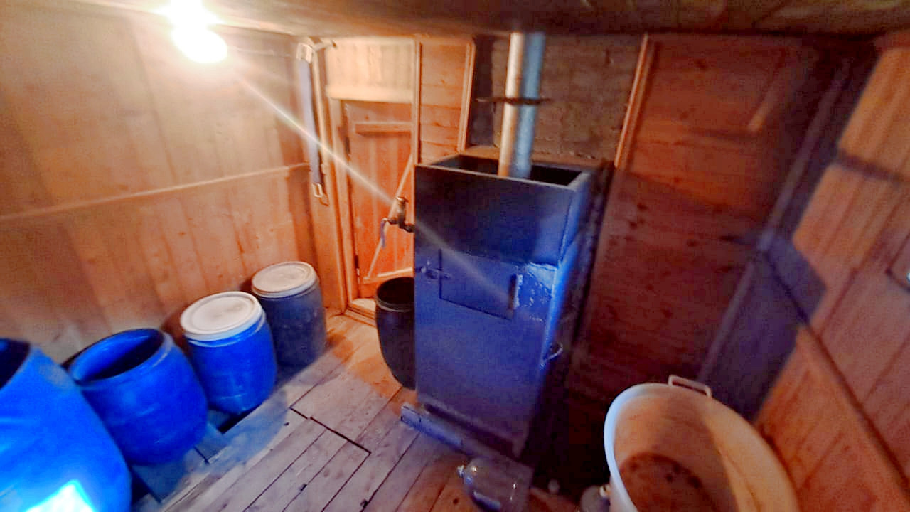 Дом построен в 1995 году. Расположен на ленточном фундаменте, сделана бетонная отмостка. Первый этаж выложен из кирпича, второй каркасный. Отапливается печкой, которая не дымит, периодически протапливается. На первом этаже расположены две жилые комнаты и холл. На втором этаже одна жилая комната, балкон и холл. К дому пристроена летняя кухня, которую можно утеплить. В сарае имеется киссон для хранения заготовок на зиму.