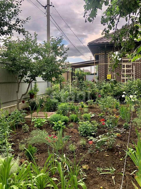 Во дворе взрослые садовые деревья, которые создают полутень на участке в жаркую погоду. Двор облагорожен кустарниками и цветами.