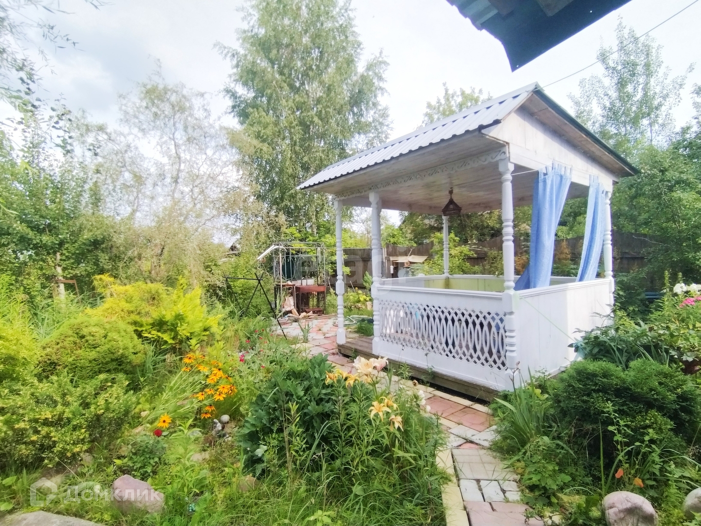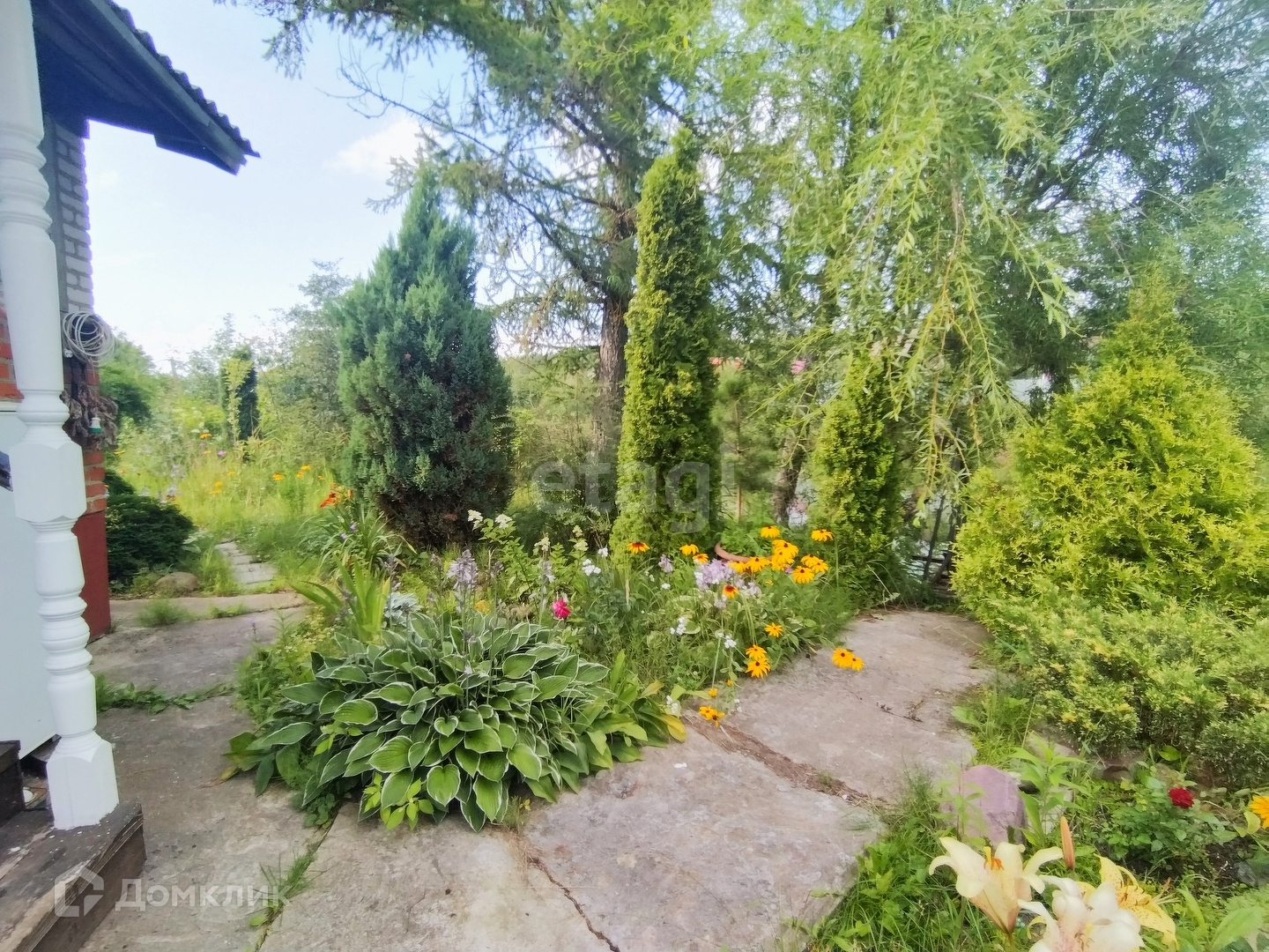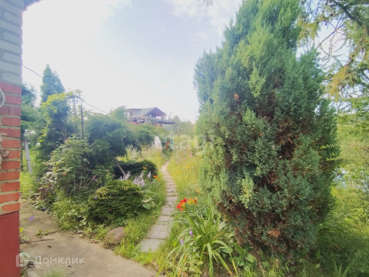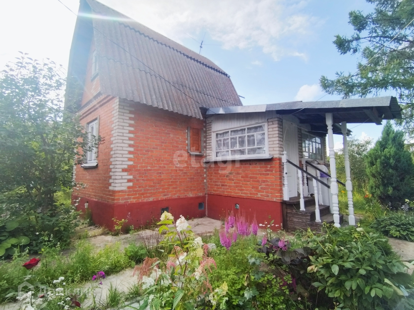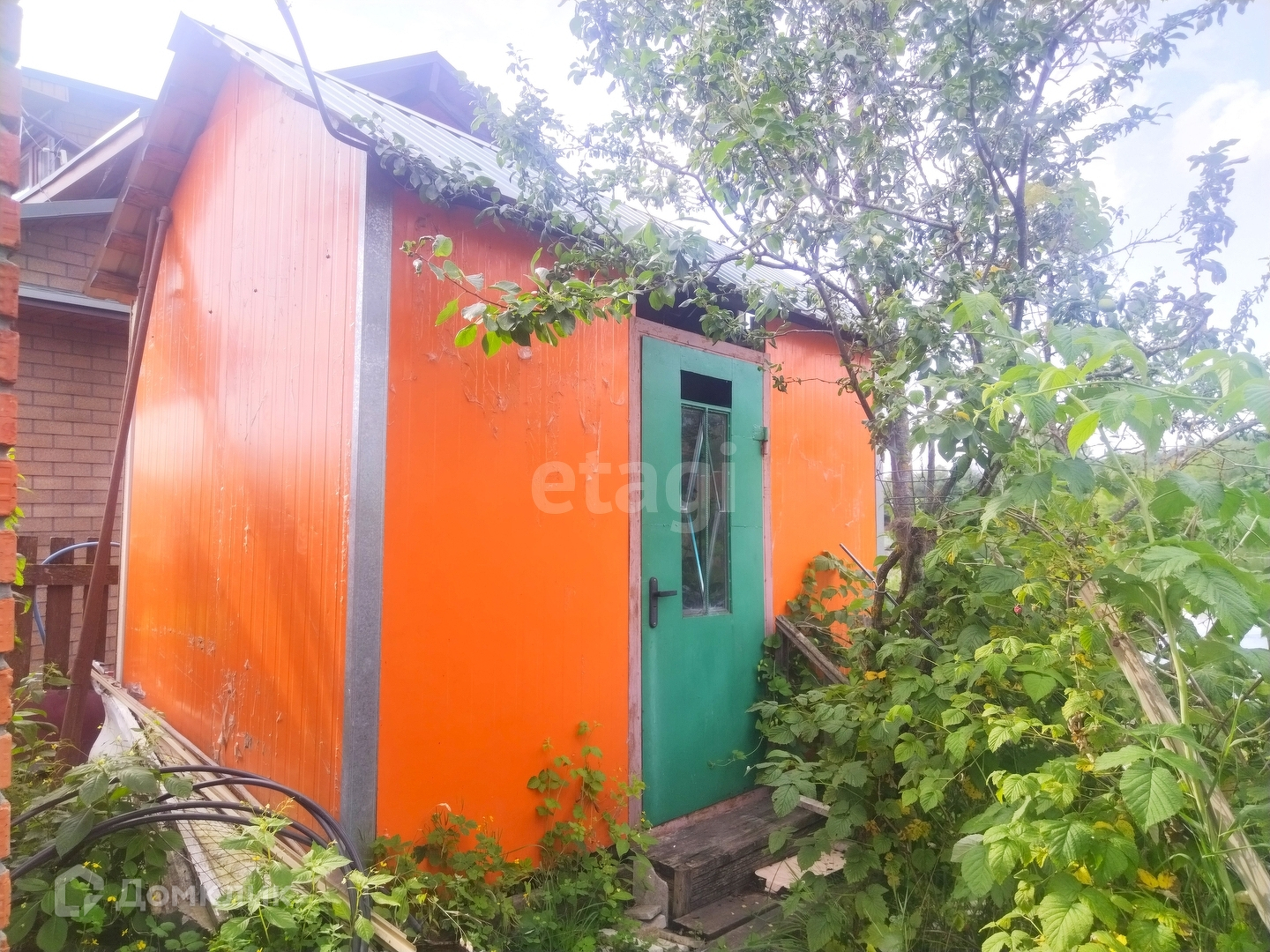На участке расположены две теплицы, много плодовых деревьев, цветов, ягод, хвойных растений, также есть кирпичная постройка - подразумевалась под кухню.