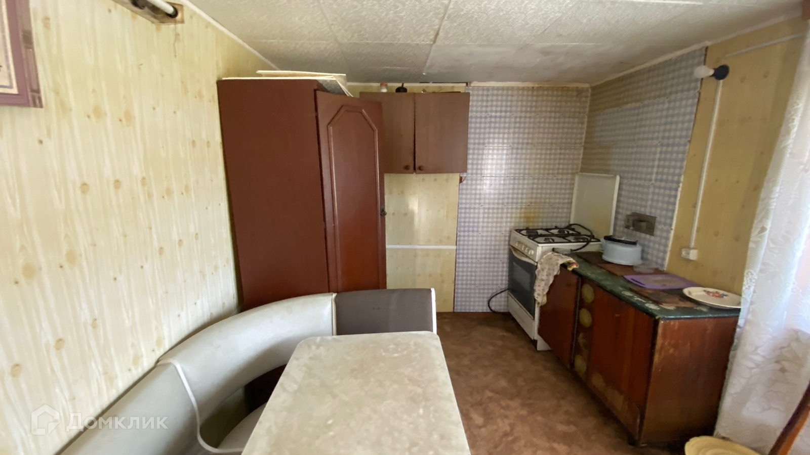 На кухне стоит угловой диван, газовая плита и шкаф.
