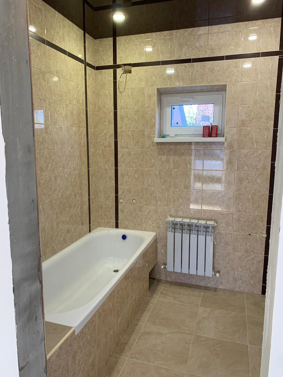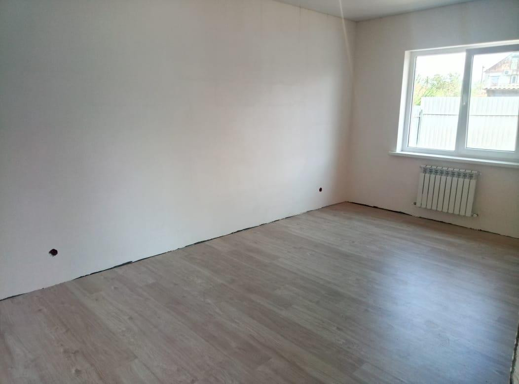 В санузле и прихожей теплый пол и плитка. В комнатах на полу ламинат, натяжные потолки с точечным освещением, стены подготовлены под обои, Установлен газовый котел , сделана разводка отопления по дому, установлены радиаторы отопления. Электричество заведено в дом и подключено, установлен счетчик.