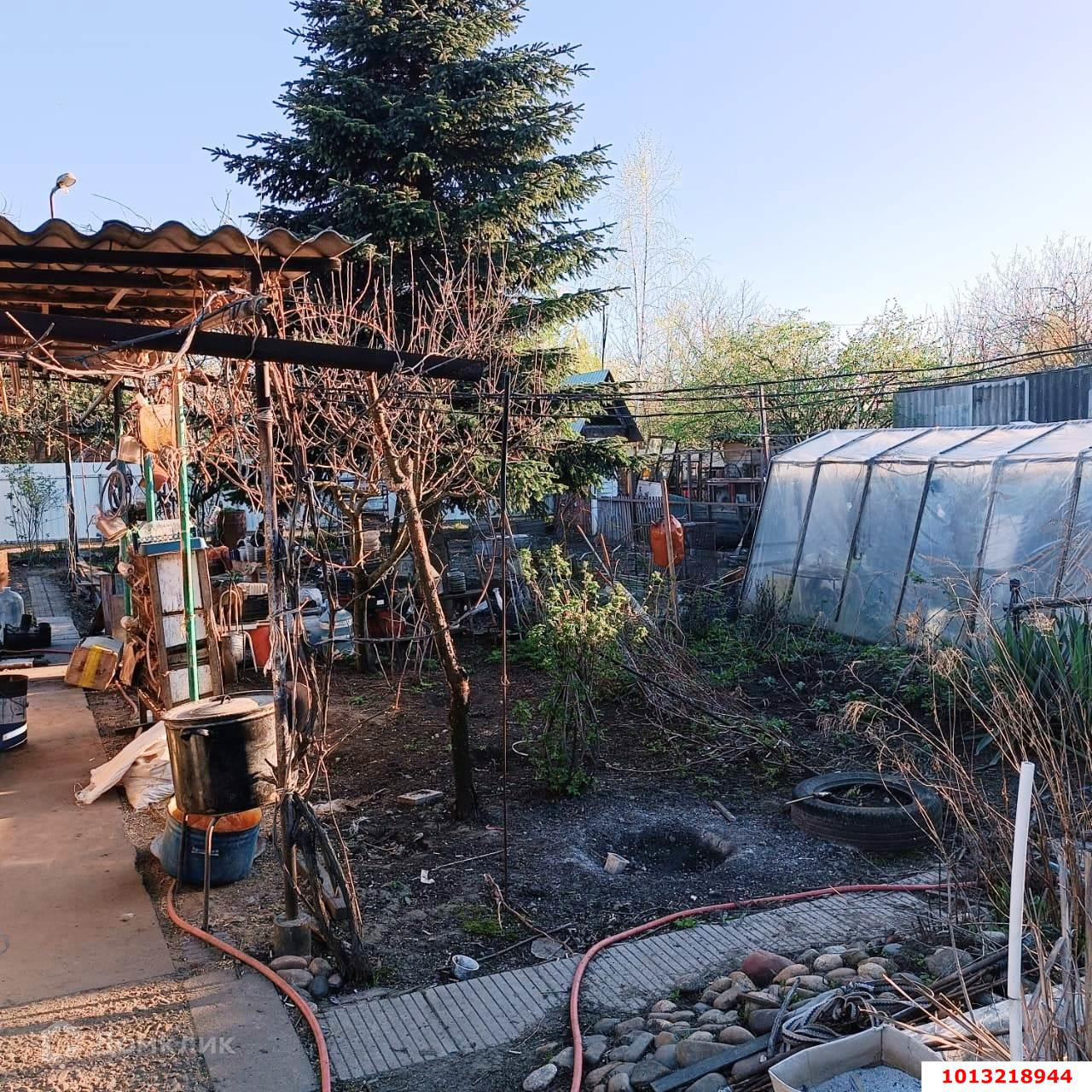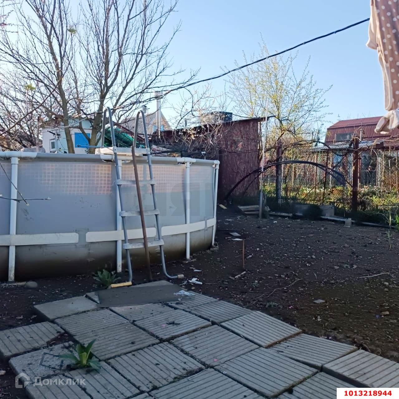 Ровный земельный участок распланирован под зеленные насаждения, плодовые деревья, кустарники. Хозяйственные постройки. Большой  каркасный бассейн. Имеется въезд для автомобиля.