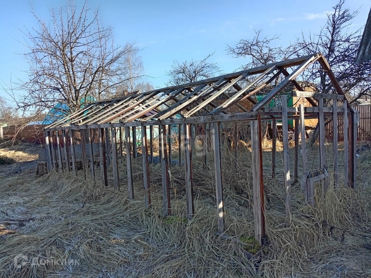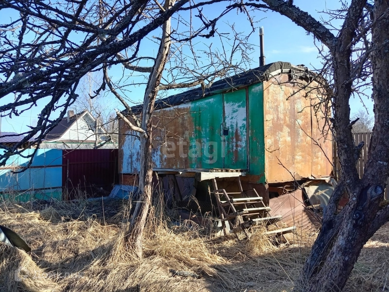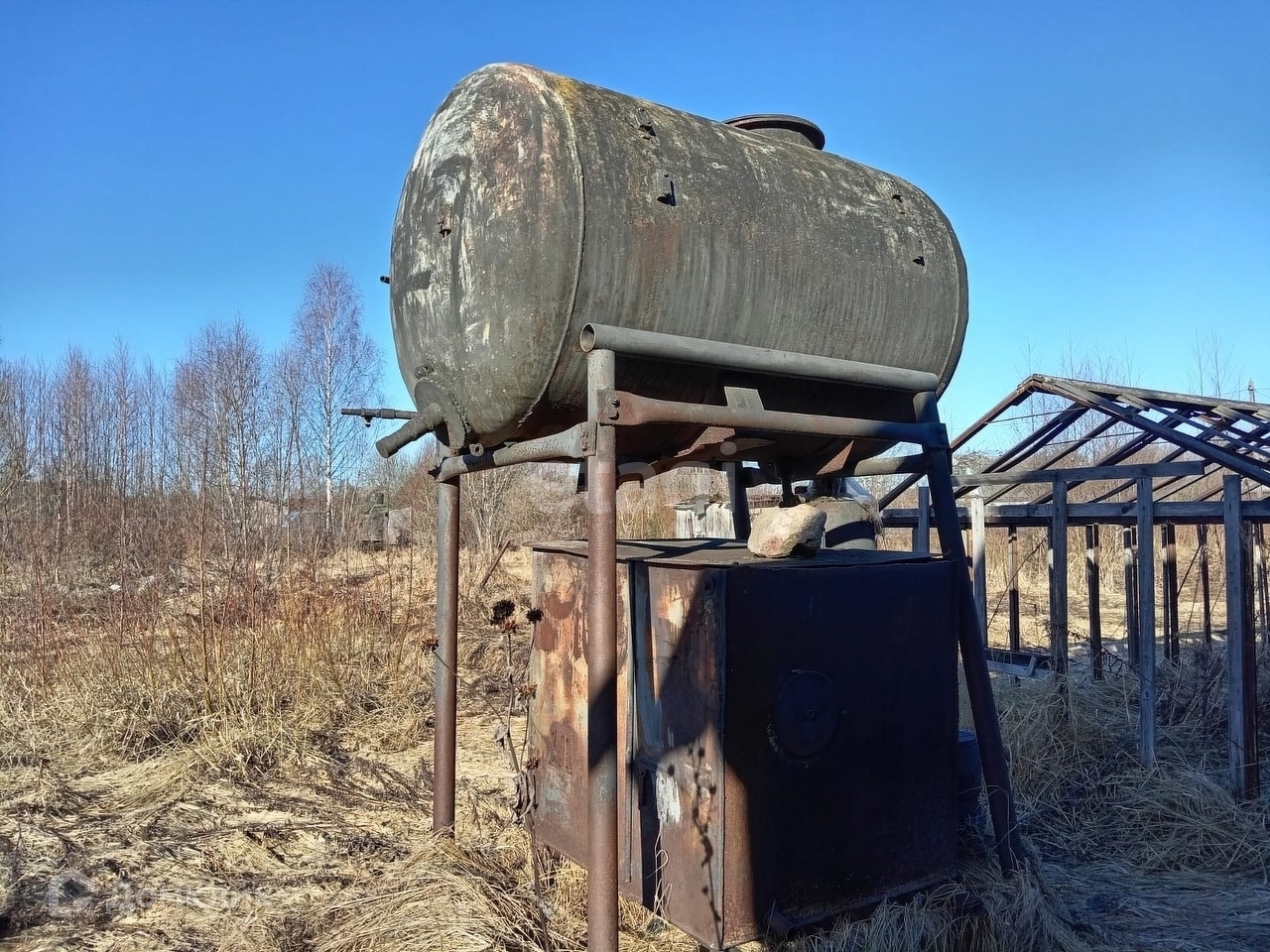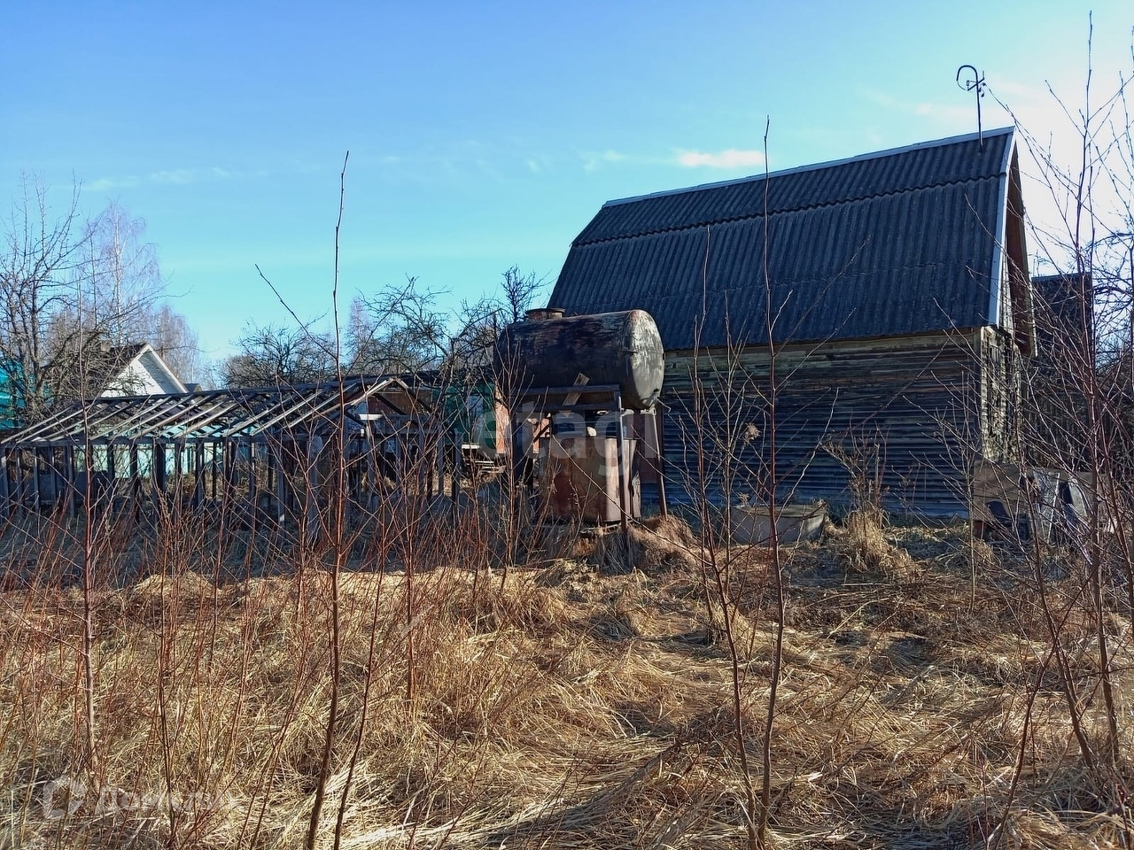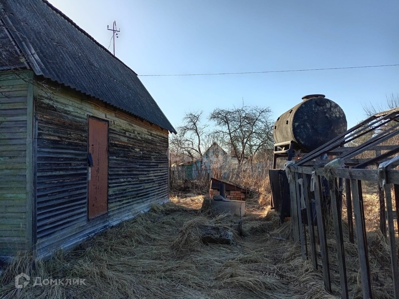 На участке расположен деревянный садовый домик, теплица, железный вагончик, колодец, скважина, резервуар для дождевой воды.