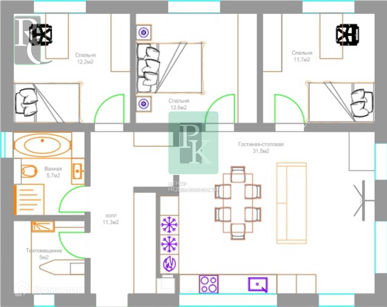 1 этаж, 3 комнаты: кухня-гостиная 31м2 с выходом на террасу, комната 12,2м2, комната 12,6м2, комната 12м2, санузел 6м2 (ванна, раковина, туалет, полотенцесушитель, сделан вывод под стир.машину), котельная-хоз.помещение 5м2