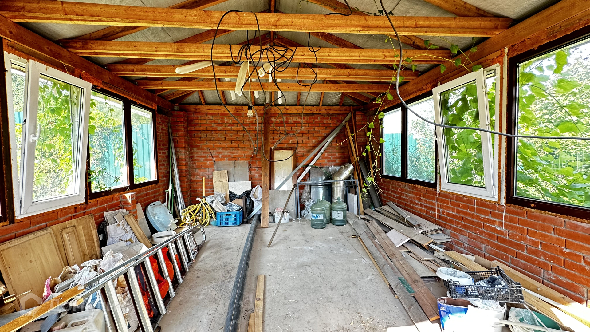 - Теплая беседка. Беседка построена на плите, из красного кирпича, вставлены пластиковые окна, кровля-металлочерепица. По проекту планировалось сделать внутри беседки мангал, для этого подготовлено место.