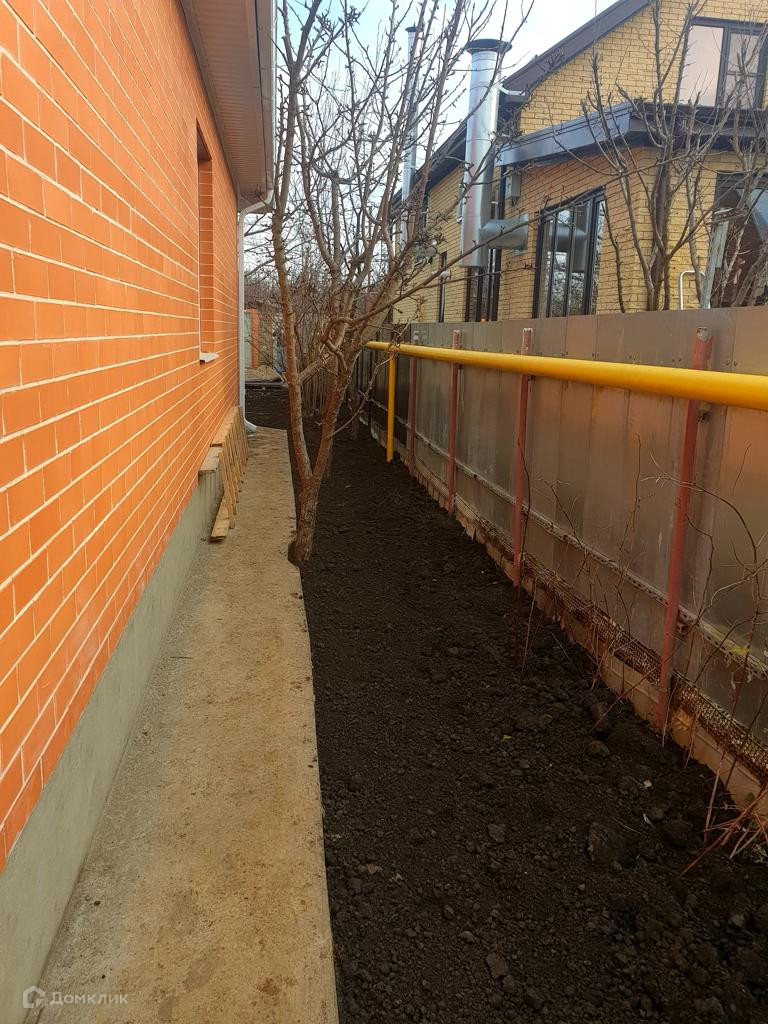 Забетонированные тропинки и парковка под машину. В саду растут взрослые фруктовые деревья, которые обеспечат отдых в тени летом.