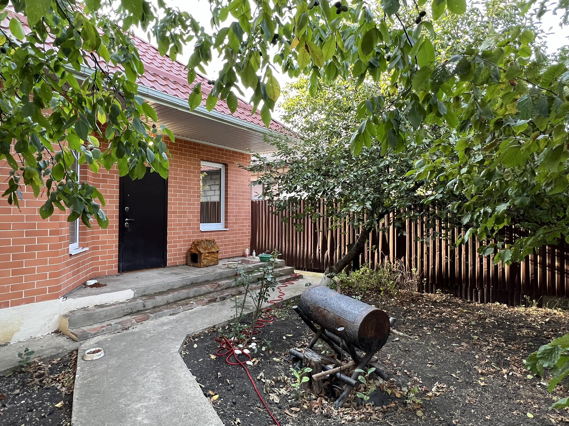 На участке плодовые деревья и кустарники: яблони, груши, вишня, черешня, айва, грецкий орех и фундук, так же есть малина, крыжовник и смородина.